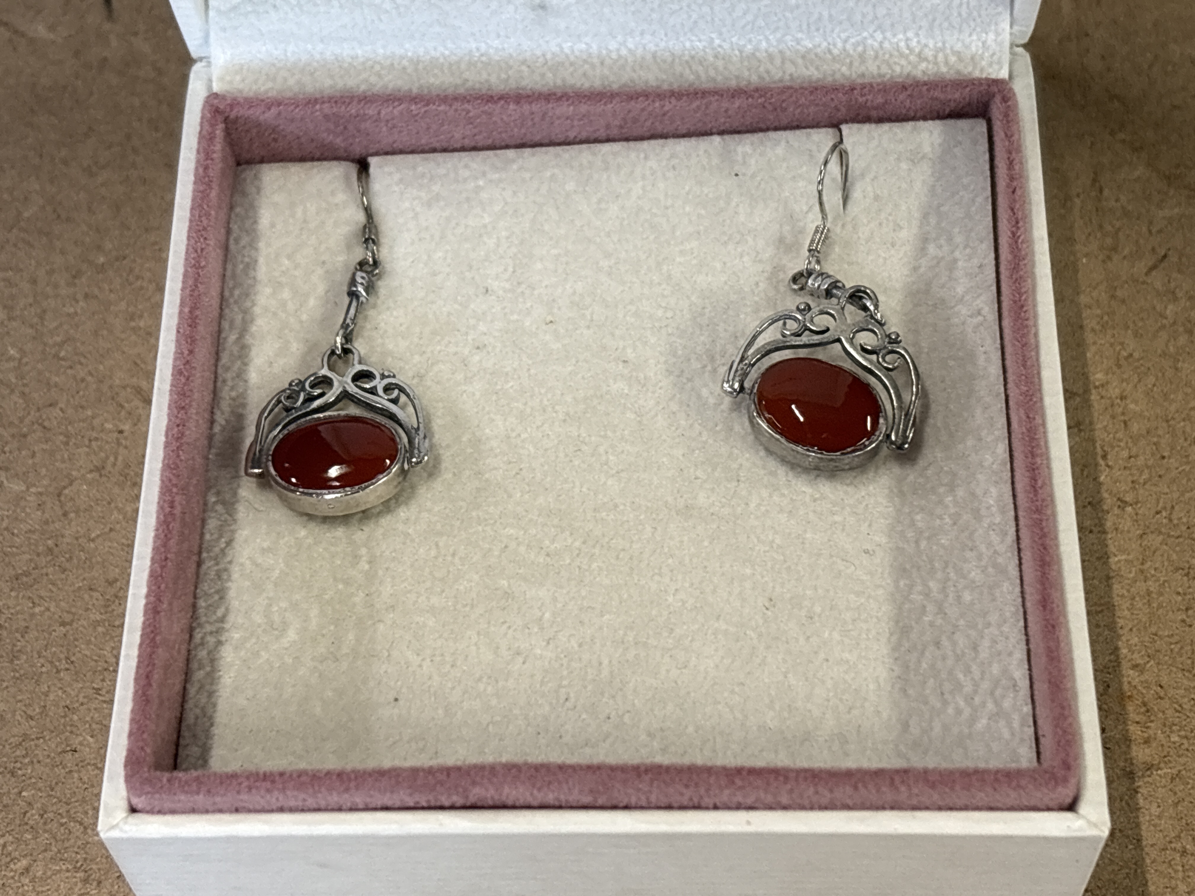 A pair of sterling silver fob earrings featuring reversible oval-shaped red and green stones set within decorative scrollwork spinner mounts.