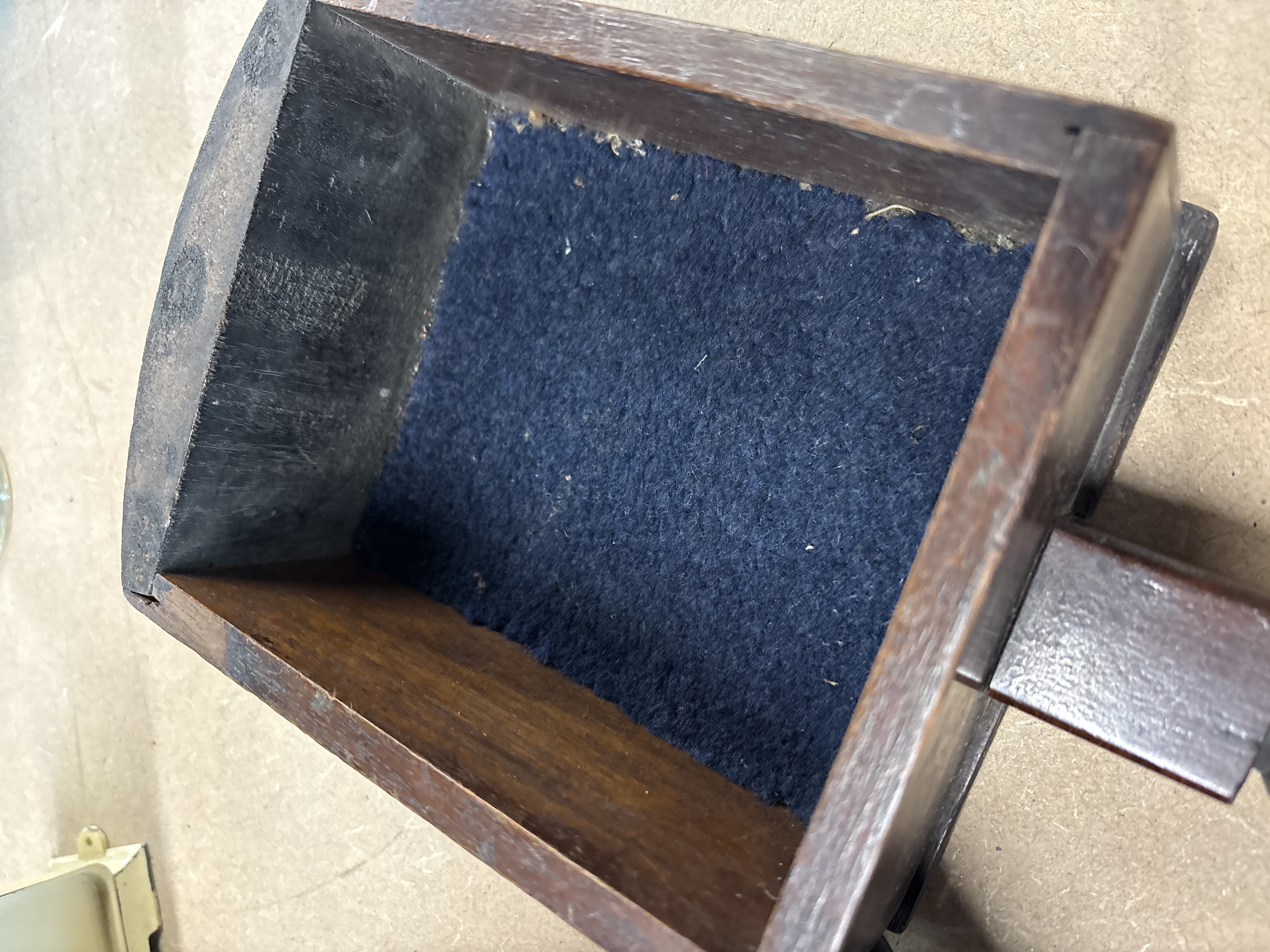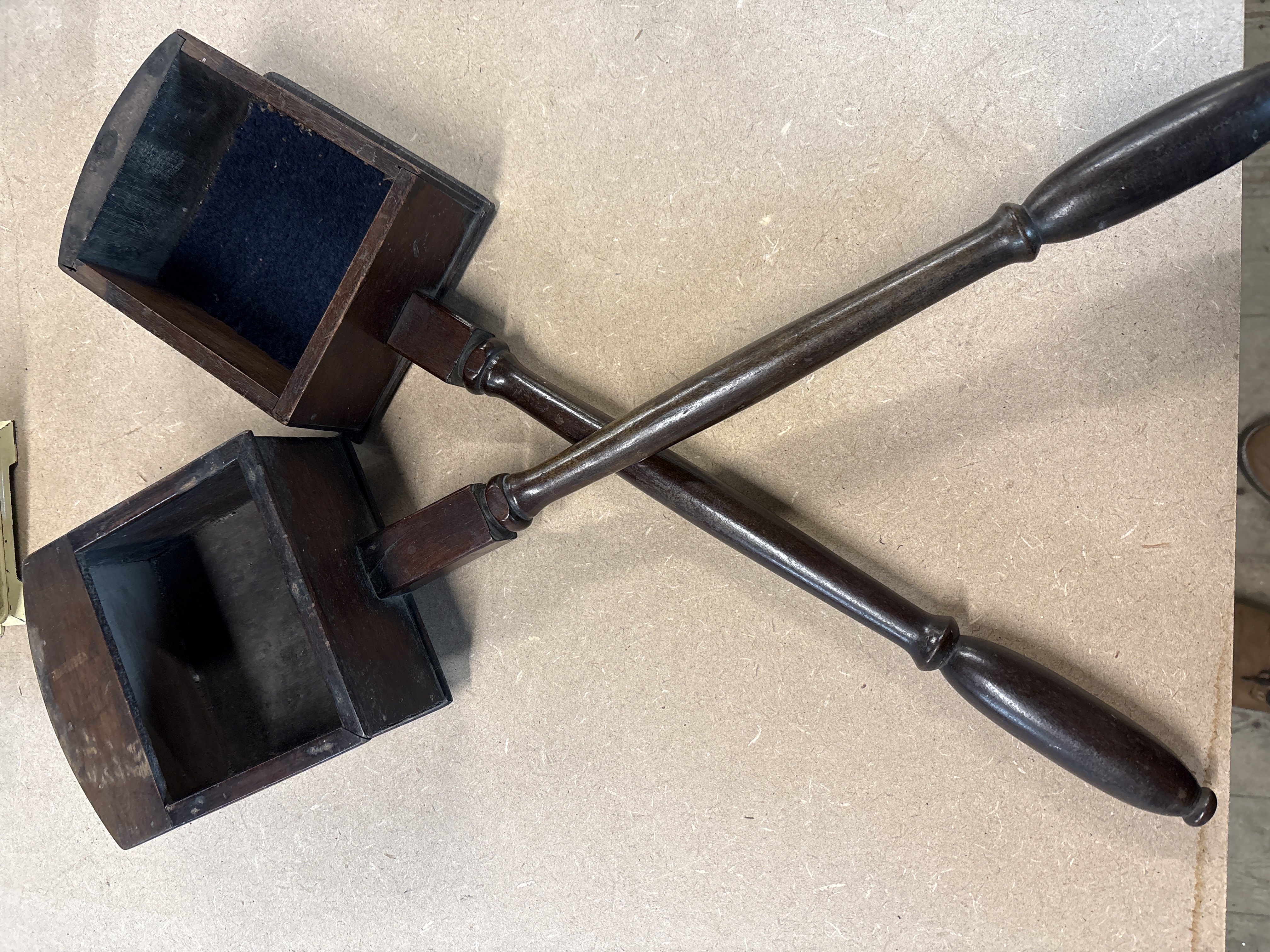 A pair of dark brown wood church offering collection trays featuring long turned handles and one box with a dark blue fabric-lined interior.