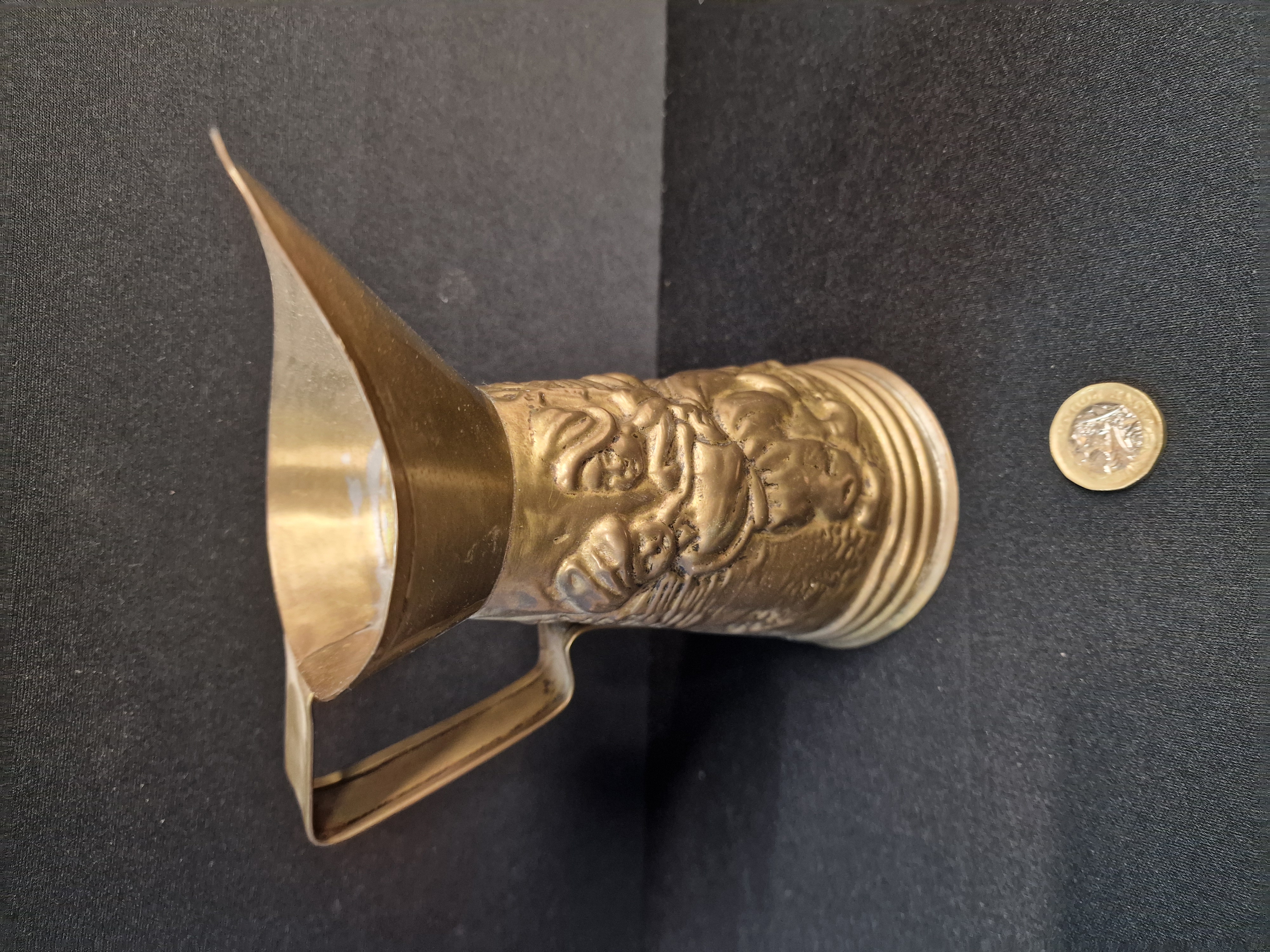 Peerage brass miniature ewer Features a cylindrical body decorated with a high-relief repoussé tavern scene, a flared spout, and an angled strap handle. Approximately 11cm height.