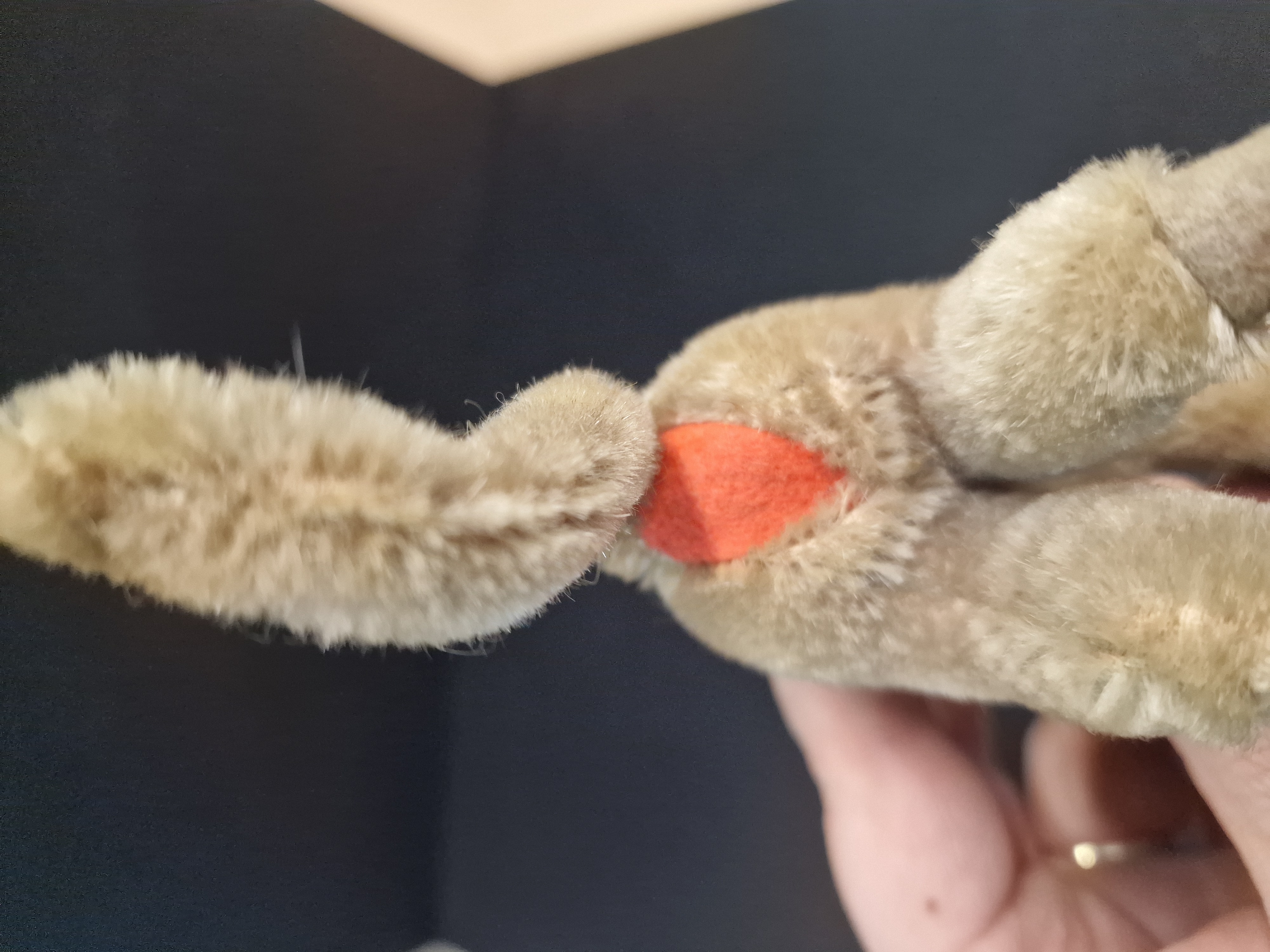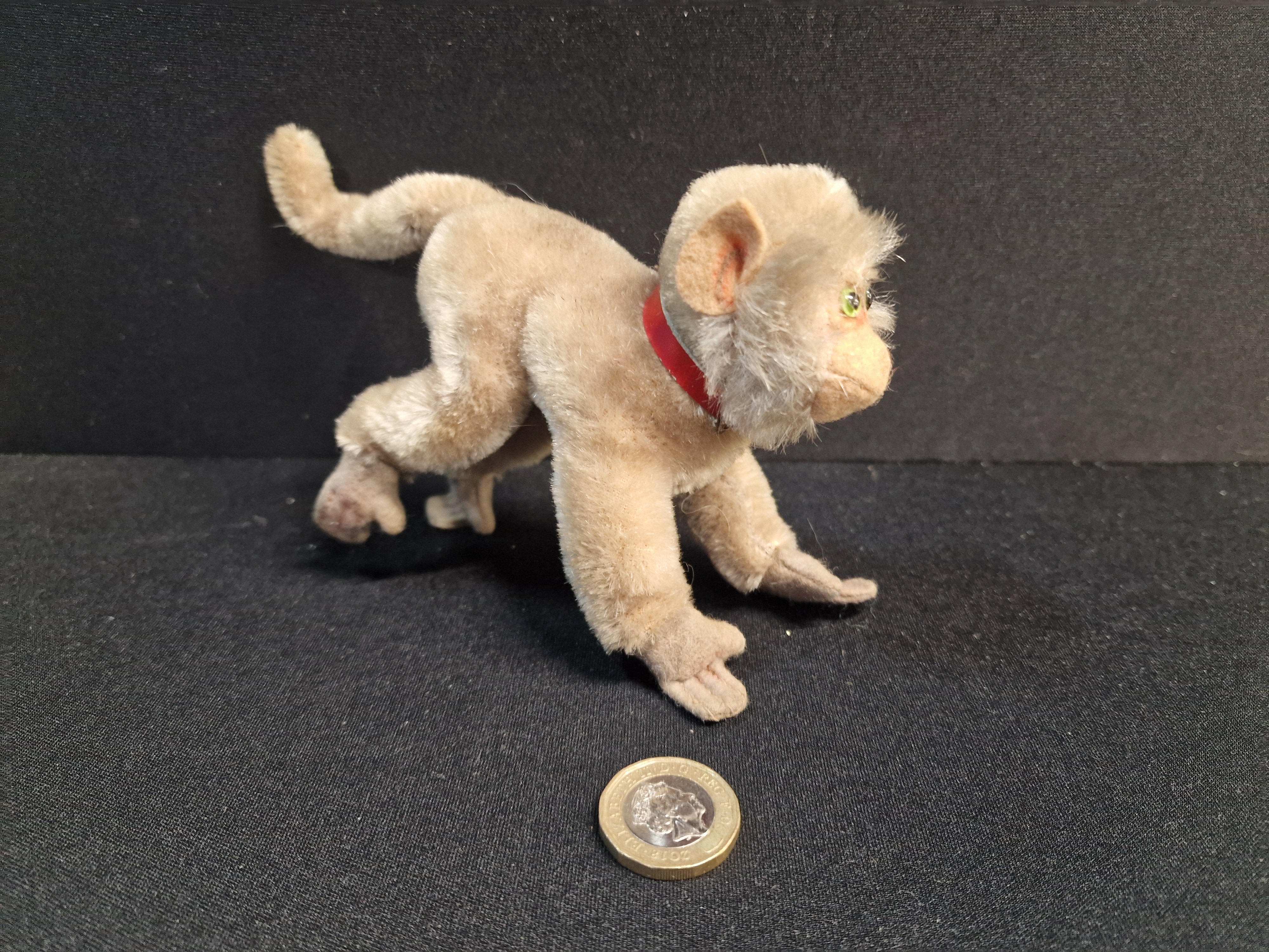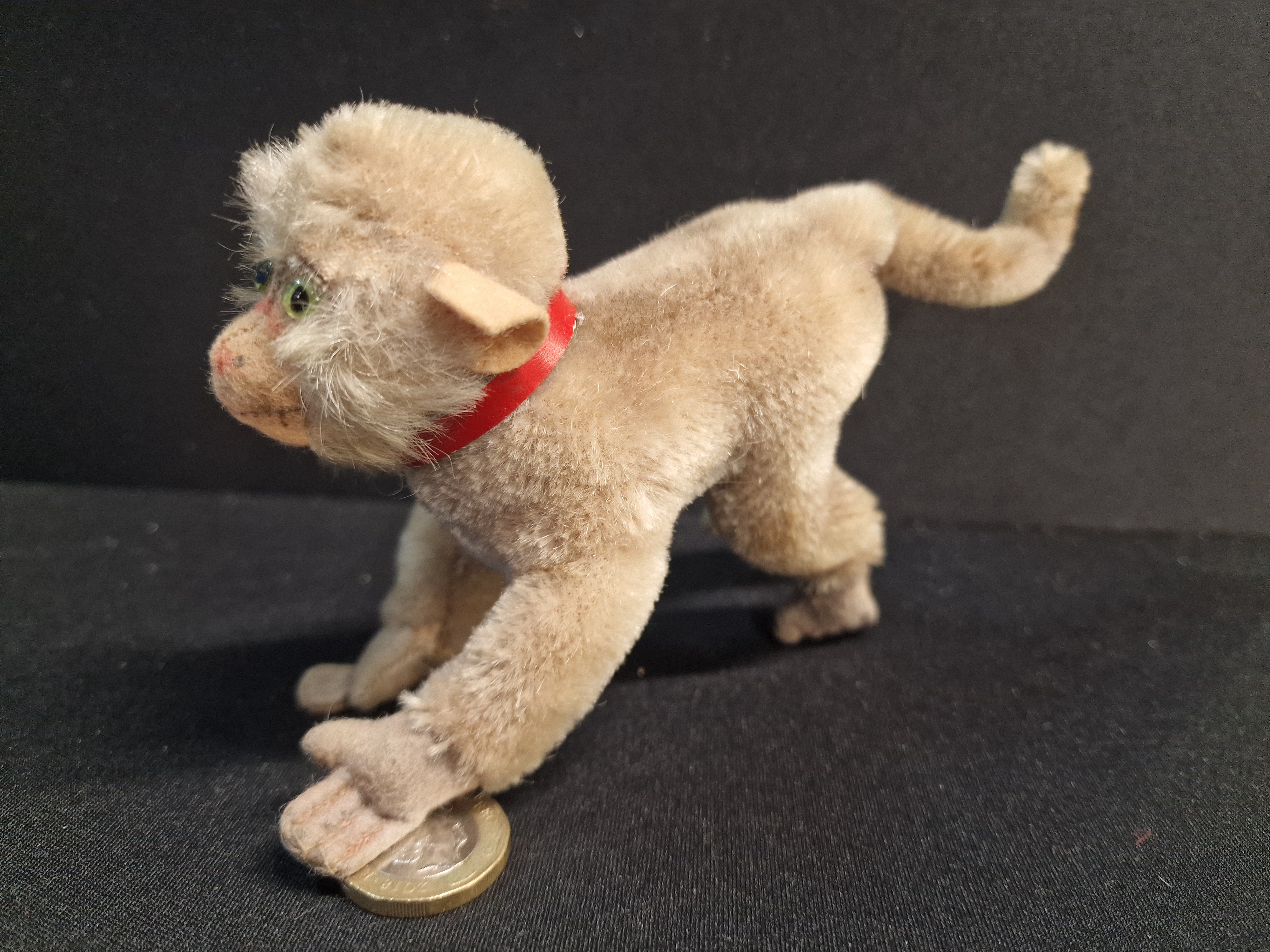Steiff Coco Baboon, circa 1950s-1960s. Constructed from light tan mohair plush with felt ears, hands, and feet, featuring a distinctive red felt patch at the base of the tail and green eyes. Approximately 10cm in height; missing original ear button and identification tags.