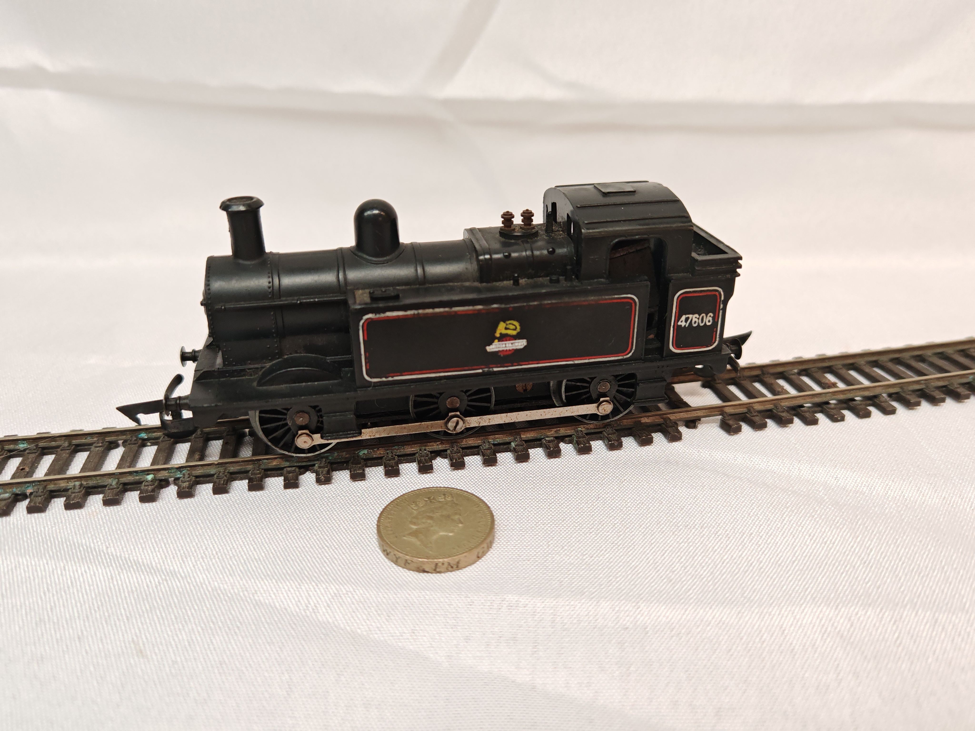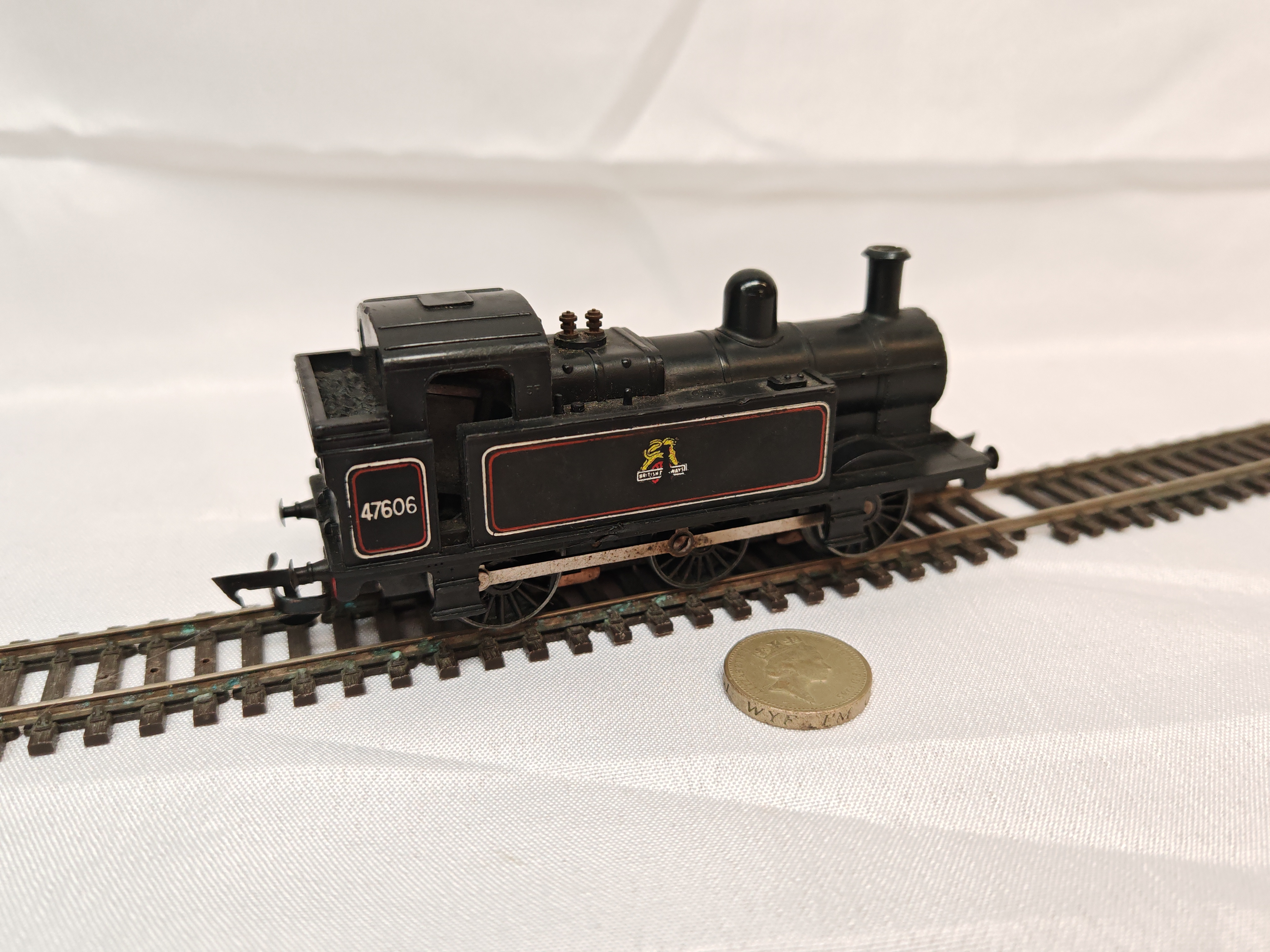 A vintage Tri-ang Hornby R52 OO gauge model steam locomotive, representing the versatile LMS Fowler Class 3F, commonly known as a Jinty. This 0-6-0 tank engine is constructed with a black injection-moulded plastic body mounted on a metal chassis with silver-toned side rods. The model is finished in a British Railways black livery featuring red and white lining. It bears the running number 47606 on the cab and bunker sides, while the water tanks are adorned with the early British Railways Lion and Wheel emblem. This model was a staple of the Tri-ang and Hornby Railways catalogues during the mid-20th century. The locomotive is presented on a short section of vintage two-rail track. Length: approximately 115mm.