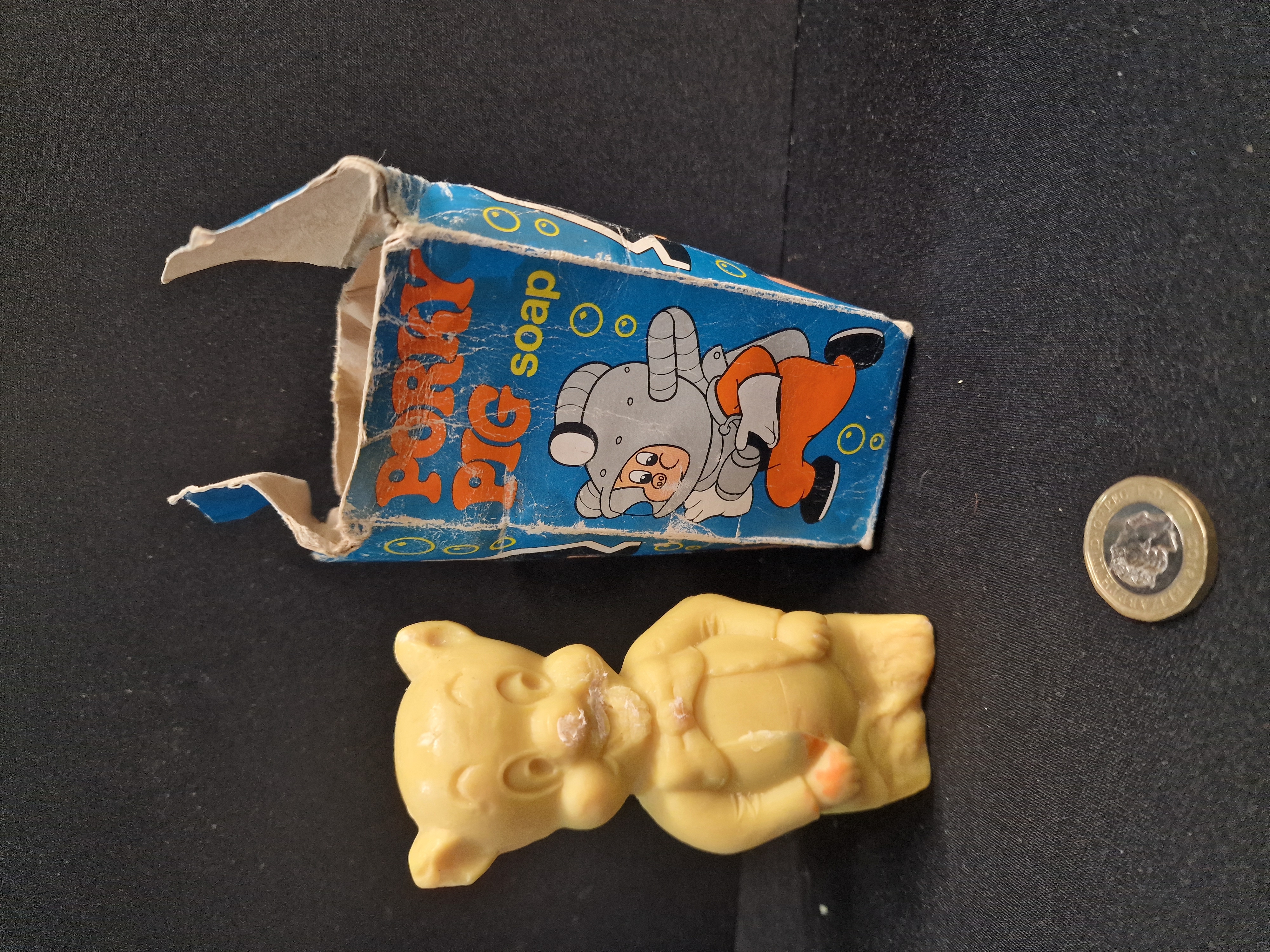Novelty character soap, Warner Bros. license, circa 1960s. Moulded yellow soap figurine accompanied by original illustrated cardboard packaging featuring space-themed graphics. Soap measures approximately 80mm in height.