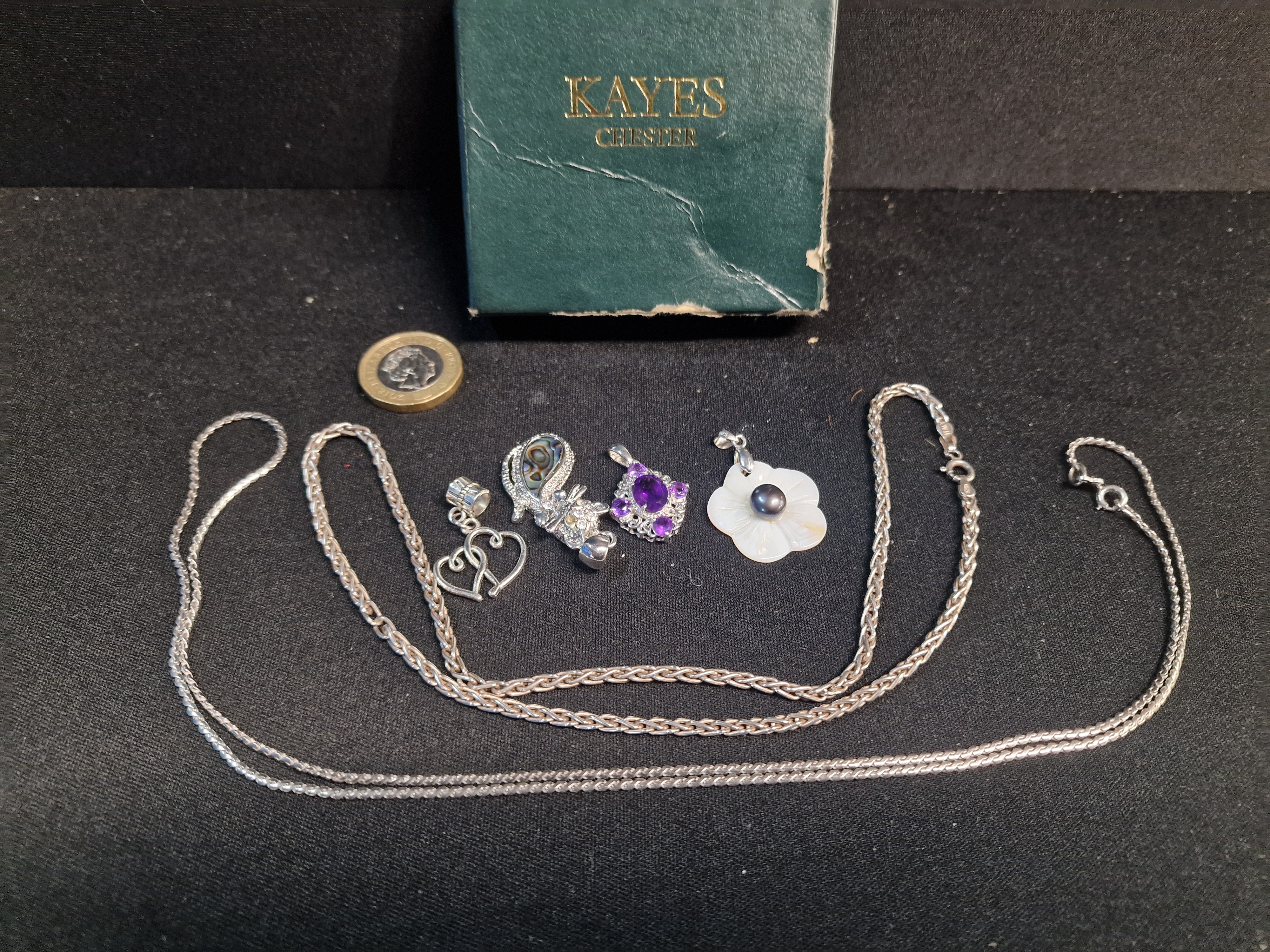 Assorted silver-toned jewellery lot comprising a fine twist link chain and a heavier rope link chain, accompanied by four pendants including a purple gemstone cluster, abalone shell inlay, and carved mother-of-pearl flower. Metal appears to be silver-toned with illegible stamps to bails and clasps; includes a green Kayes Chester presentation box.