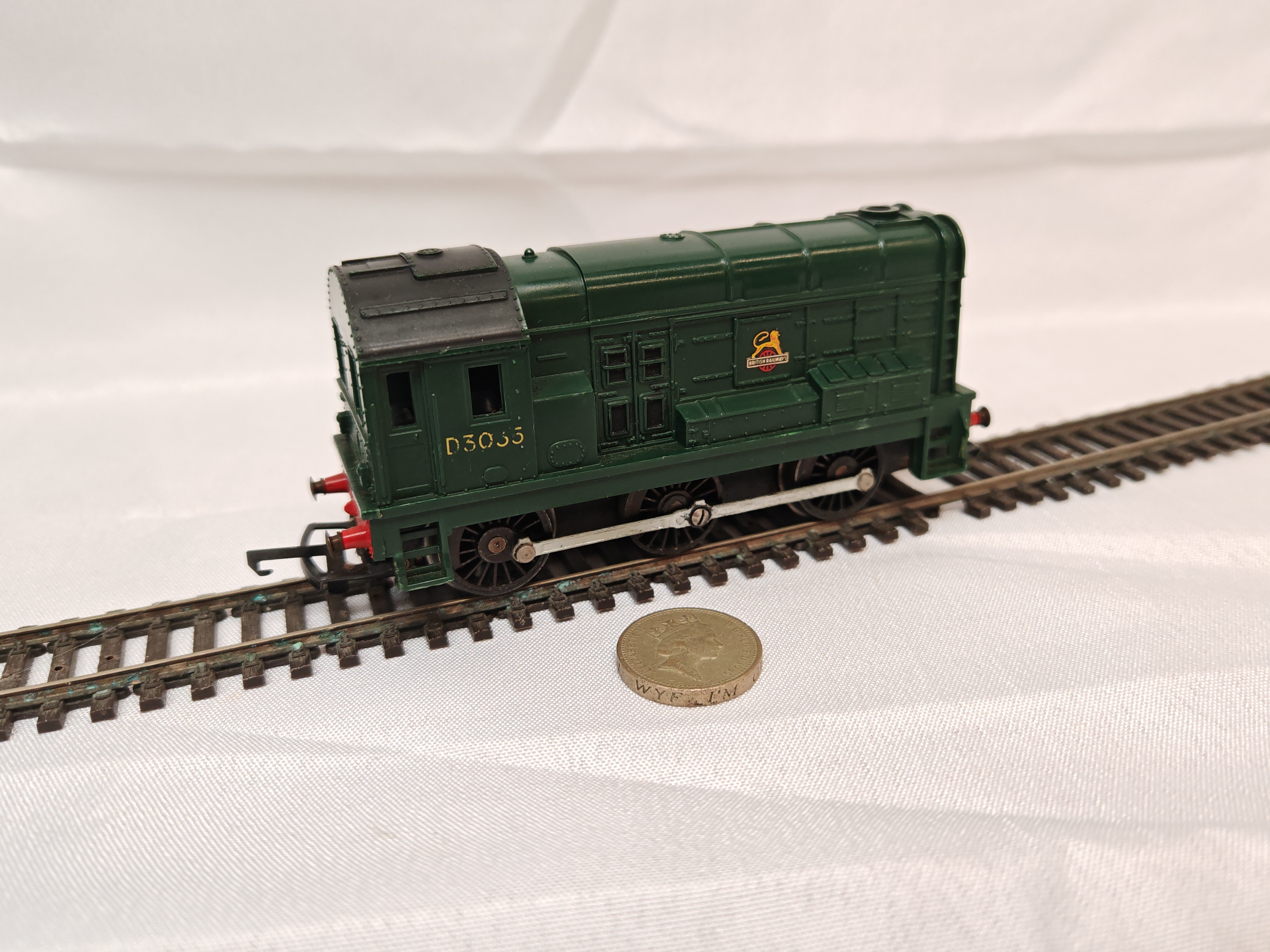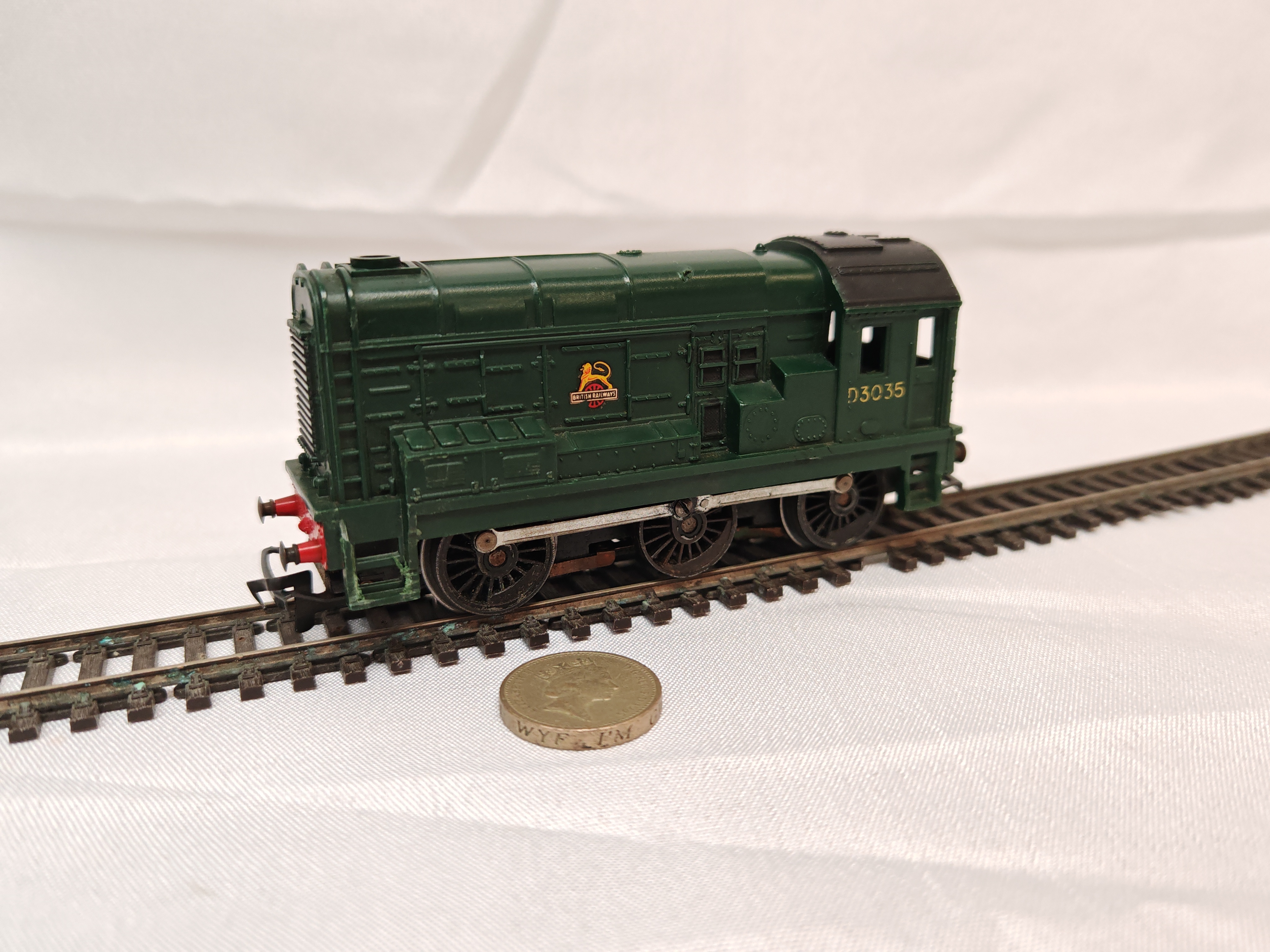A vintage Tri-ang Railways R152 Class 08 0-6-0 diesel shunter locomotive in OO gauge. This model is finished in a traditional British Railways dark green livery with a contrasting black roof and chassis. The cab sides feature the running number D3035 in yellow, while the engine housing displays the British Railways late crest emblem, depicting a lion holding a locomotive wheel. The construction consists of a detailed moulded plastic body mounted on a heavy die-cast metal chassis, fitted with metal wheels and functional connecting rods. Produced by Lines Bros Ltd under the Tri-ang Railways brand, this model was a popular representation of the standard UK diesel-electric shunter during the mid-20th century. Length approximately 110mm.