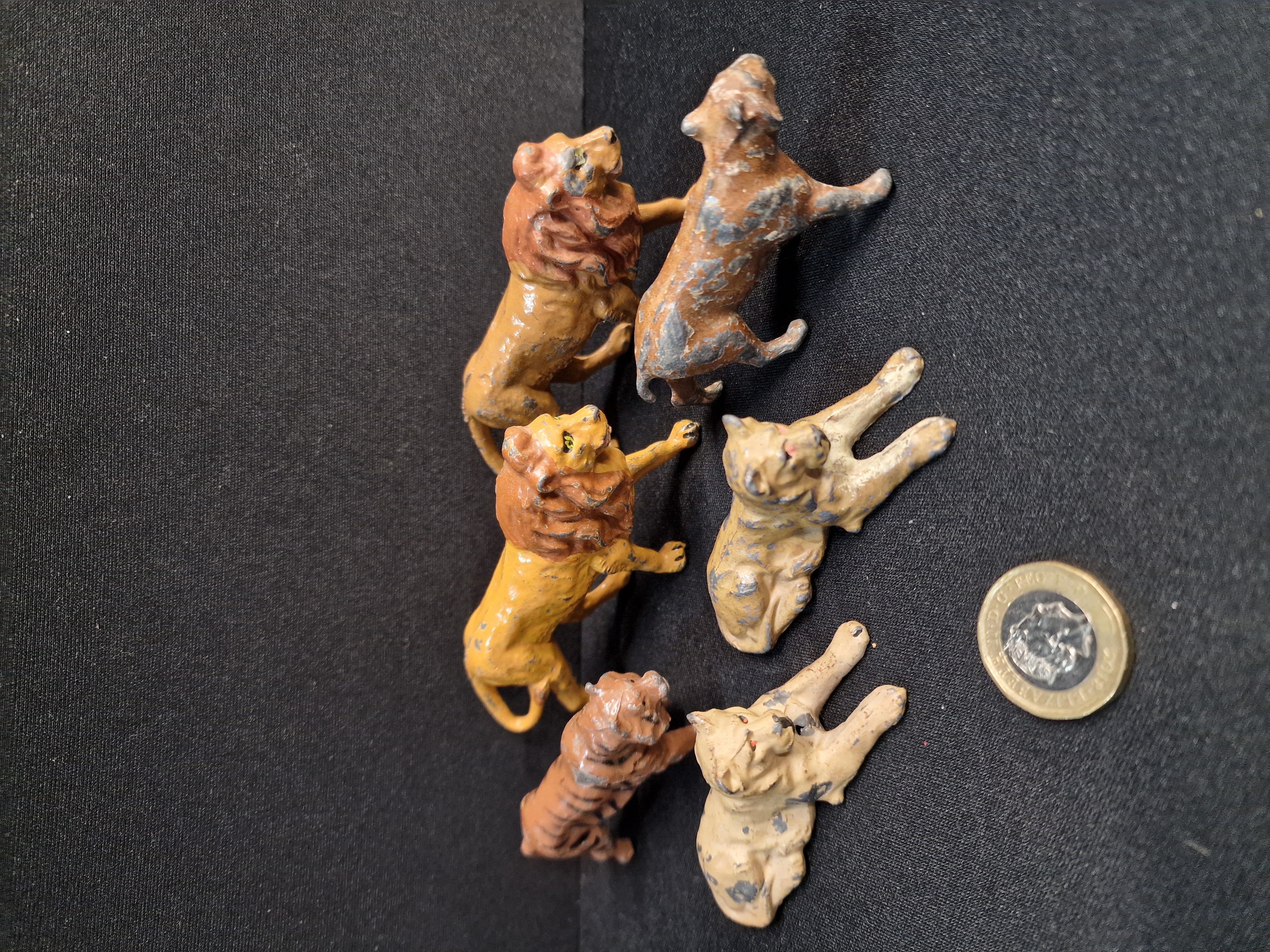 Collection of six hollow-cast lead alloy zoo figurines including rearing lions and reclining tigers, likely manufactured by Britains Ltd. Polychrome painted finish in tawny and striped patterns. Dimensions approximately 40mm to 60mm in length.