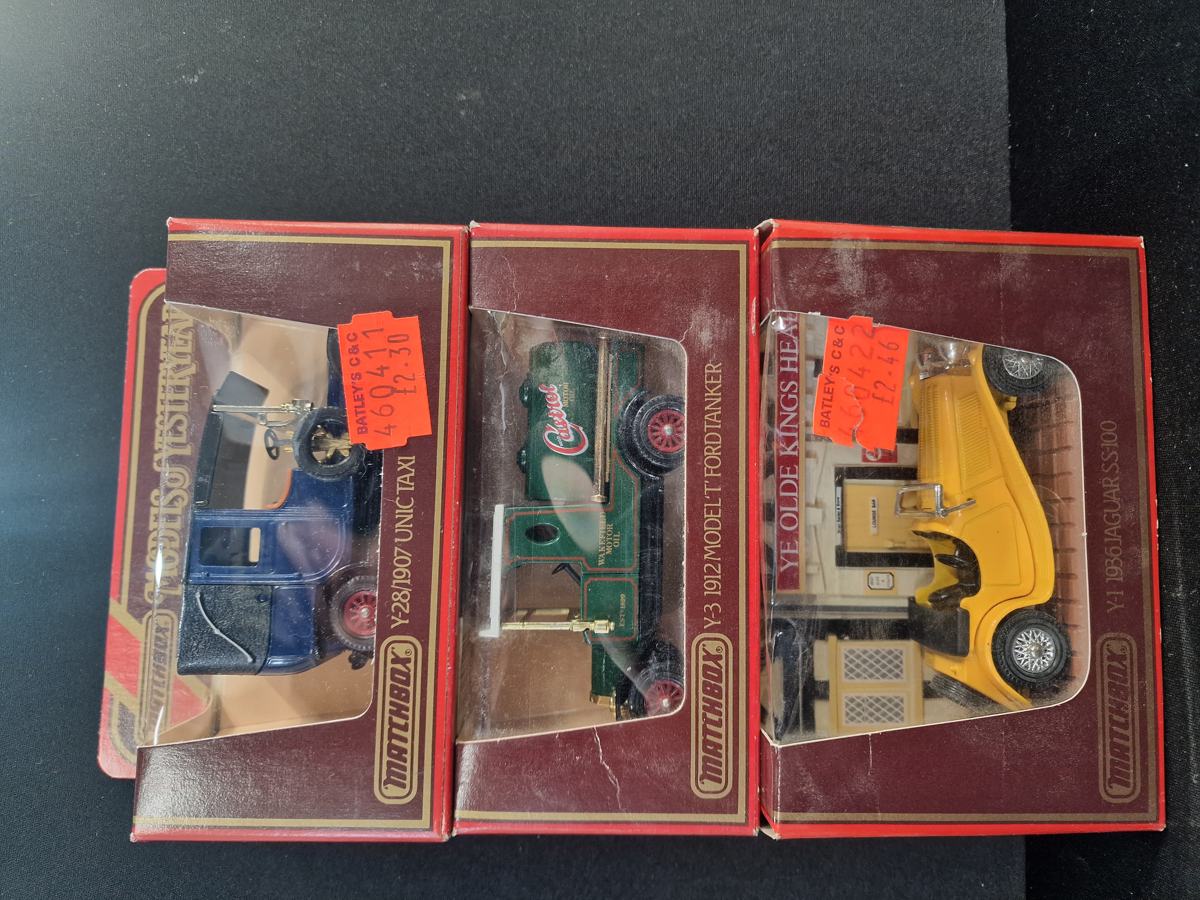 Three scale vehicles, Matchbox, circa 1980s. Die-cast metal and plastic construction comprising Y-1 Jaguar SS-100, Y-3 Ford Tanker, and Y-28 Unic Taxi. Housed in original maroon and gold window boxes.