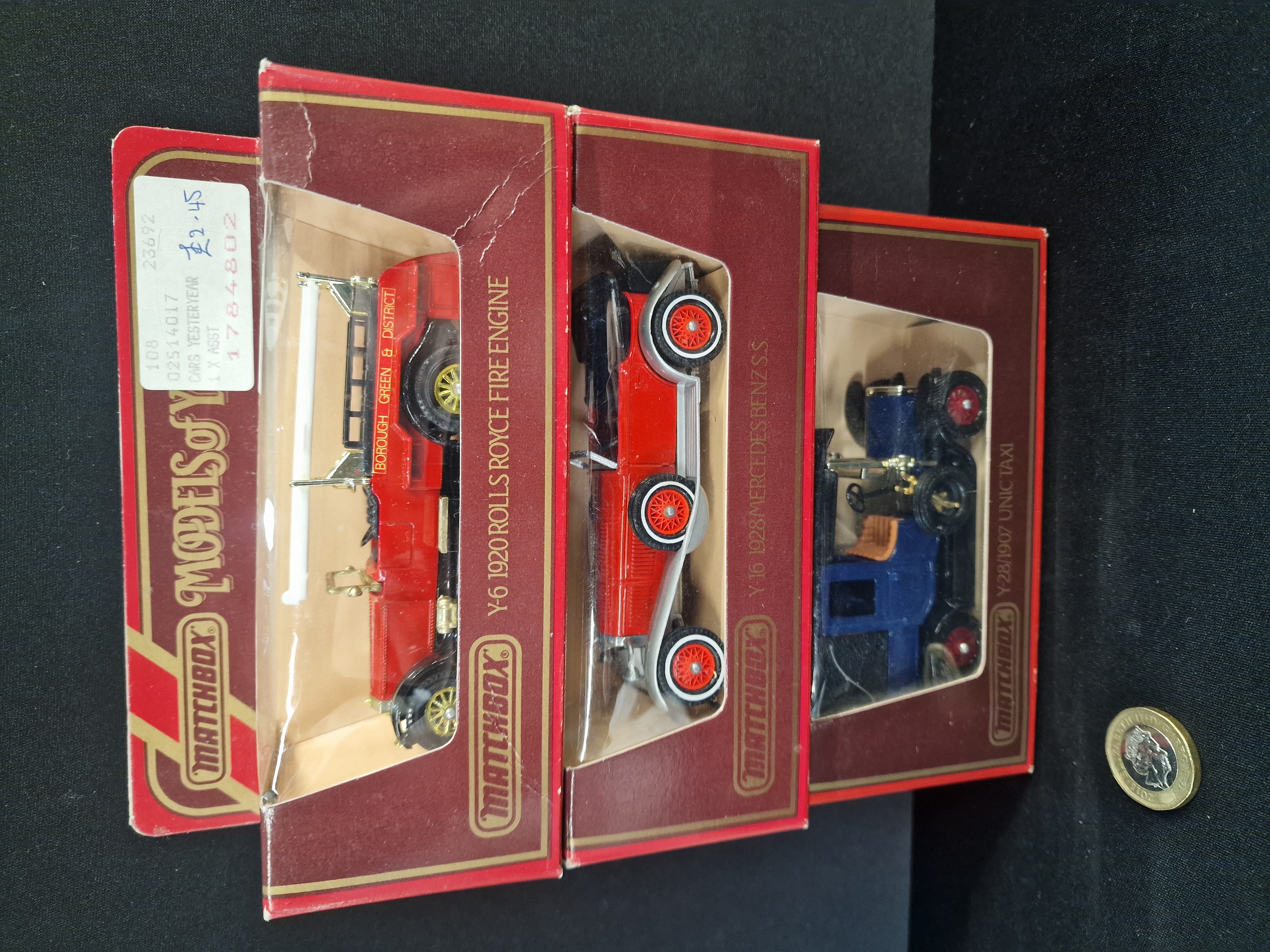 A collection of boxed Matchbox Models of Yesteryear die-cast vehicles including a Y-6 1920 Rolls Royce Fire Engine, Y-16 1928 Mercedes Benz SS, and Y-28 1907 Unic Taxi.