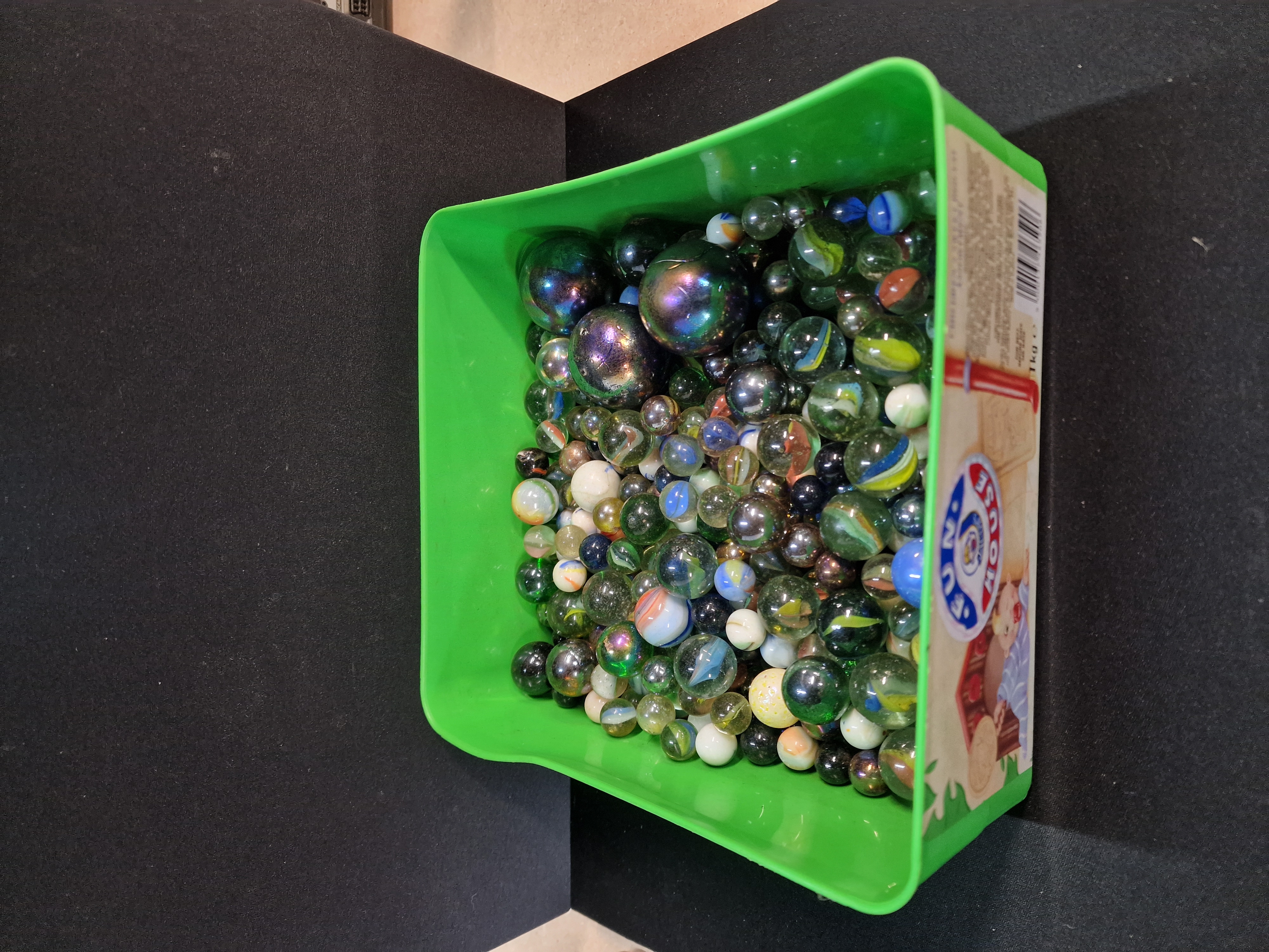 Large assortment of glass marbles featuring various patterns such as cat’s eyes, swirls, and solid colours. Includes several oversized shooters with iridescent metallic finishes.