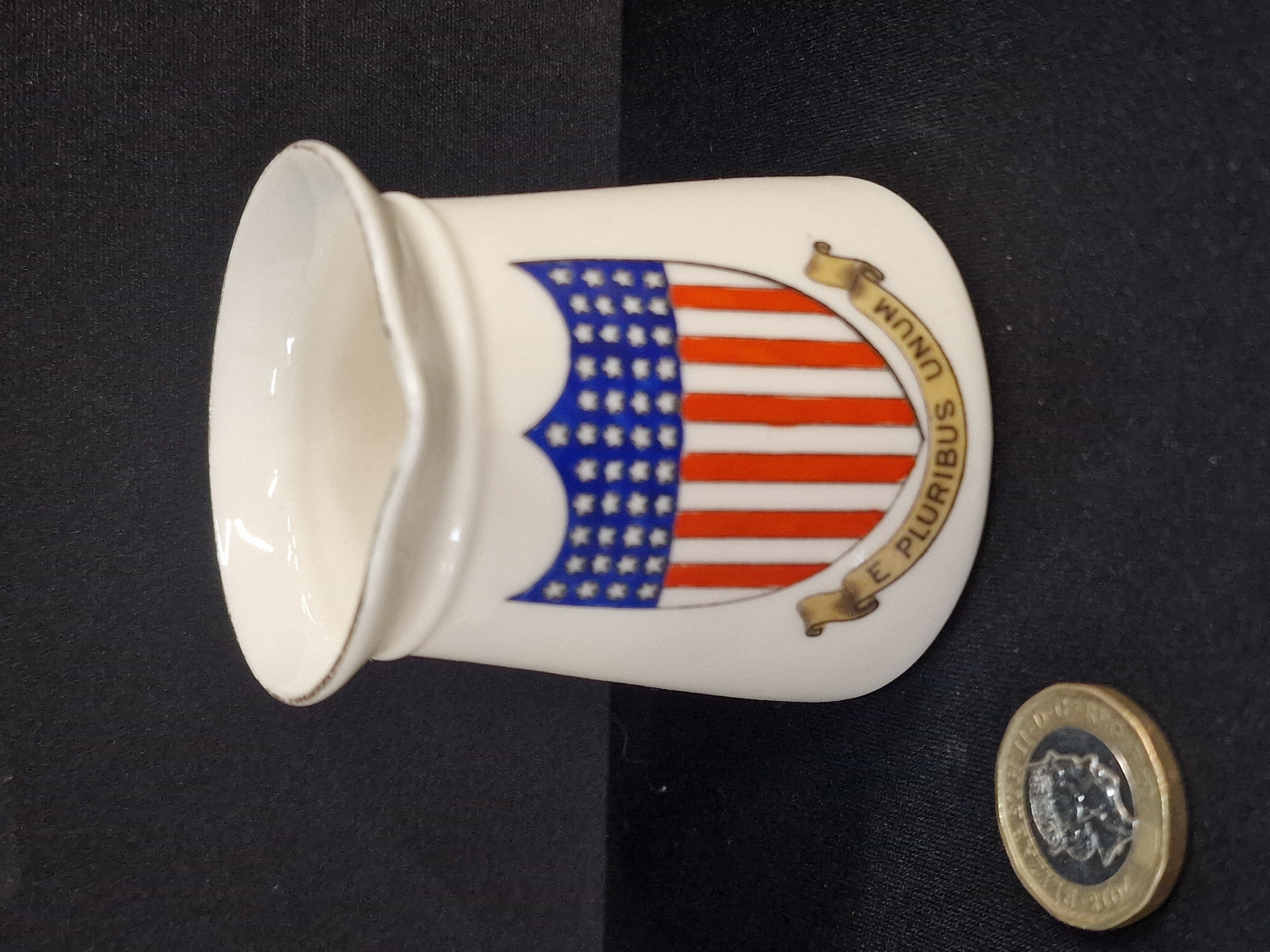 A WH Goss miniature porcelain creamer, circa 1900. The white glazed body is decorated with a transfer-printed patriotic crest featuring a United States shield and banner inscribed “E PLURIBUS UNUM” beneath a gilt-lined rim. Approximately 5cm H.