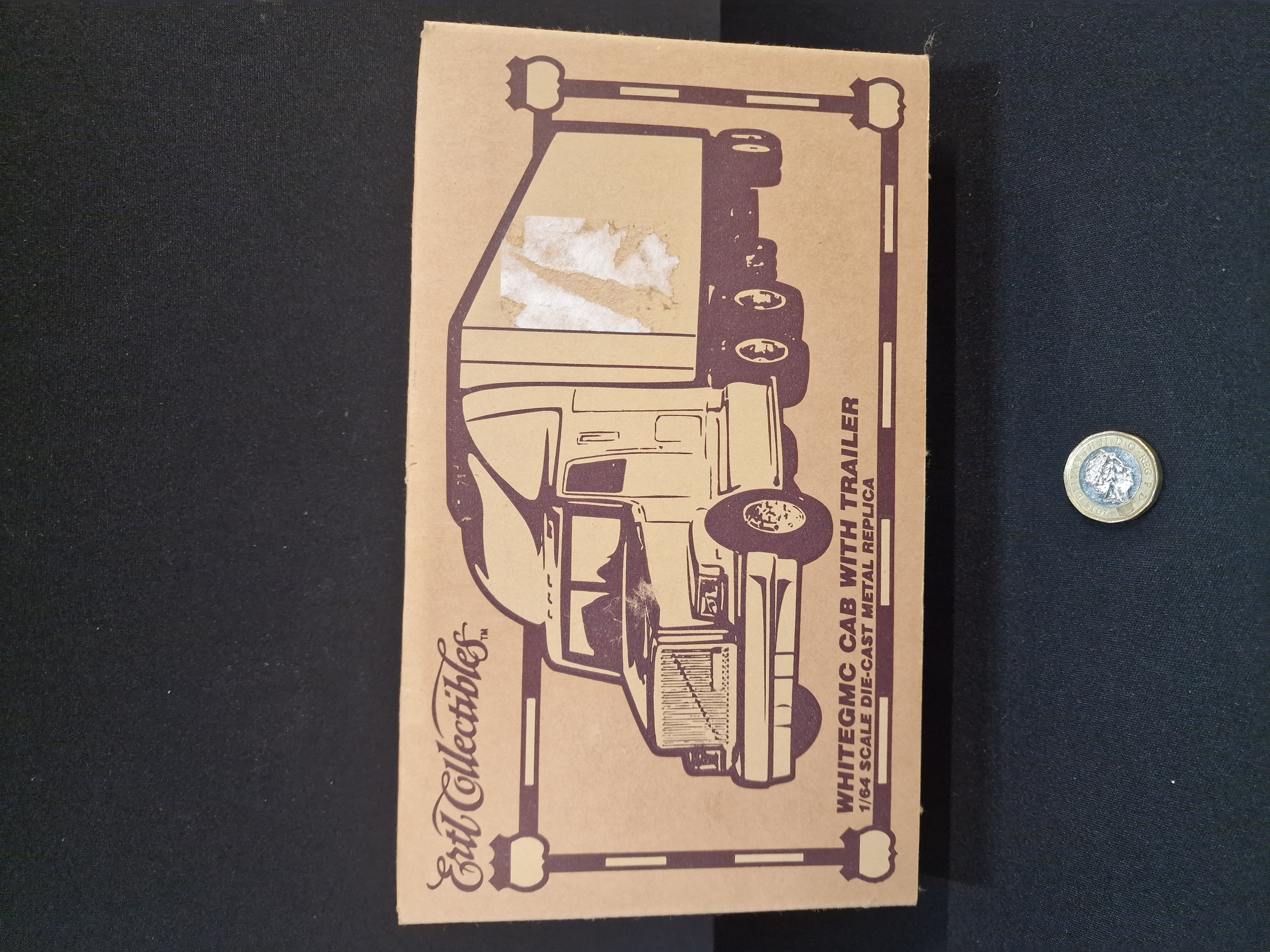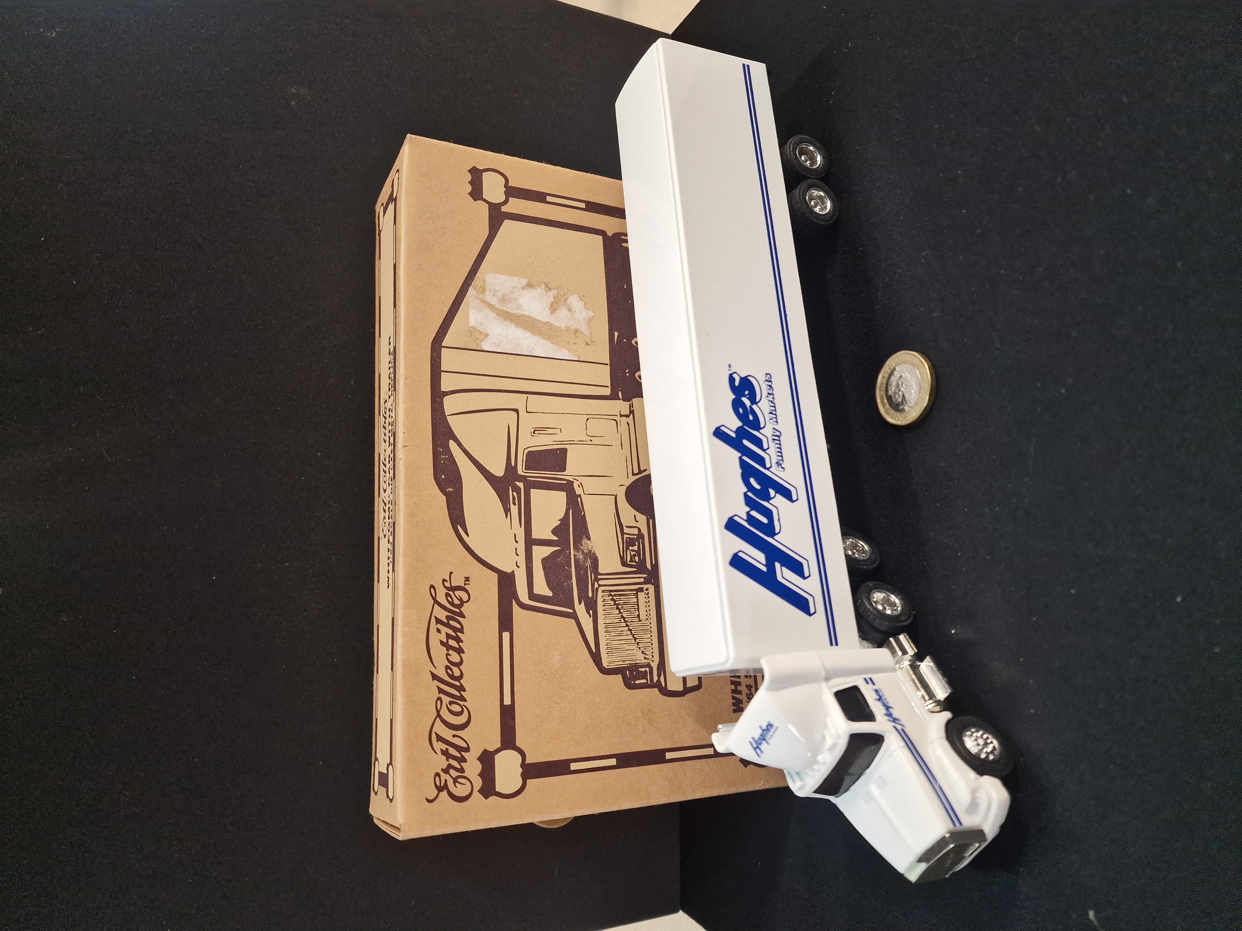 Ertl Collectibles 1/64 scale die-cast metal replica of a WhiteGMC cab with detachable trailer in Hughes Family Markets livery, associated with WH Goss. The model features free-rolling wheels and is accompanied by its original illustrated cardboard box.
