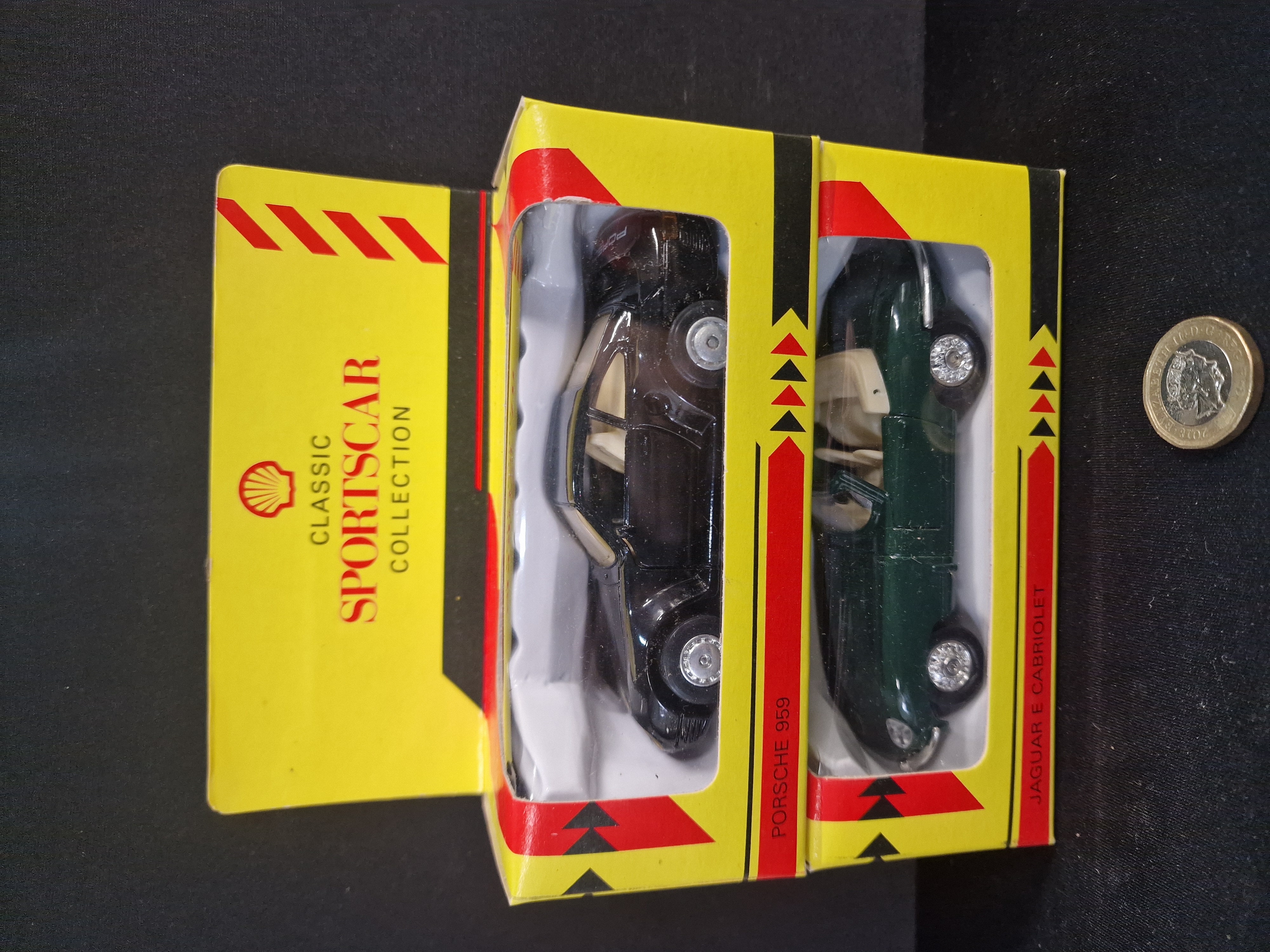 A pair of die-cast model for the Shell Classic Sportscar Collection, comprising a black Porsche 959 and a British Racing Green Jaguar E Cabriolet. Both vehicles feature plastic interiors and free-rolling wheels, presented in their original yellow and red Shell-branded window boxes.