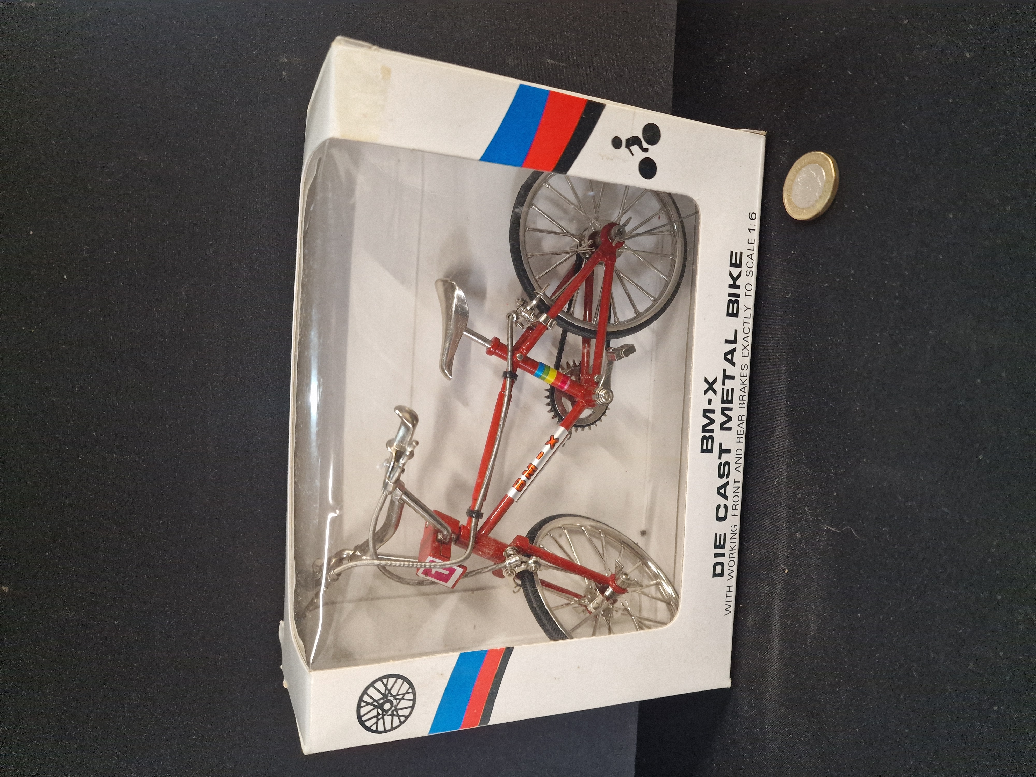 BM-X 1:6 scale die-cast metal model bicycle, circa 1980s. Features a red frame, chrome-finished components, and functional scale brakes, housed in the original window display box. Box dimensions approximately 25cm x 18cm.
