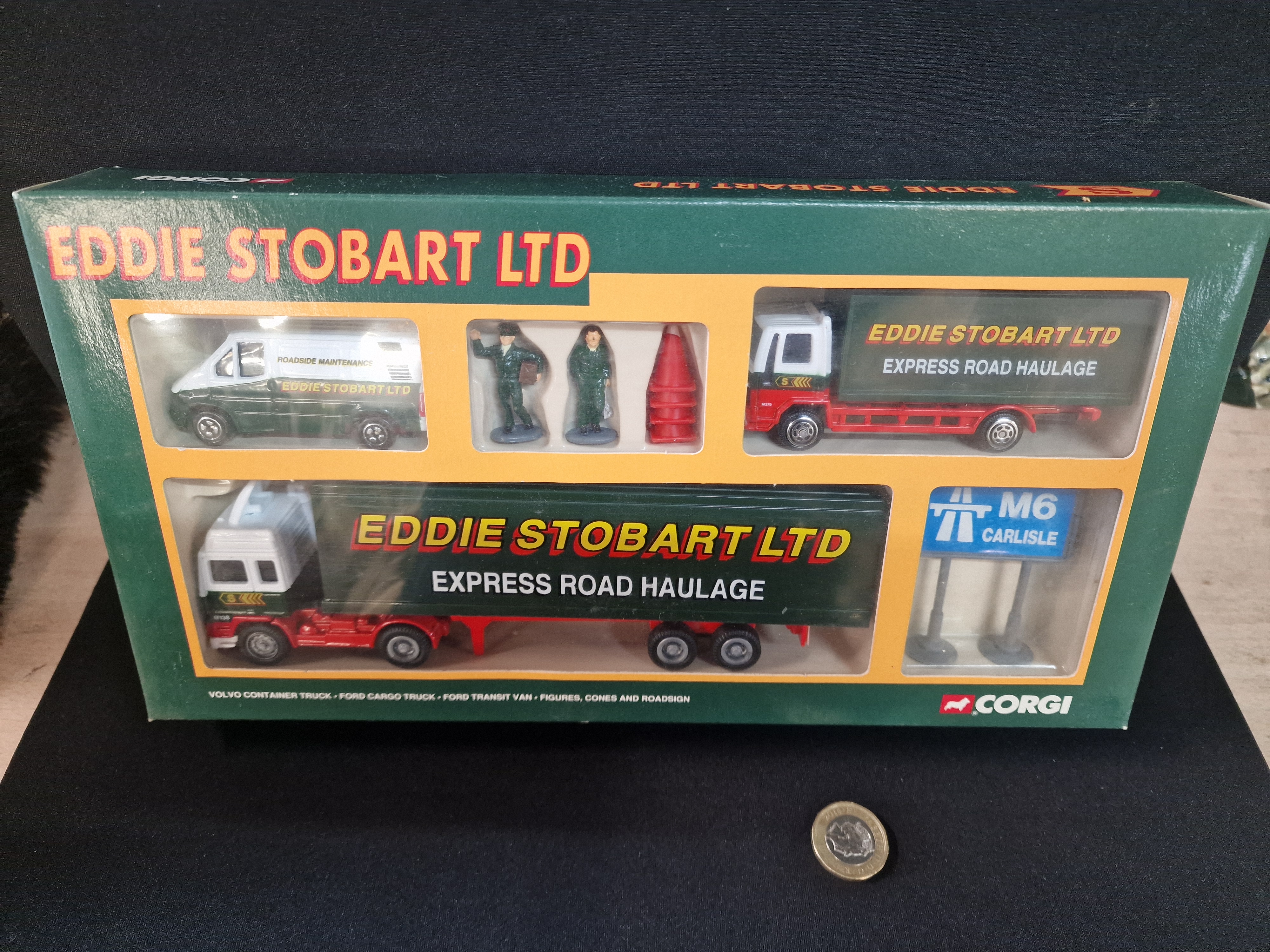 Die-cast vehicle set by Corgi in Eddie Stobart livery, including a Volvo container truck, Ford Cargo truck, and Ford Transit van. Set features plastic figures, cones, and an M6 Carlisle road sign Box width approximately 30cm.