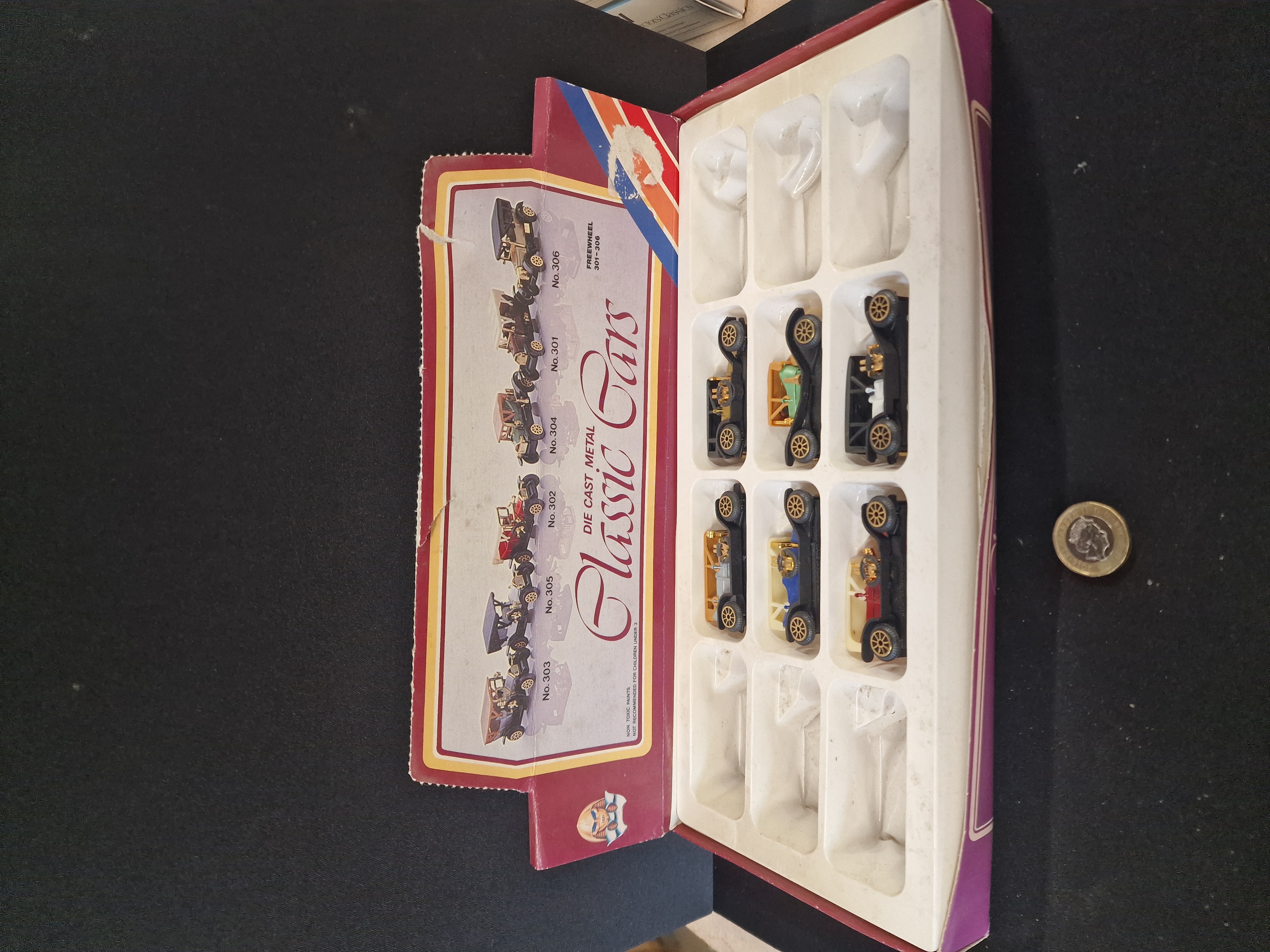 Die-cast metal miniature car set by Freewheel, circa 1980s. Comprising six antique-style models with plastic detailing, housed in the original illustrated retail box. Individual vehicles approximately 40mm in length.