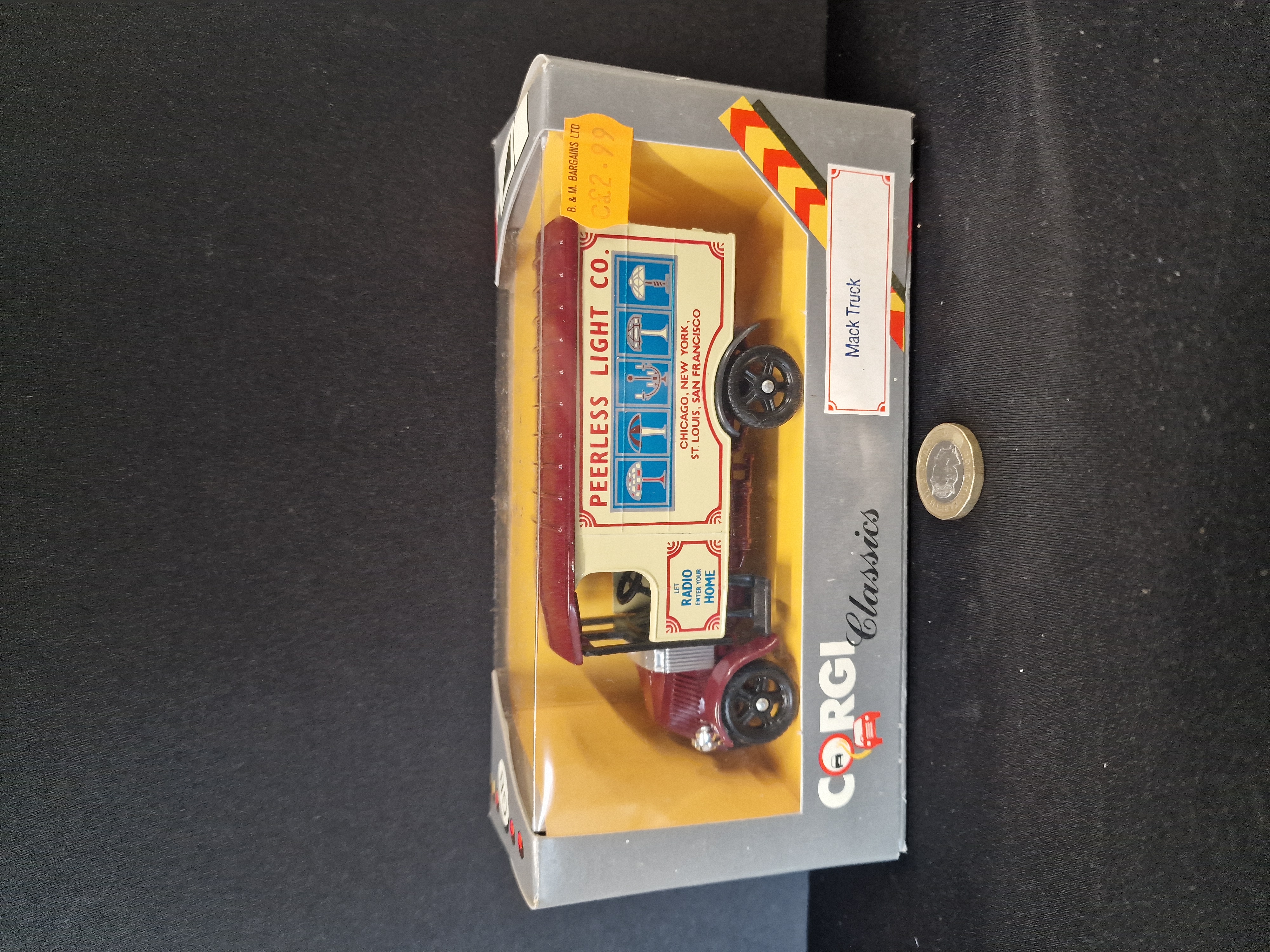 Die-cast Mack Truck, Corgi Classics, circa 1985. Features Peerless Light Co. livery in maroon and cream presented in original window box.