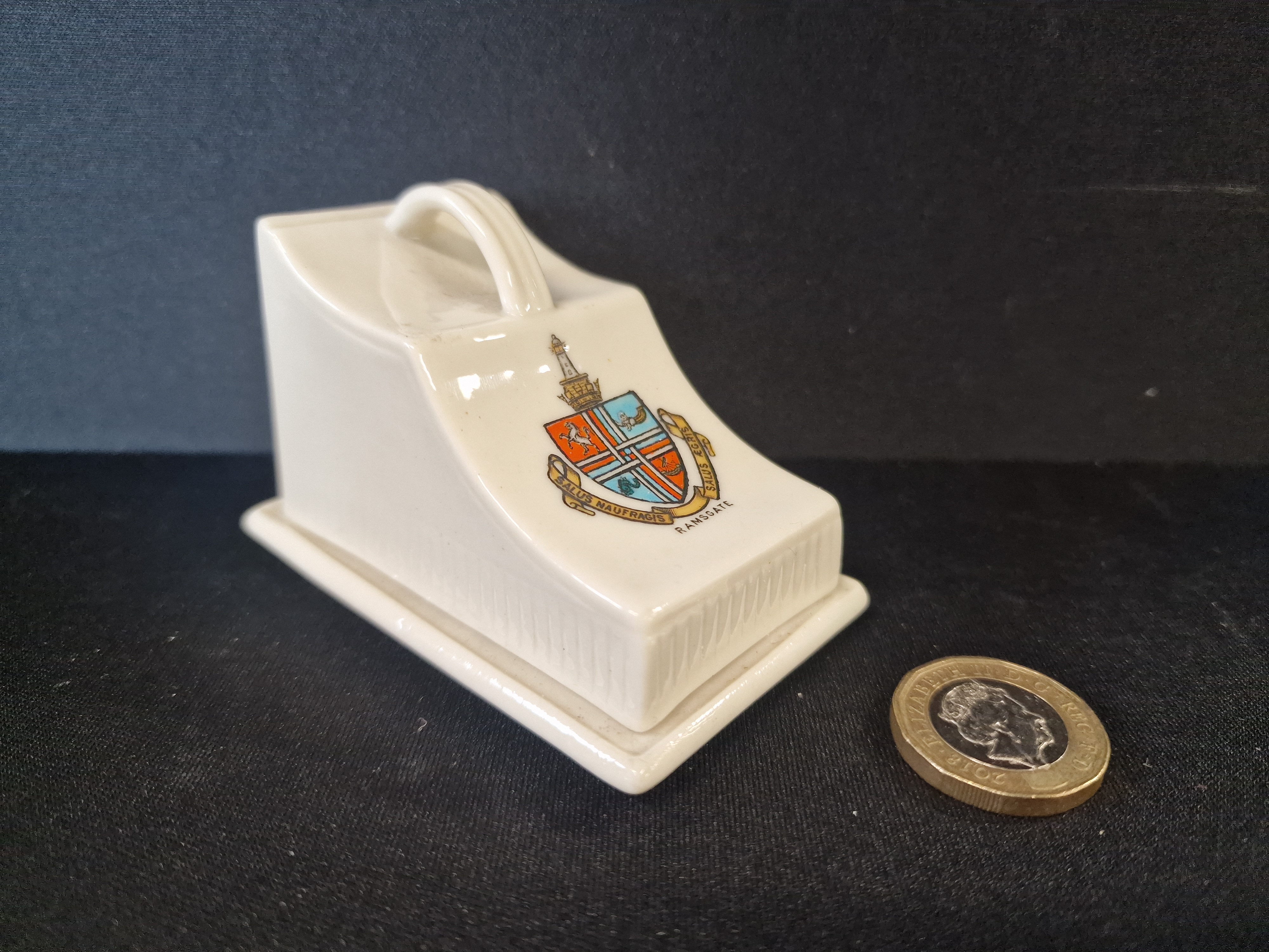 Miniature W.H. Goss glazed ceramic cheese dish and cover, late 19th or early 20th century. The sloped lid features a transfer-printed heraldic crest for Ramsgate with the motto “SALUS NAUFRAGIS SALUS AEGRIS” and vertical fluted moulding. Approximately 7cm L x 5cm H.