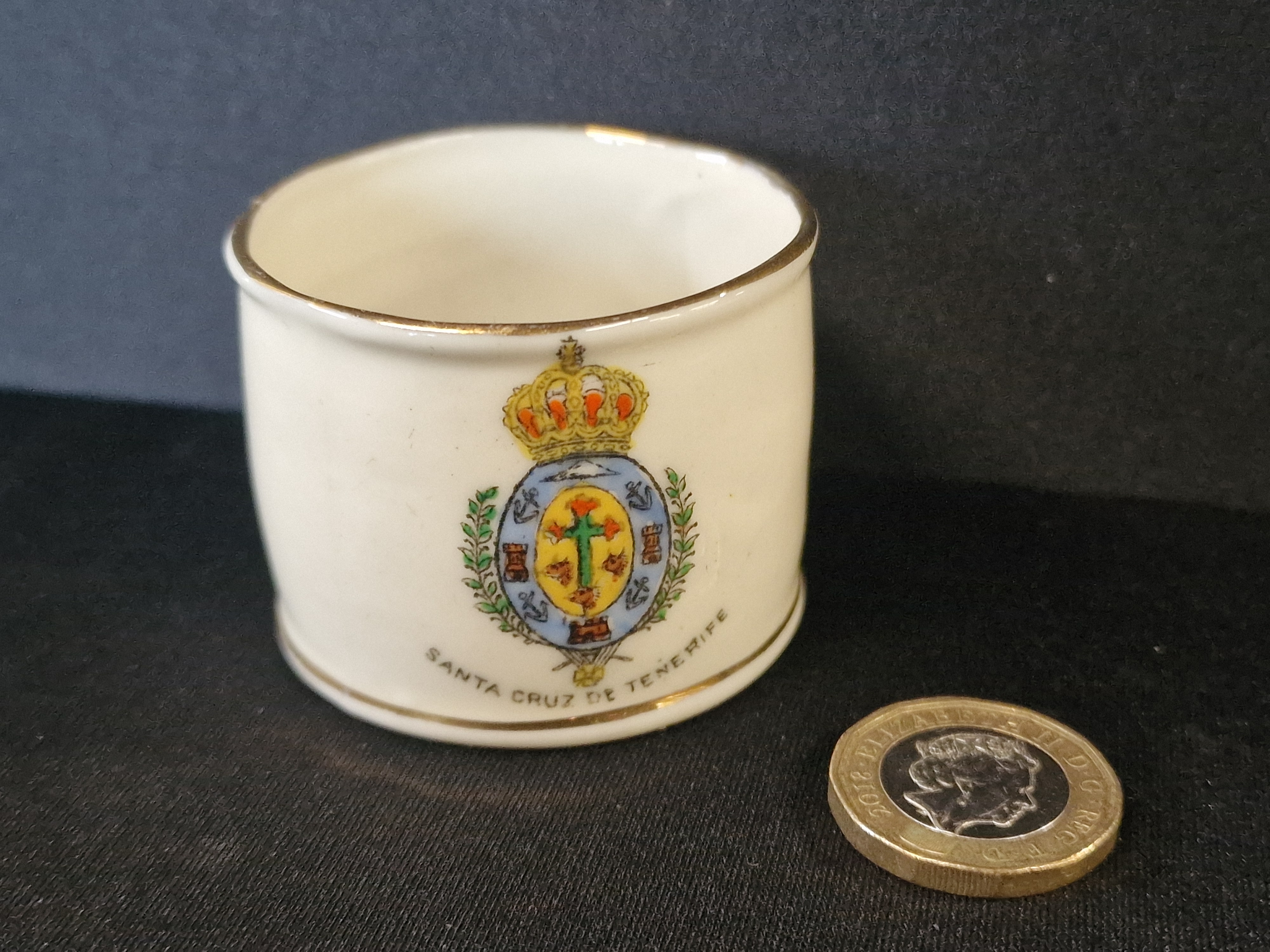 WH Goss porcelain napkin ring of cylindrical form, decorated with a polychrome heraldic crest for Santa Cruz de Tenerife. The white glazed body is finished with fine gilt bands to the upper and lower rims. Approximately 4.5cm diameter.