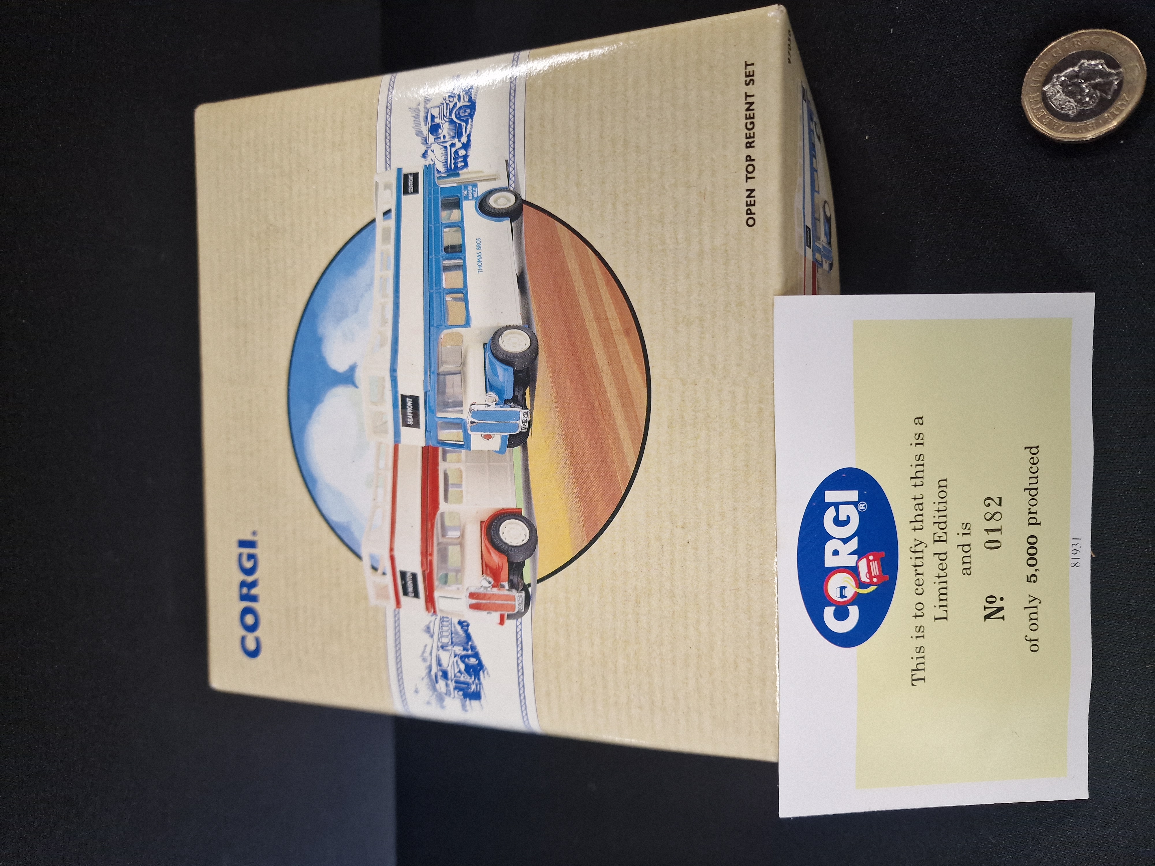 A pair of die-cast AEC Regent buses by Corgi, featuring Thomas Bros and Rhondda liveries . The set is housed in its original illustrated cardboard box and includes Limited Edition certificate number 0182 of 5,000.
