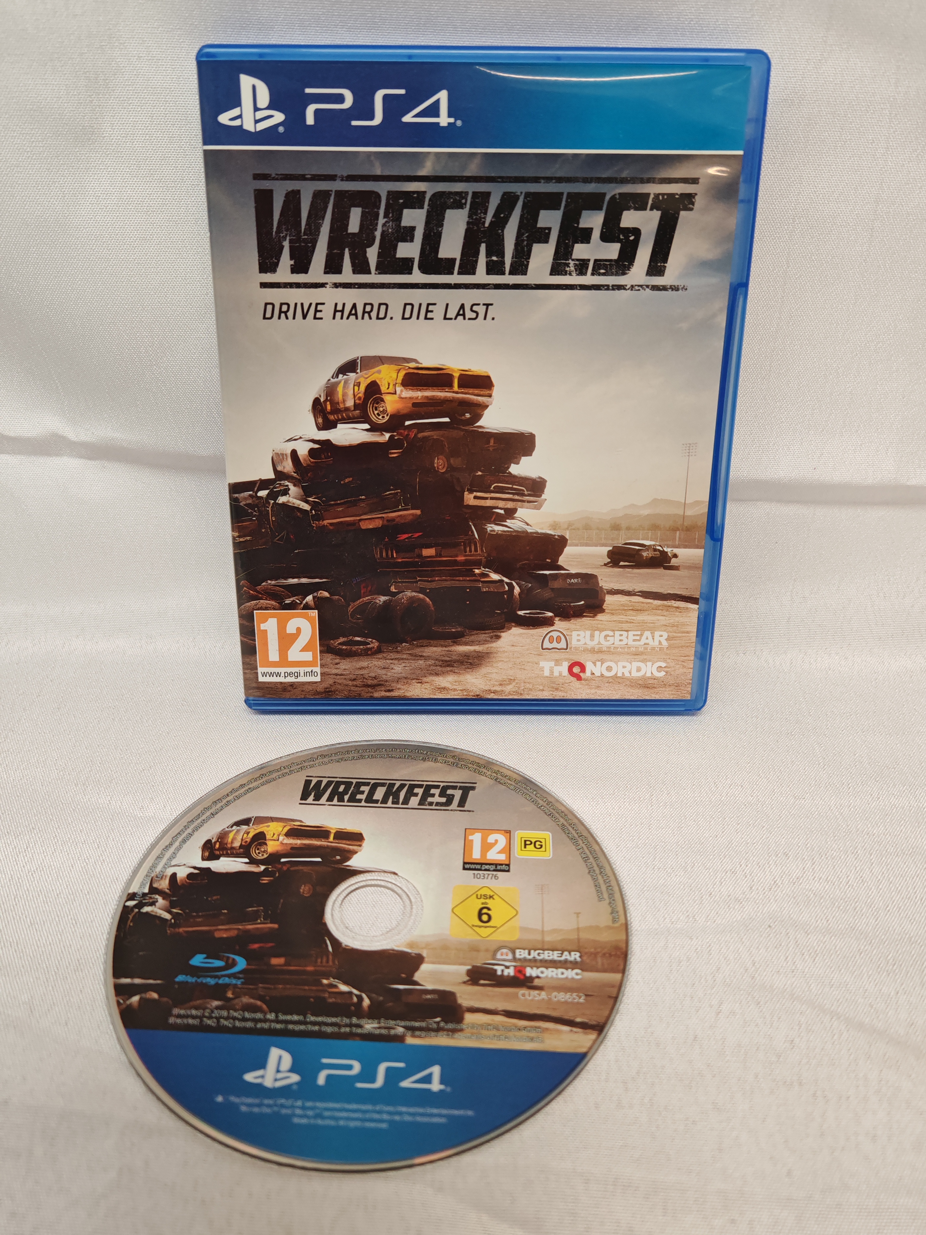 This lot features the demolition derby-themed racing title Wreckfest, developed by Bugbear Entertainment and published by THQ Nordic for the Sony PlayStation 4 console. Known for its sophisticated soft-body damage modelling, the game provides a modern take on the destruction derby genre. This specific item is a European regional release, as indicated by the CUSA-08652 product code and the dual PEGI 12 and USK 6 age rating classifications. The game is contained on a standard Blu-ray disc and is accompanied by its original blue polycarbonate case with the primary cover art sleeve. The cover art prominently displays the tagline DRIVE HARD. DIE LAST. and the logos of the developer and publisher.