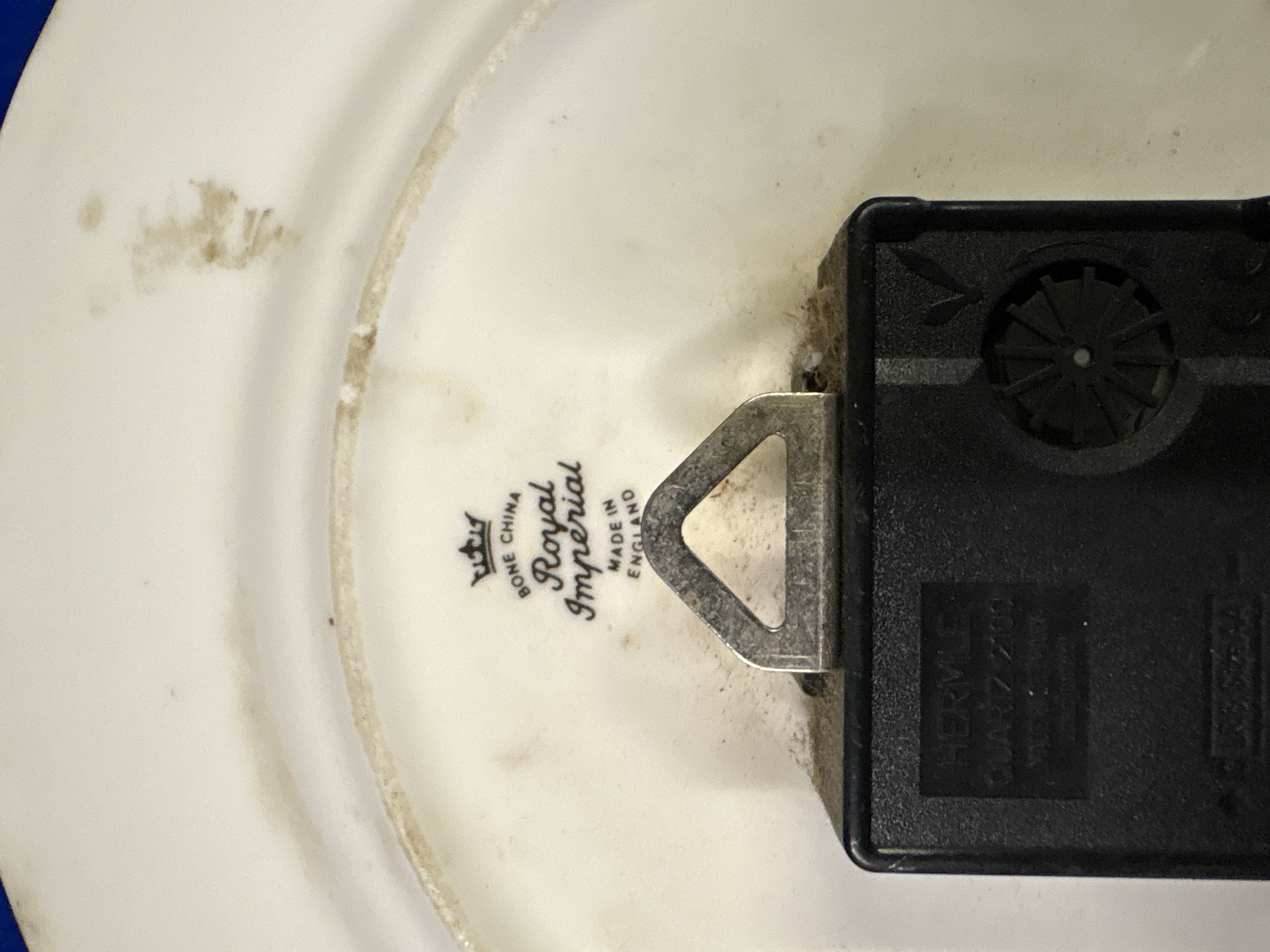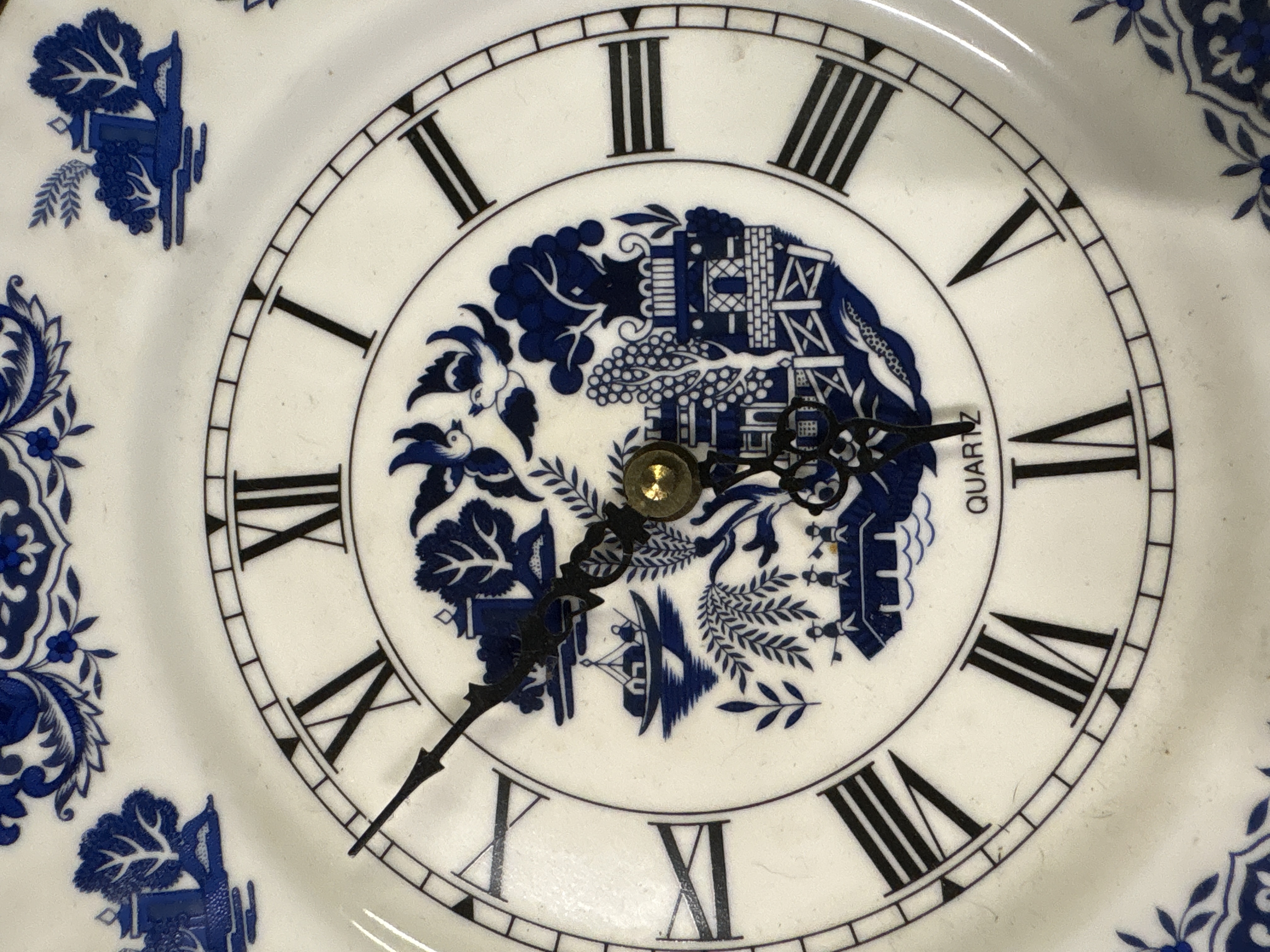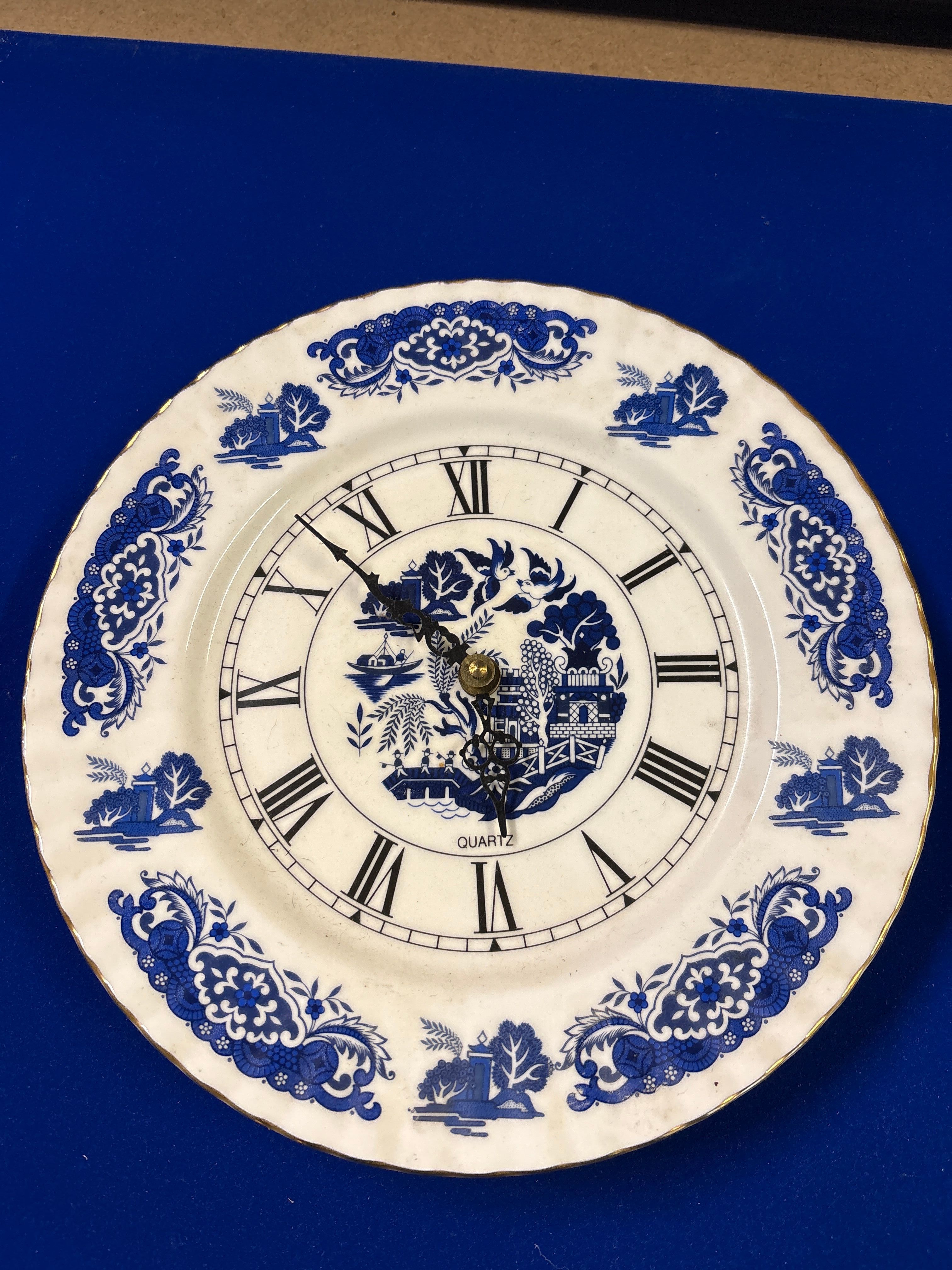 A wall clock fashioned from a Royal Imperial porcelain plate, featuring a classic blue and white Willow pattern transferware design. The plate displays a scalloped, gilt-edged rim and a central pastoral scene. The clock face is composed of black Roman numerals and a minute track, complemented by ornate black-finished hour and minute hands. The reverse bears the manufacturer backstamp for Royal Imperial, Made in England, and houses a battery-operated Hermle Quartz 2100 movement. Diameter: 26 cm.
