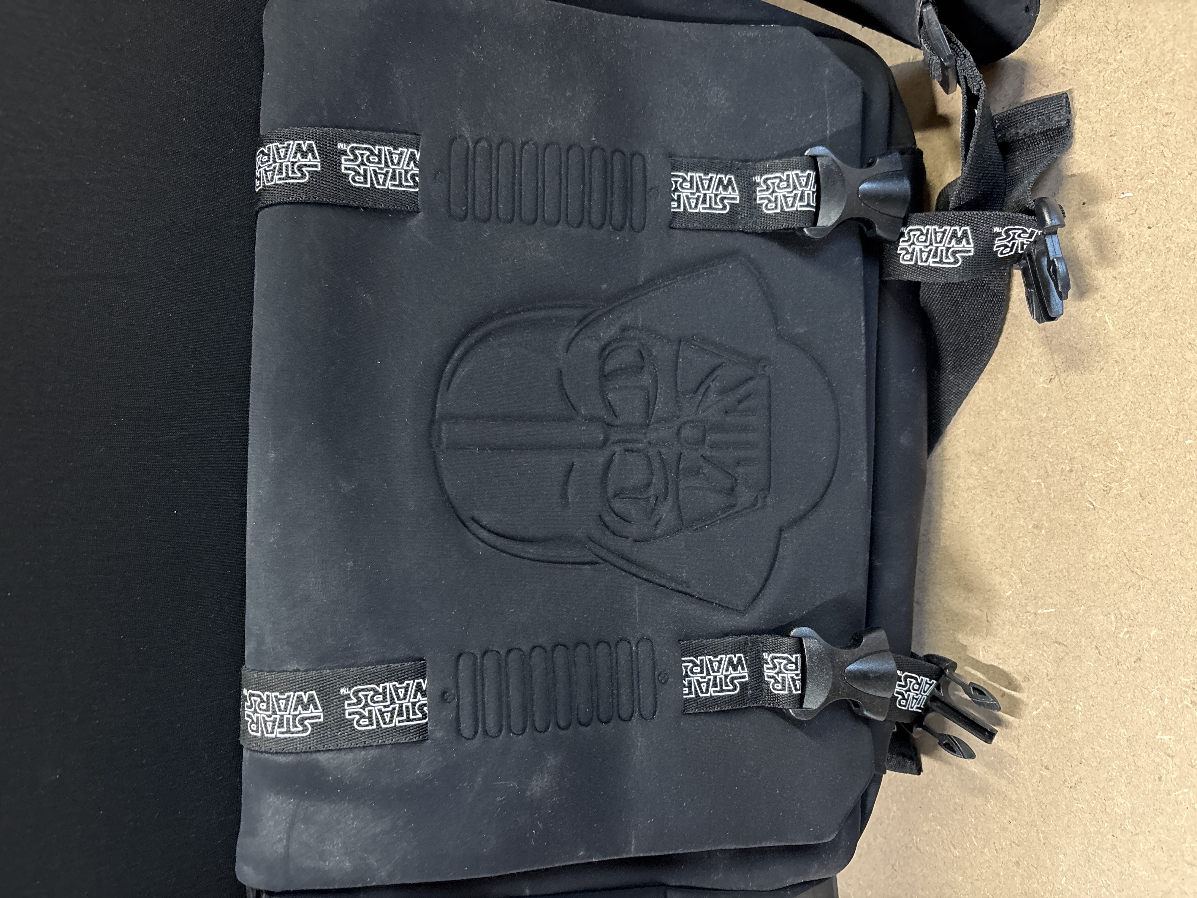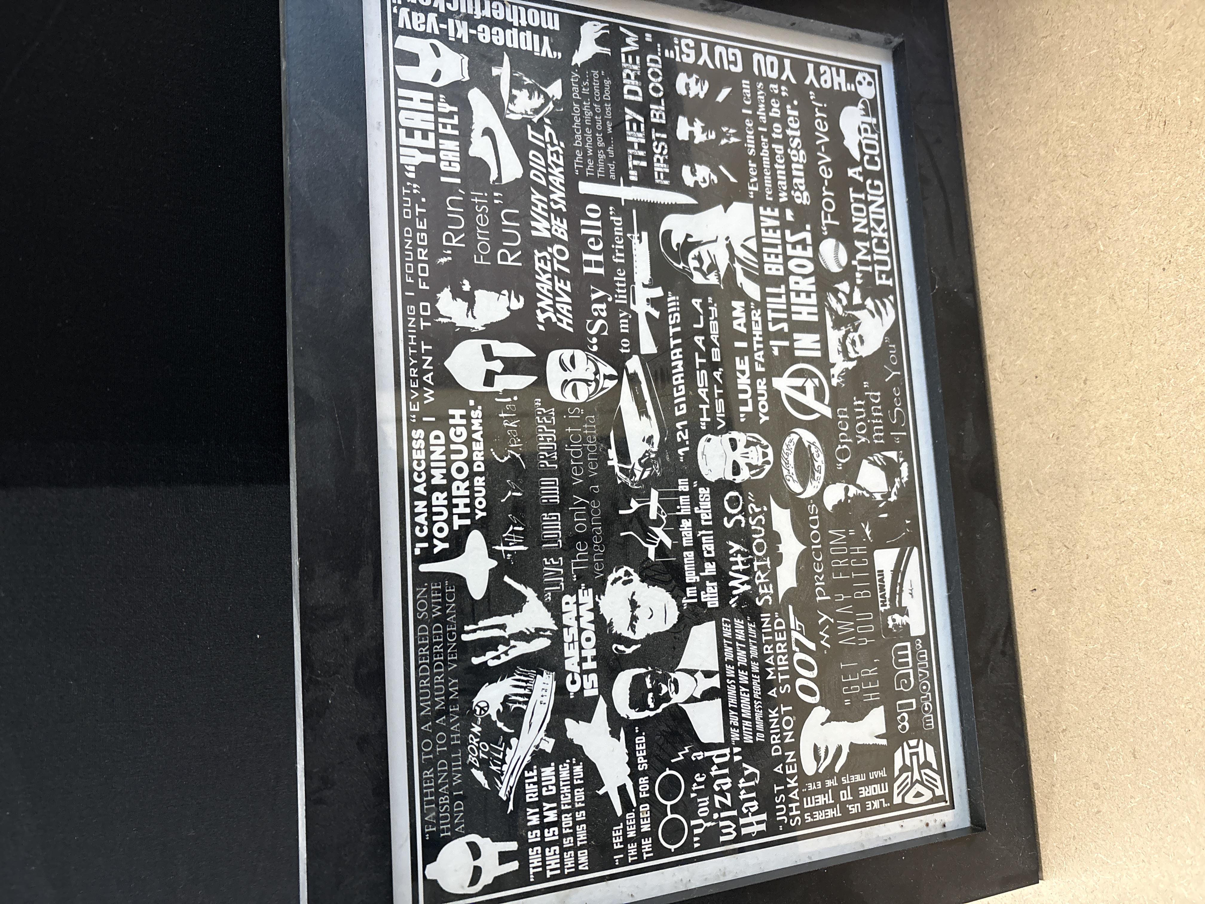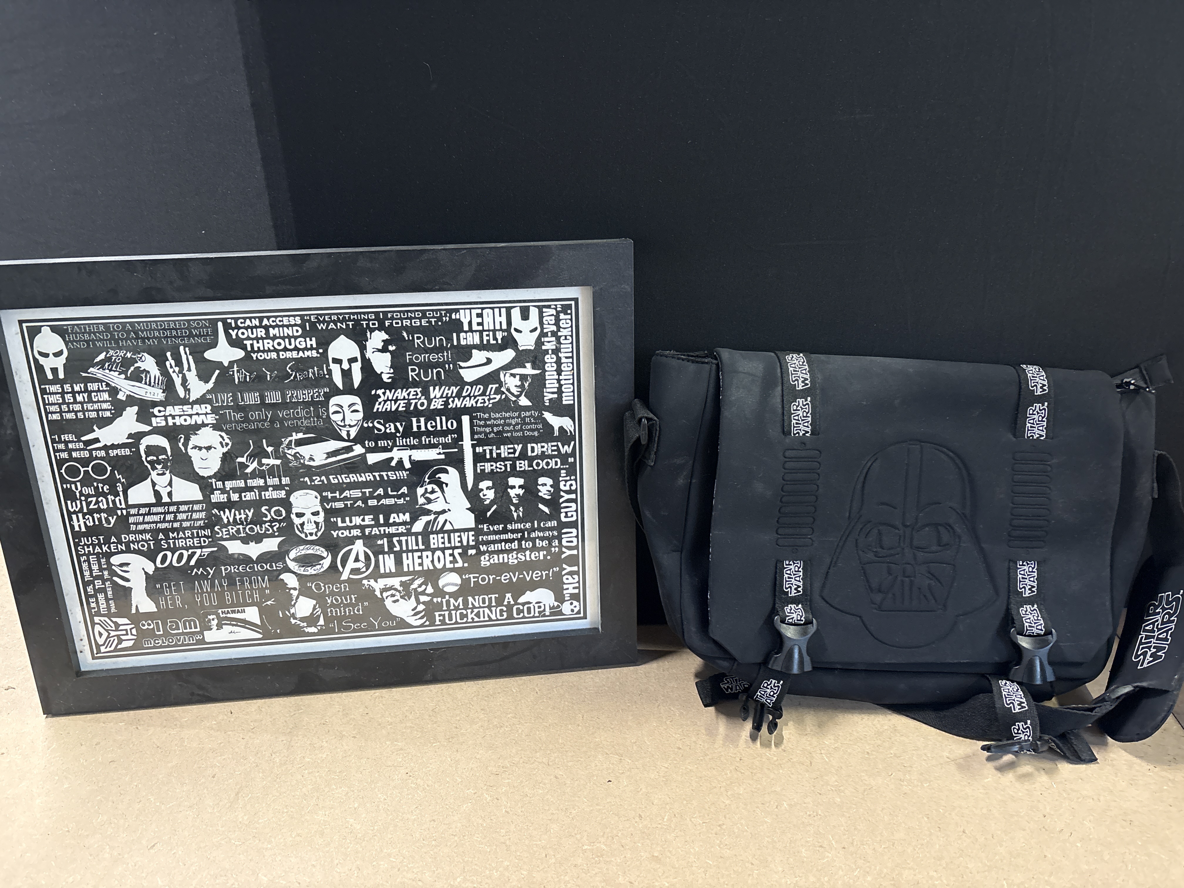This lot comprises two items of contemporary cinema memorabilia. The primary item is a black Star Wars-themed messenger bag featuring a prominent embossed Darth Vader helmet on the front flap. The bag includes adjustable straps and plastic buckle closures, both adorned with repeating white Star Wars logos. The second item is a framed graphic print presenting a black-and-white collage of iconic movie quotes and symbols. The artwork references numerous legendary franchises including Star Wars, James Bond, Harry Potter, Back to the Future, and The Lord of the Rings. The print is housed in a minimalist black frame, suitable for display in a home cinema or fan collection. These items are unauthenticated and unsigned, representing modern fan merchandise.