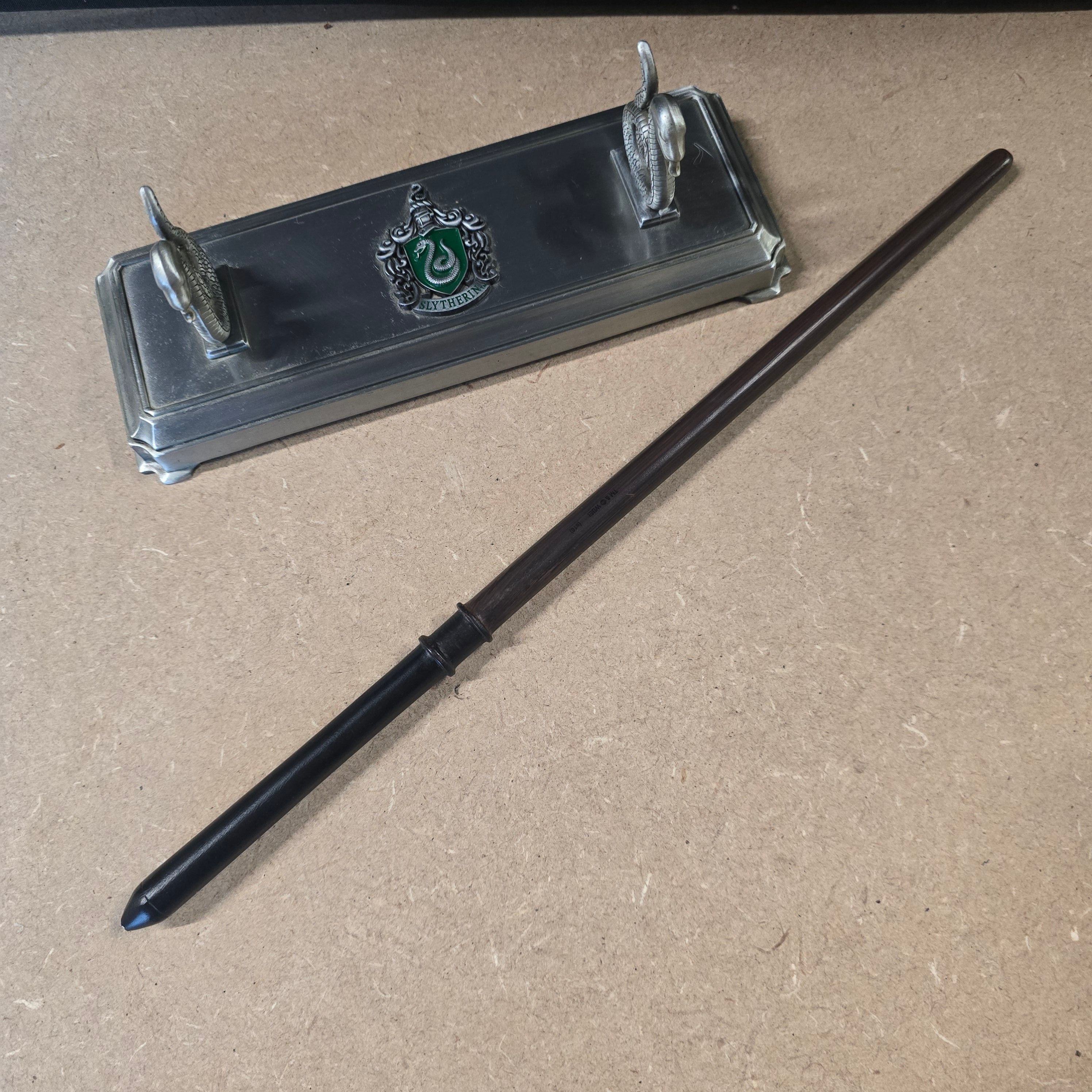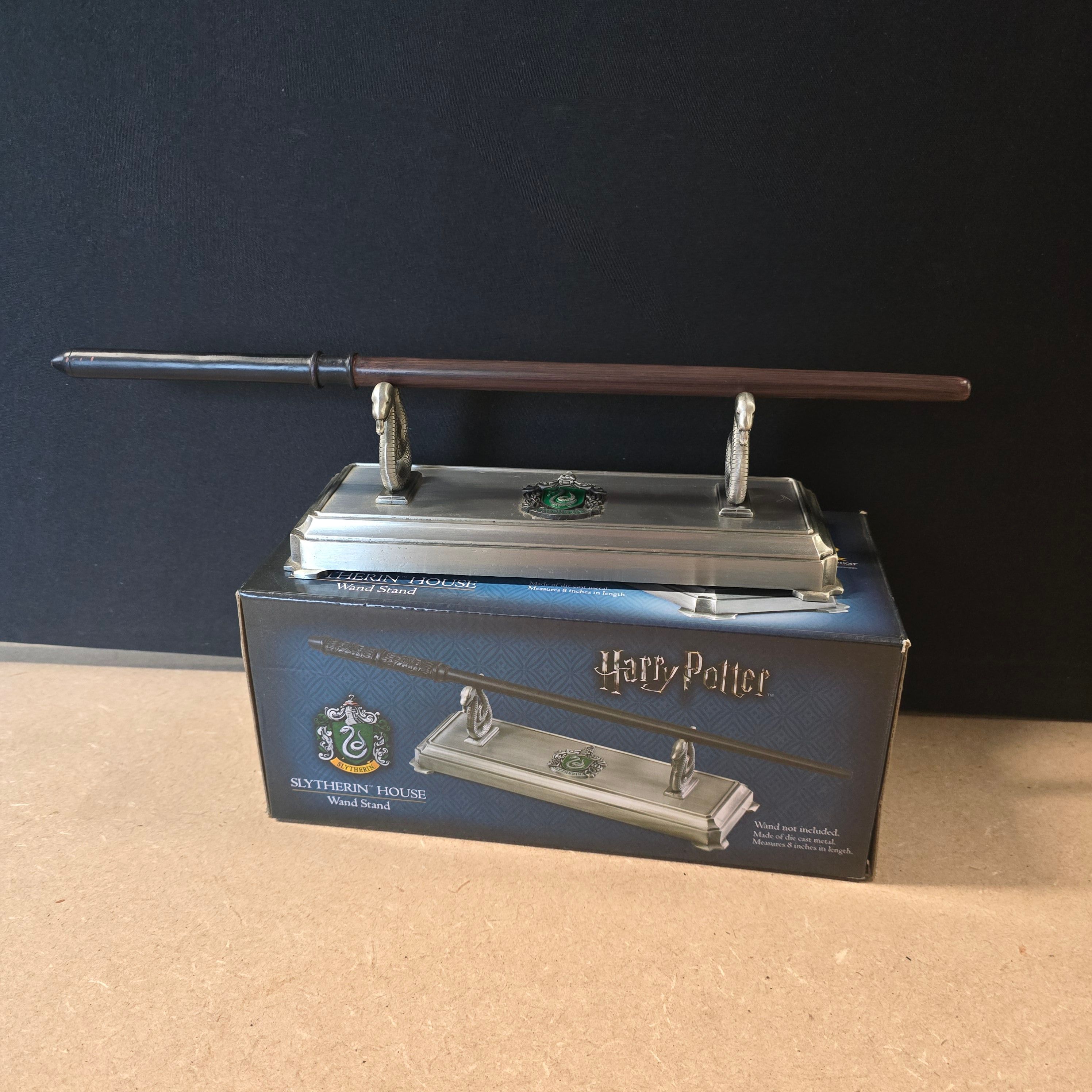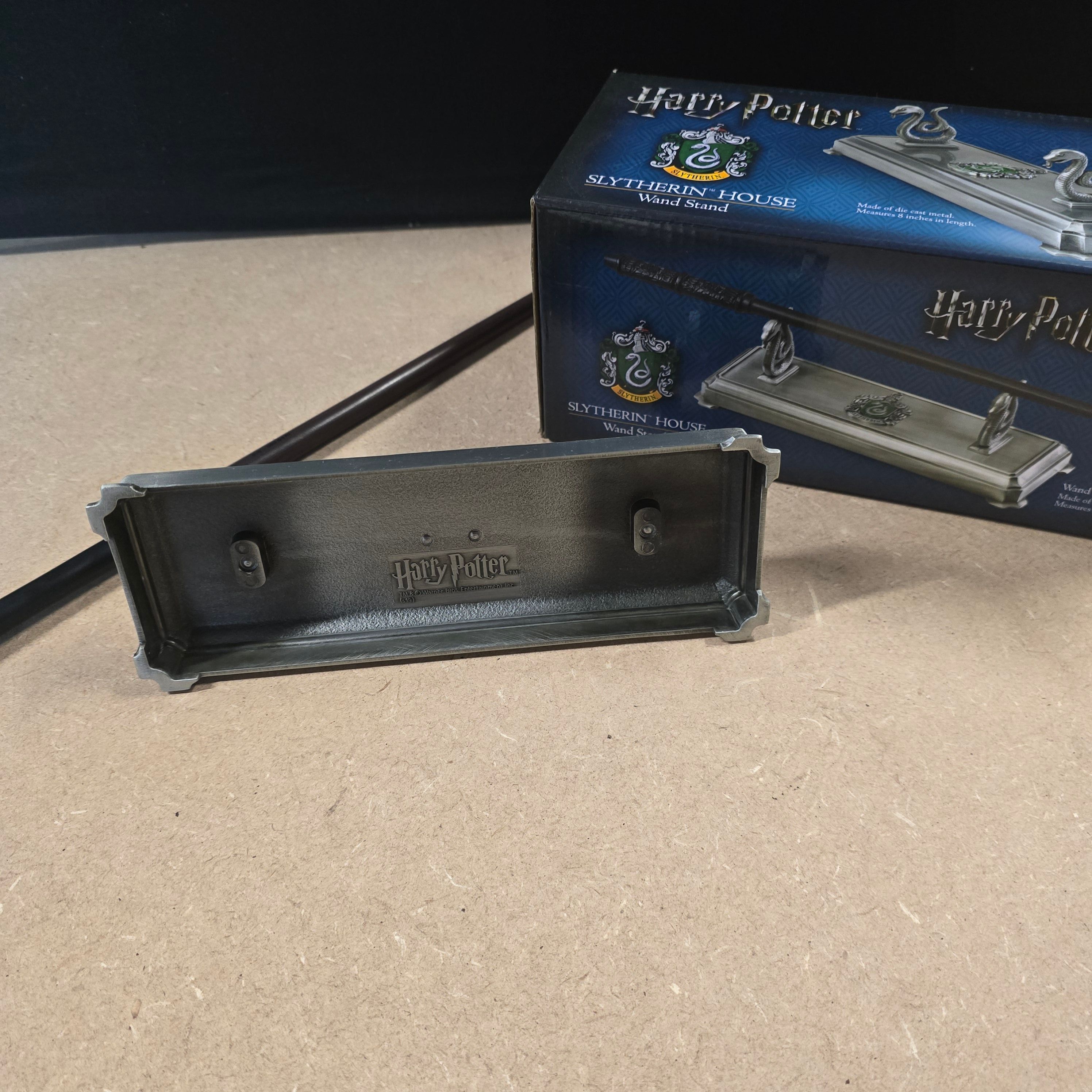 This lot features an officially licensed Slytherin House Wand Stand manufactured by The Noble Collection. The stand is expertly crafted from silver-toned die-cast metal and designed to display a single wand. It features two detailed snake-head supports, reflecting the iconography of the Slytherin house, and a central crest finished with green enamel. The underside of the base is embossed with the Harry Potter logo and the copyright mark for Warner Bros. Entertainment Inc. (s16). Included with the stand is a dark brown and black prop wand, constructed of resin or plastic, which provides a complete display set. The item is accompanied by its original cardboard retail packaging. Stand measures approximately 8 inches in length.