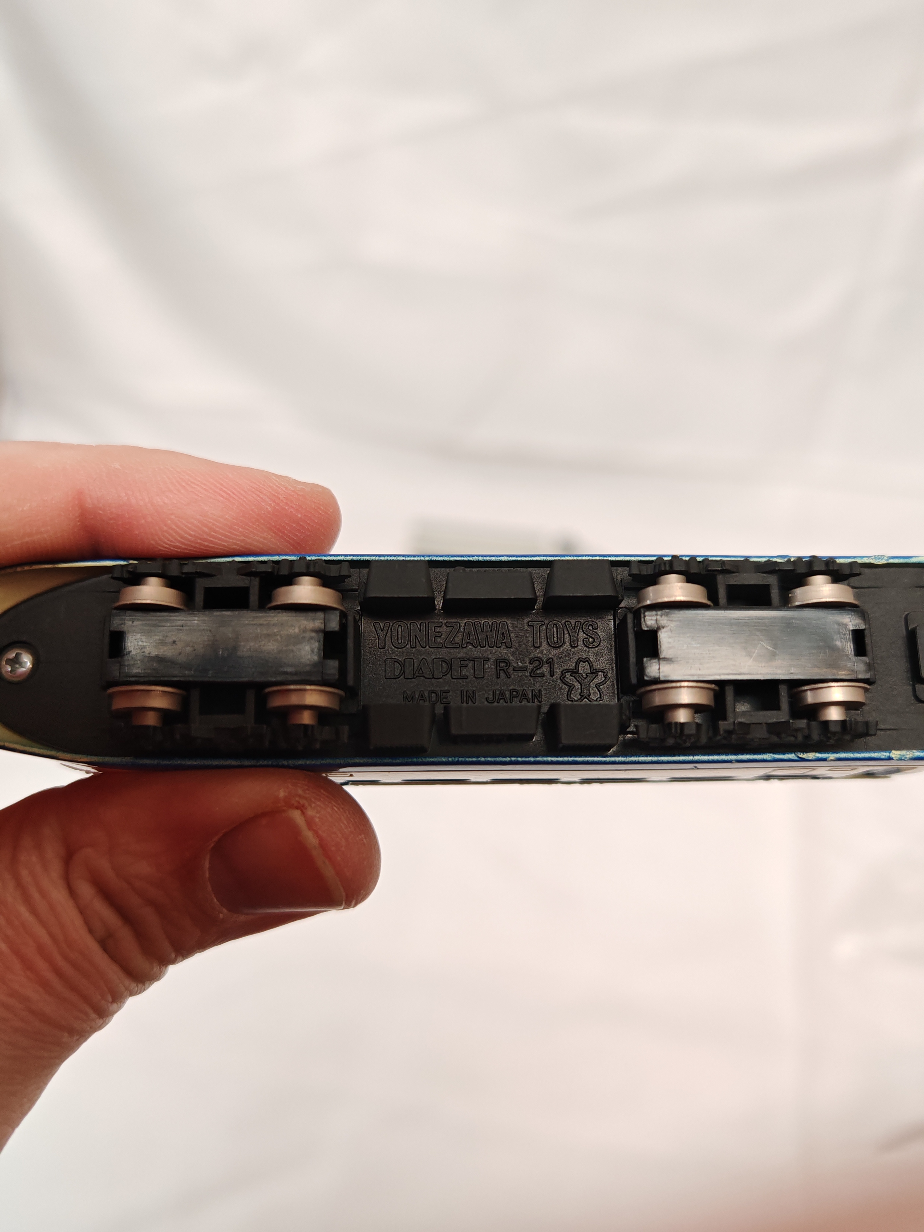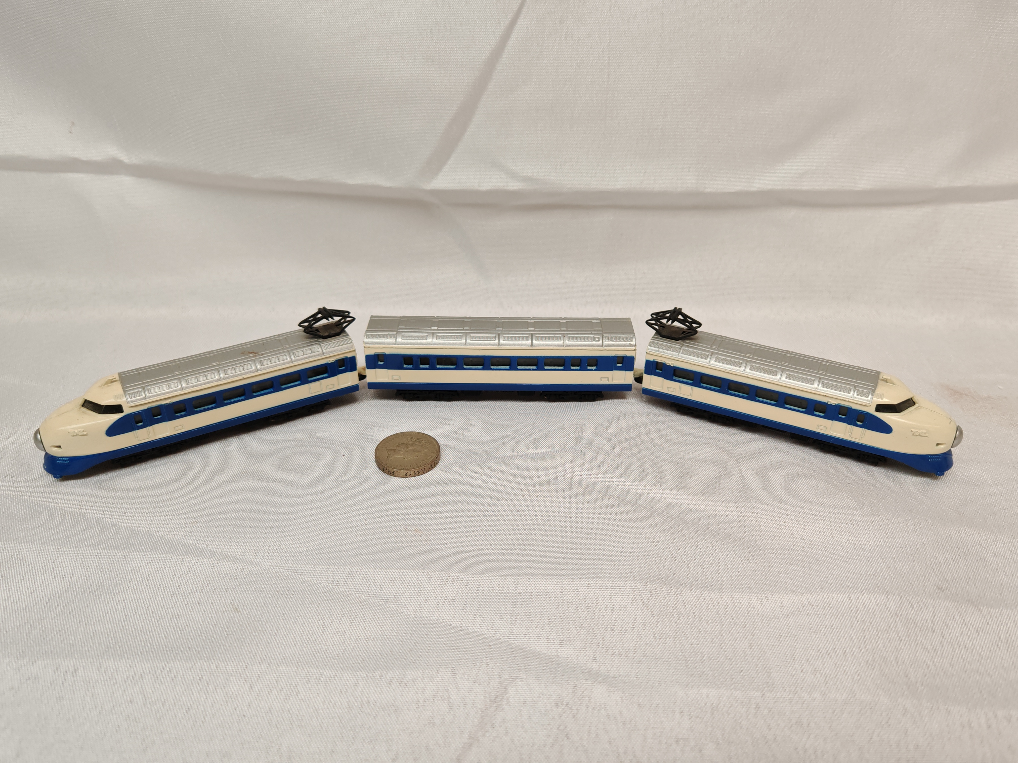 A vintage three-car model set of the iconic Japanese Shinkansen 0 Series bullet train, manufactured by Yonezawa Toys under the prestigious Diapet brand. This set, designated as model number R-21, consists of two aerodynamic end cars fitted with black pantographs and one central passenger carriage. Each car is constructed with a die-cast metal body finished in the traditional white and blue livery with silver-coloured roofs. The underside features a black plastic chassis embossed with the manufacturer name, the Diapet brand, model number R-21, the distinctive Yonezawa flower-shaped logo, and the MADE IN JAPAN mark. The models are equipped with metal wheels and axles. This set represents the pioneering era of high-speed rail in Japan, captured in the robust die-cast style characteristic of Yonezawa production during the late 20th century. Each car measures approximately 12.5 cm in length, with a total coupled length of approximately 38 cm.