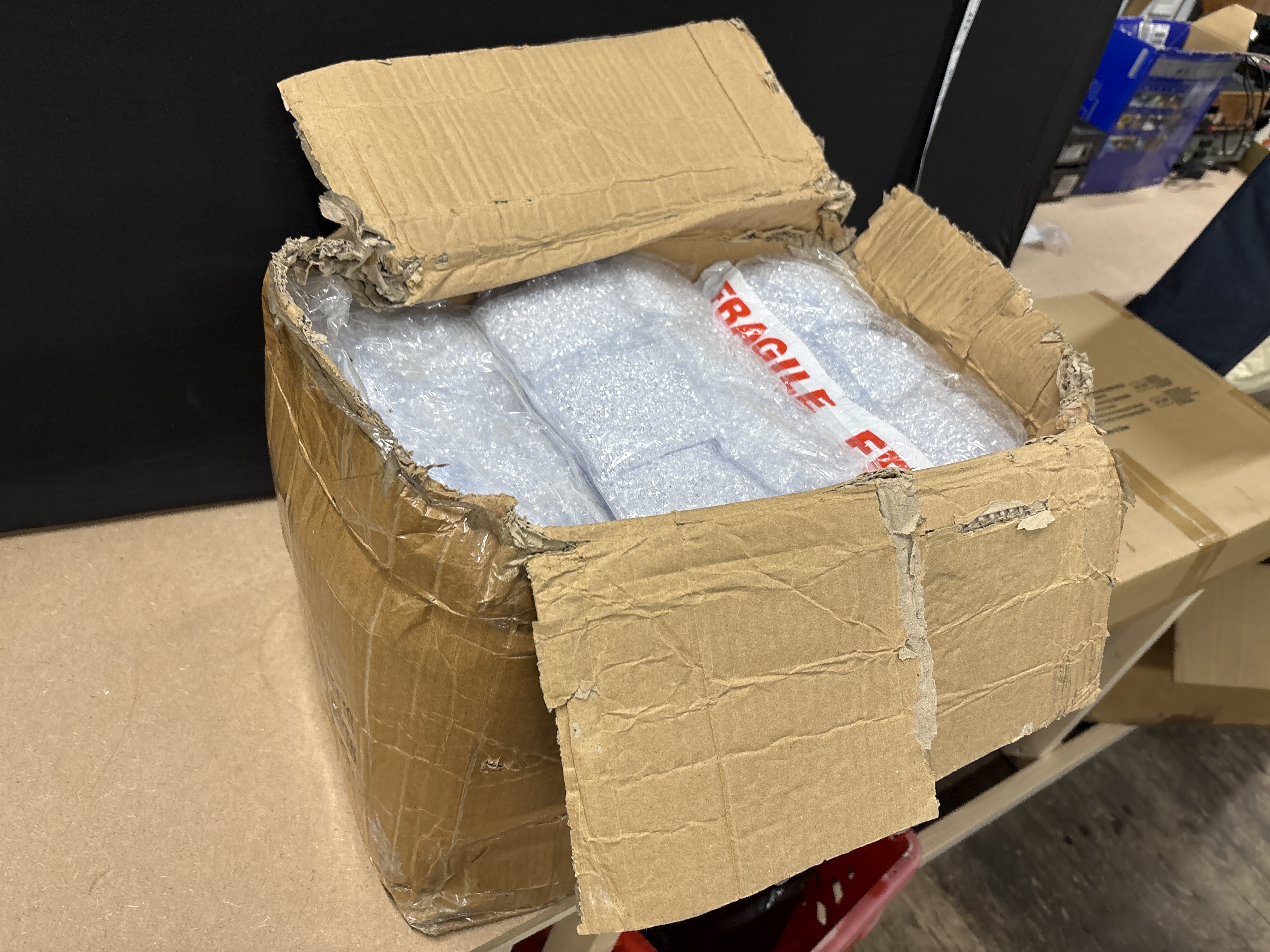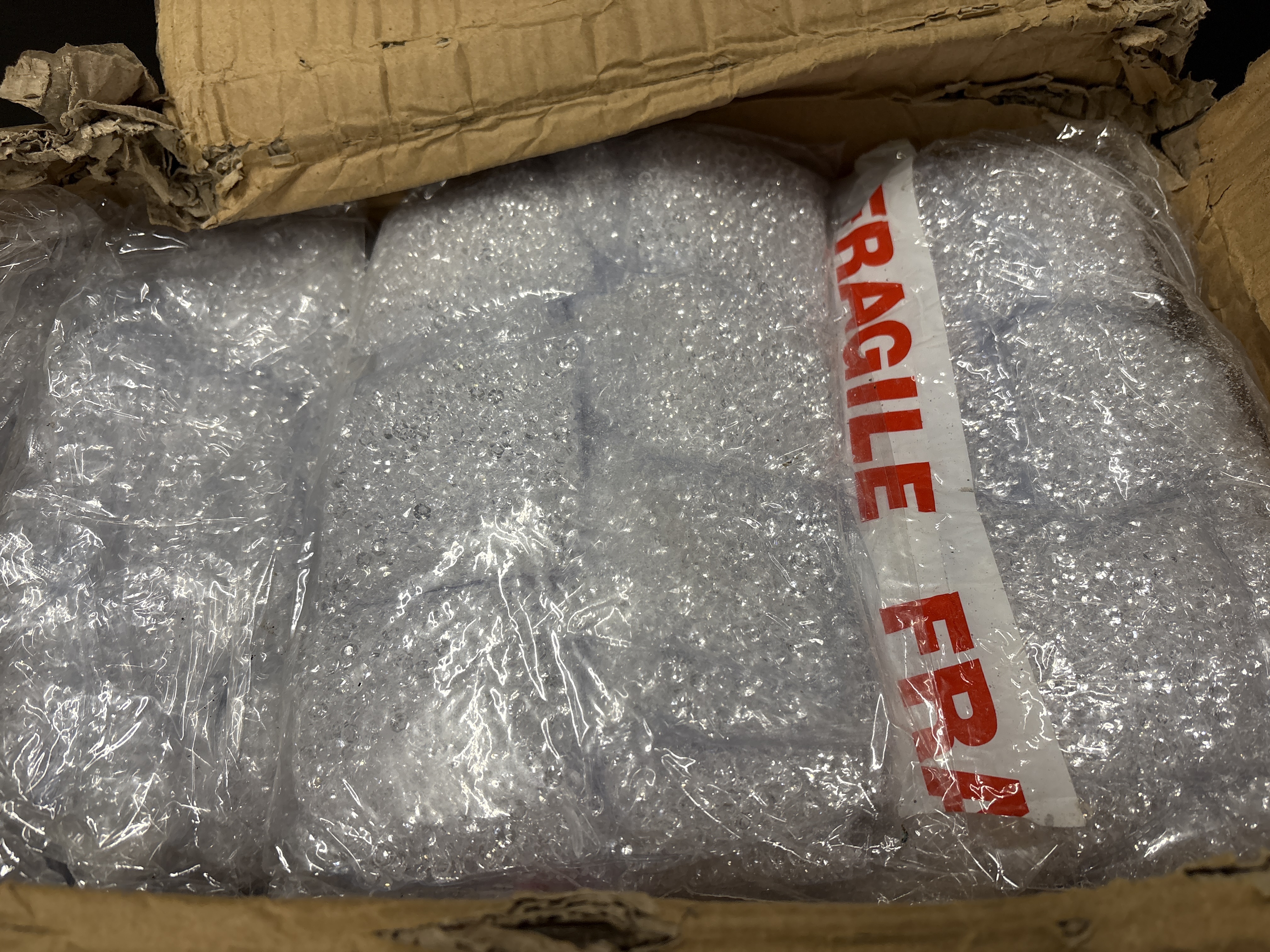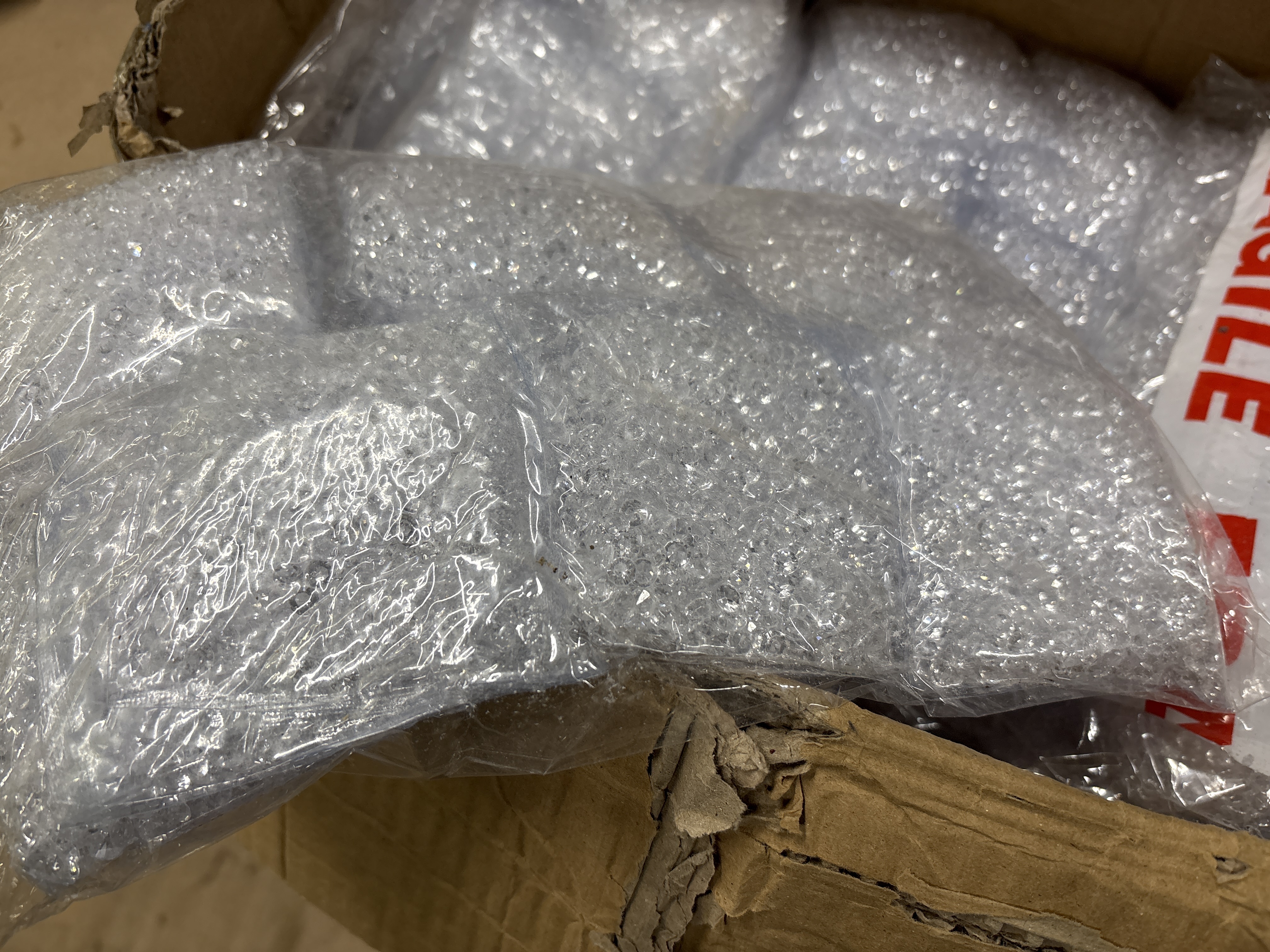 This lot consists of a single bulk collection of loose, colourless stones appearing to be round brilliant-cut diamantés. The items are densely packed within multiple clear plastic bags and further protected by bubble wrap inside a weathered cardboard shipping box. As these are loose stones, no metal, settings, maker’s marks, or hallmarks are visible, and the specific material cannot be determined without further testing; they appear to be synthetic or glass diamantés suitable for costume jewellery. No scale or measuring tools were present during inspection to determine the total weight or individual stone dimensions.