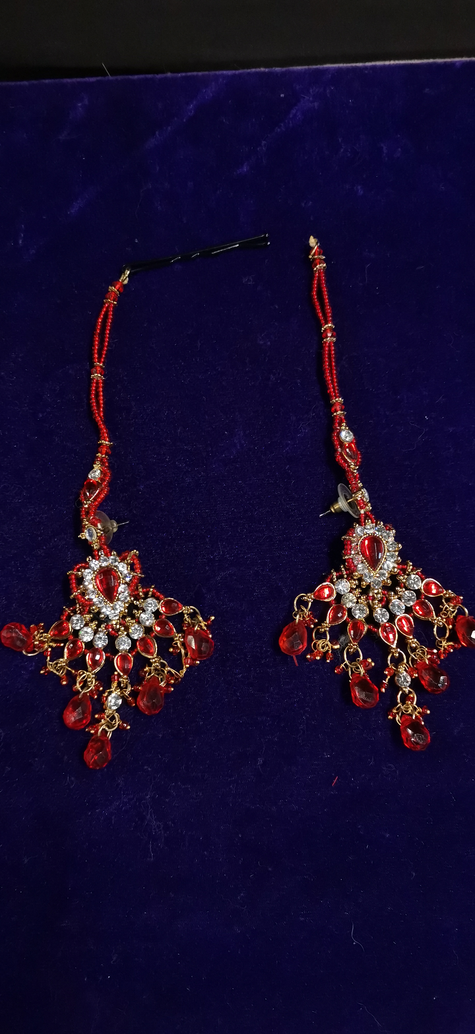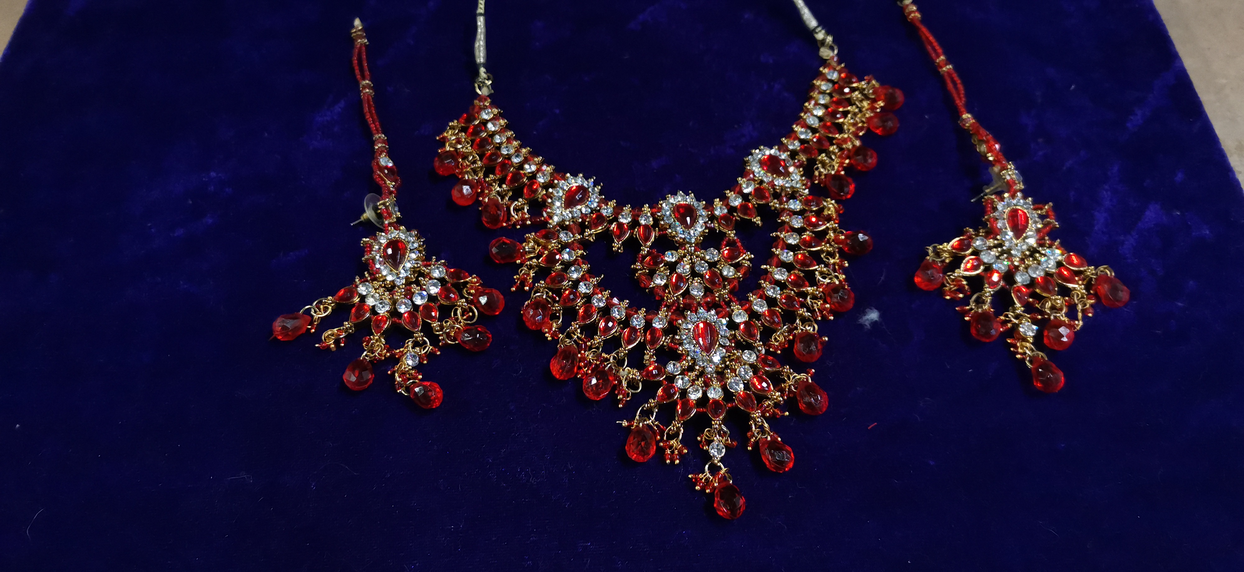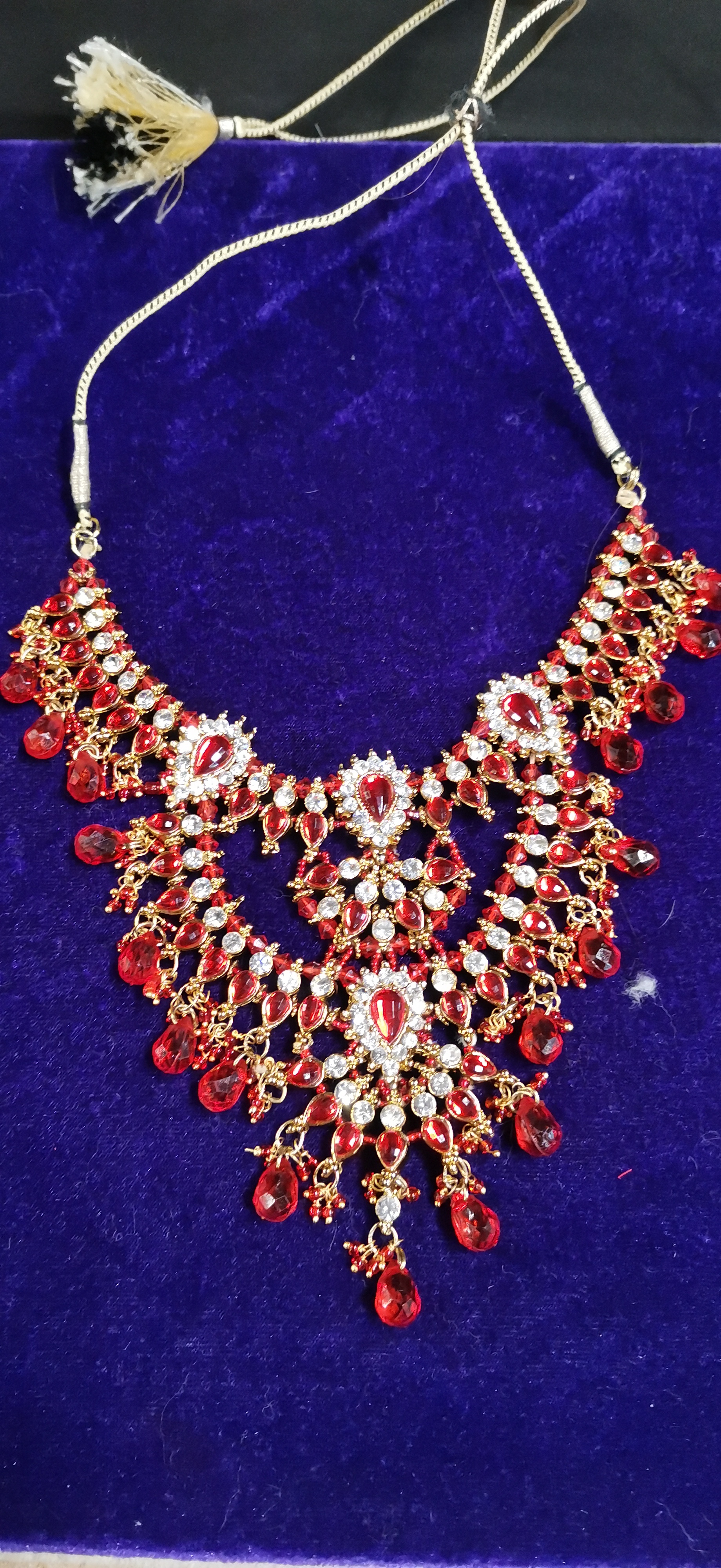 A coordinating Indian bridal jewellery set comprising a bib-style necklace and a pair of sahara-style earrings, fashioned in a yellow gold-tone base metal. The suite is heavily embellished with faceted red and colourless synthetic or glass stones in pear and round cuts, arranged in prong-set and pavĂ©-style configurations. The design is further accented by dangling faceted red glass beads. The necklace is secured by an adjustable cream fabric cord with a tassel closure. The matching earrings feature post backs and integrated red beaded strands terminating in hair-pin attachments. This set reflects a contemporary Bollywood or Jaipuri aesthetic. No hallmarks, purity stamps, or maker’s marks are present. Weight and measurements are not available.