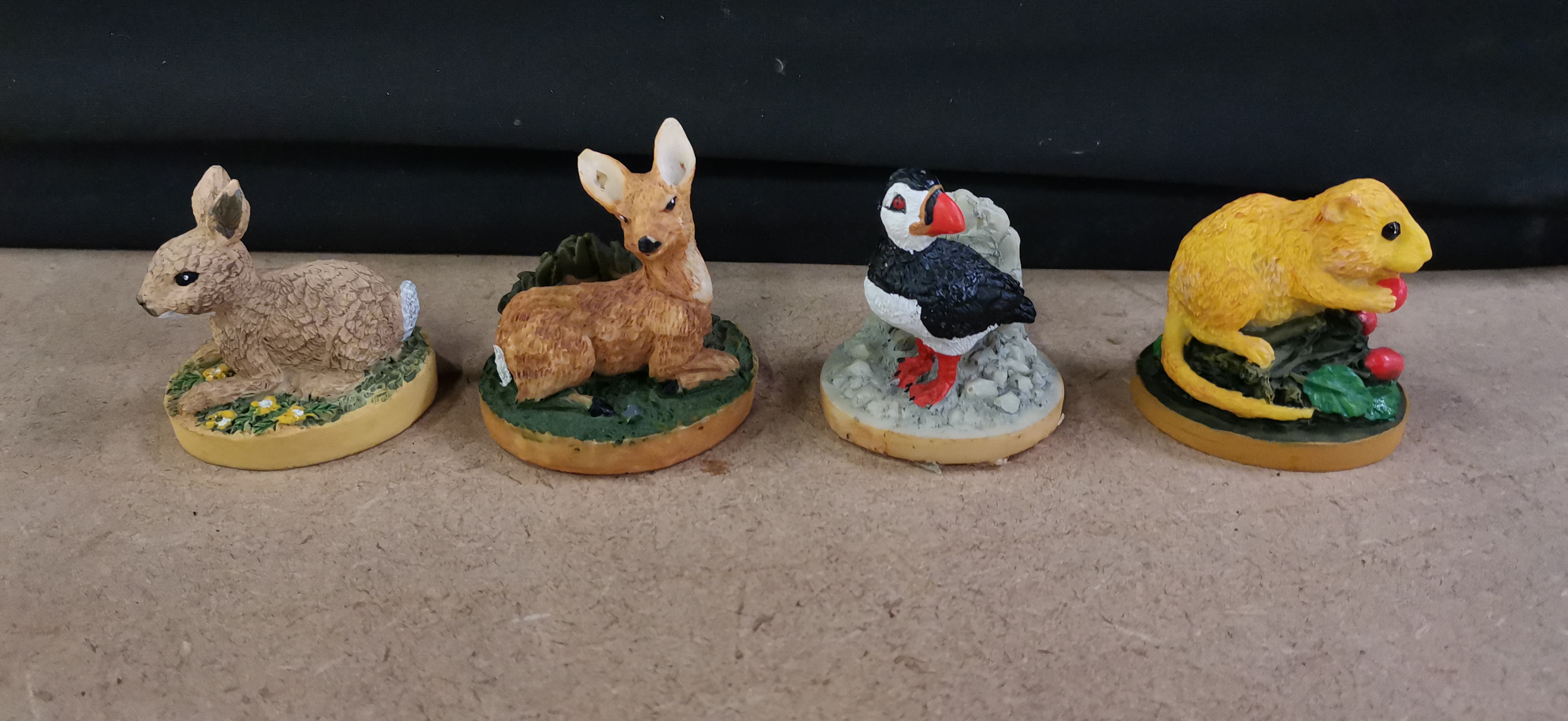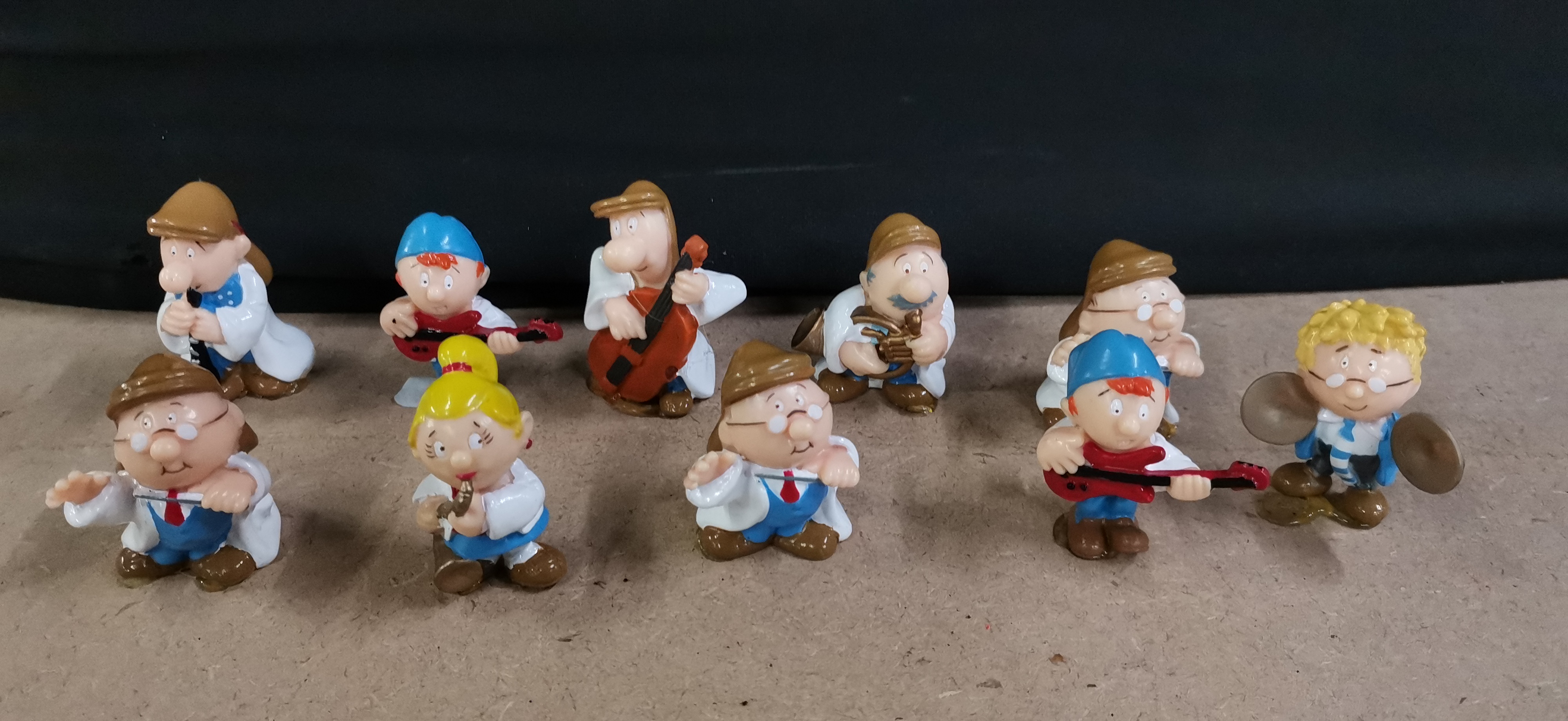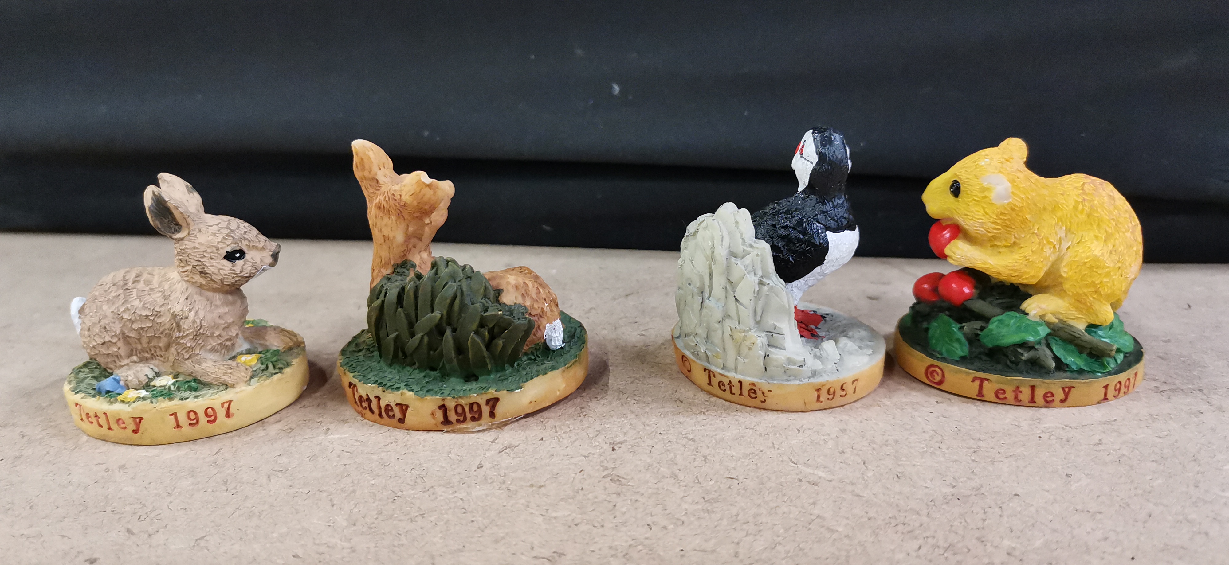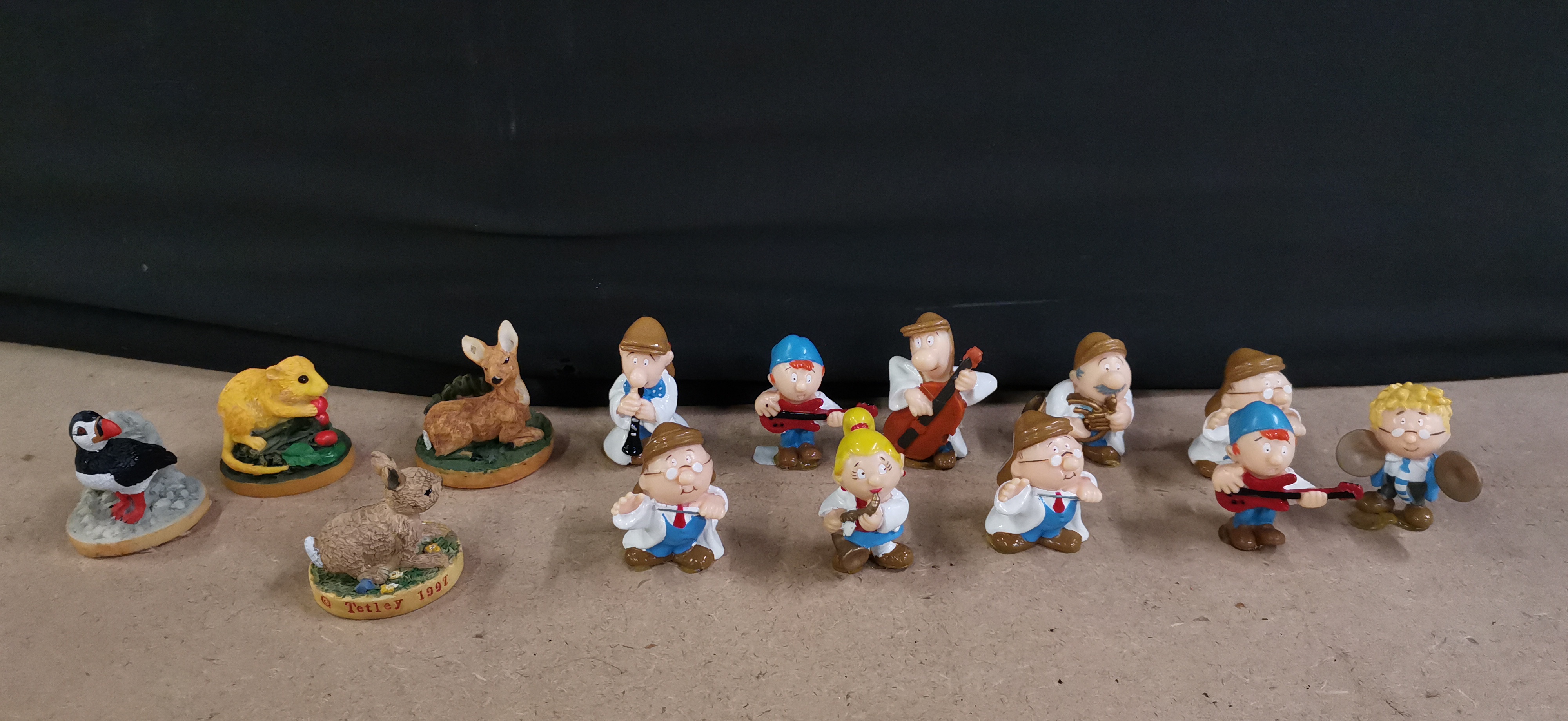 A collection of multicolored miniature figurines including a musical band of gnome-like tea folk and four wildlife animals inscribed with Tetley 1997 on the bases.