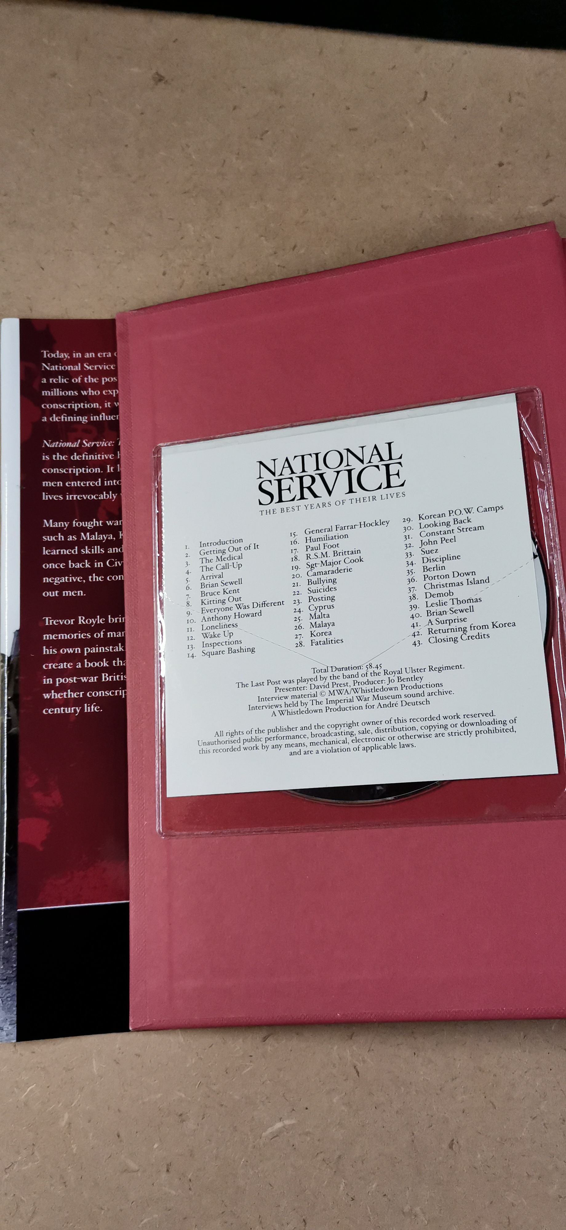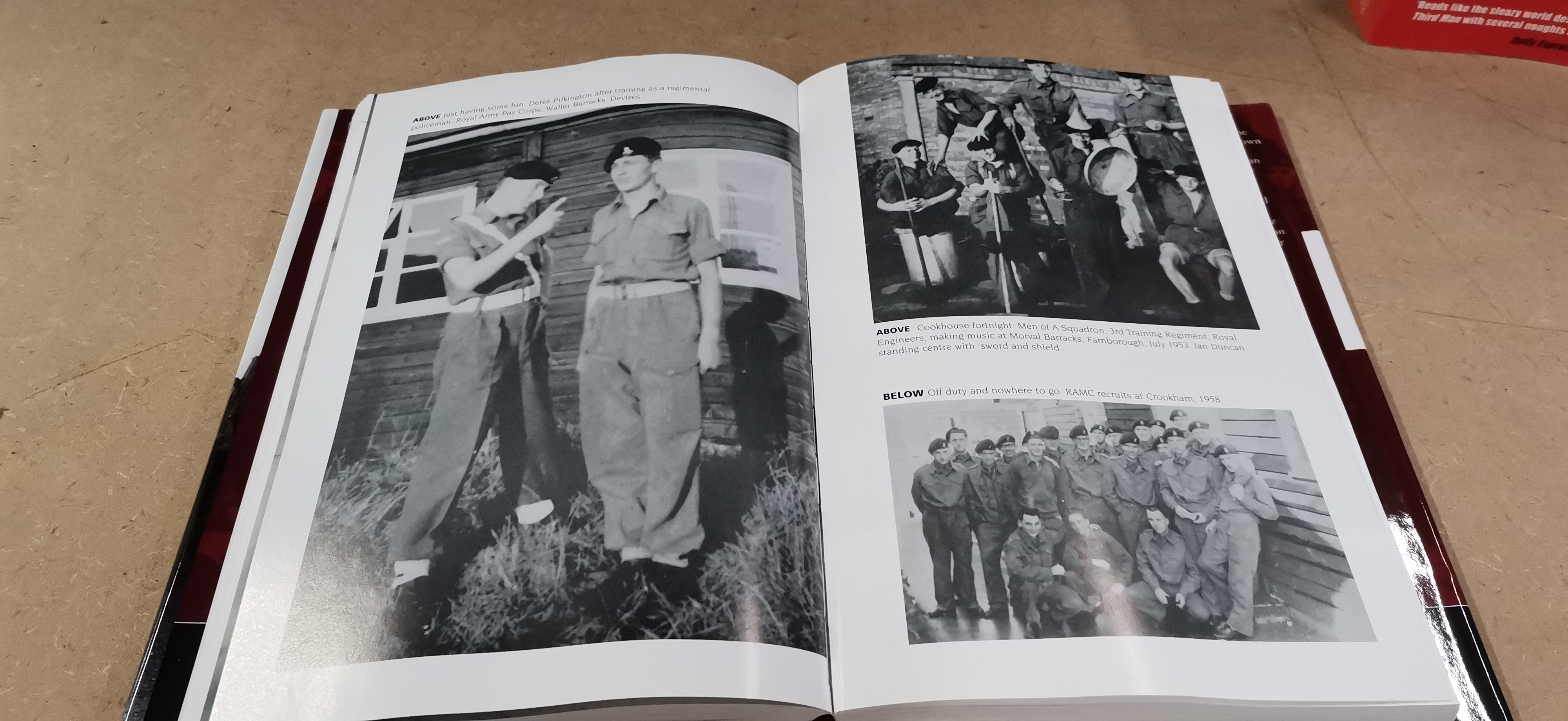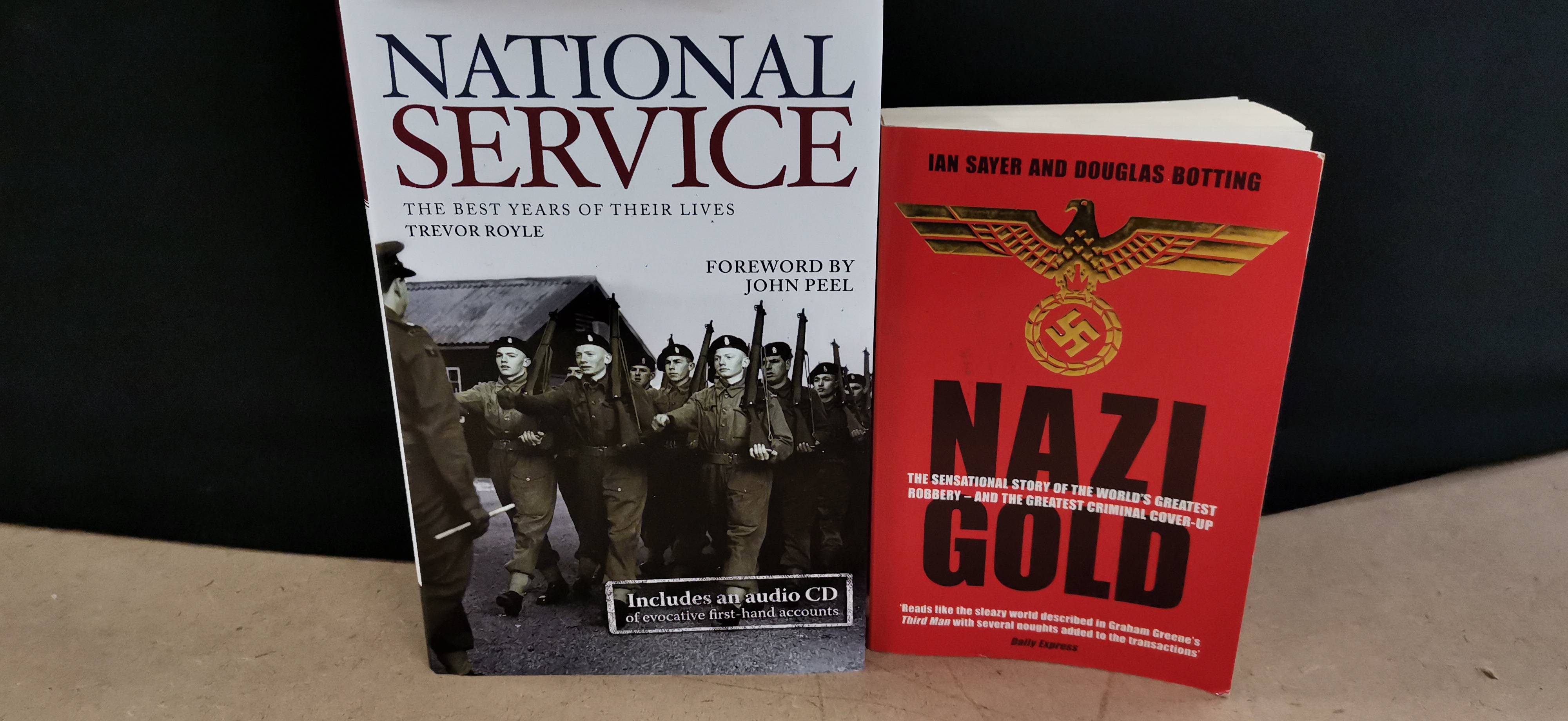 A collection of books presented in primary colours of red and white including National Service: The Best Years of Their Lives by Trevor Royle with a foreword by John Peel and Nazi Gold by Ian Sayer and Douglas Botting.