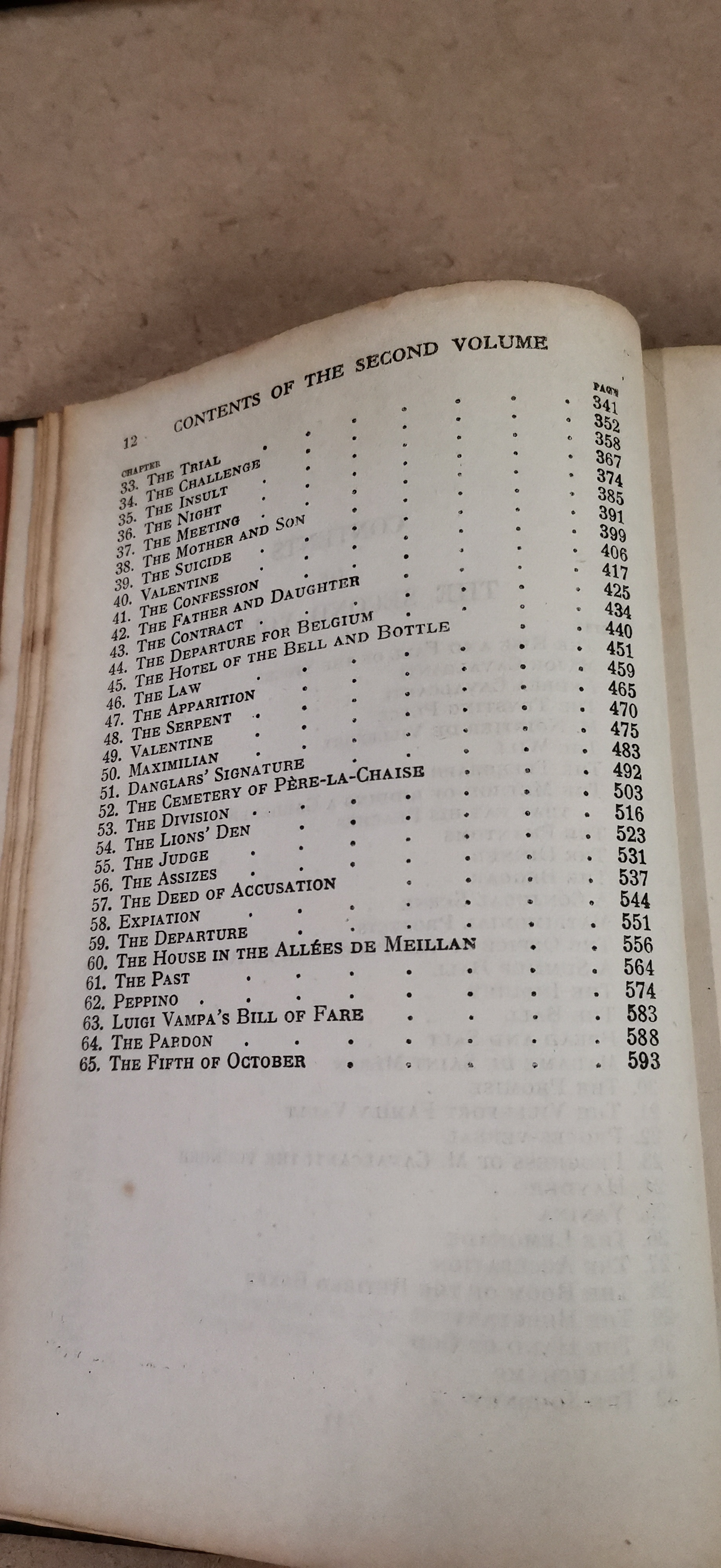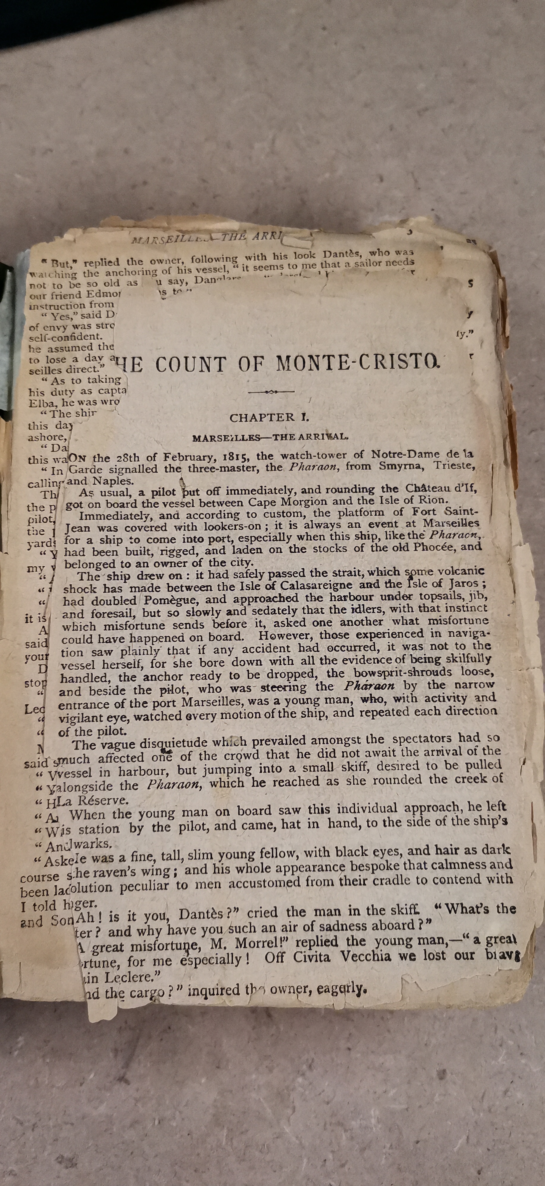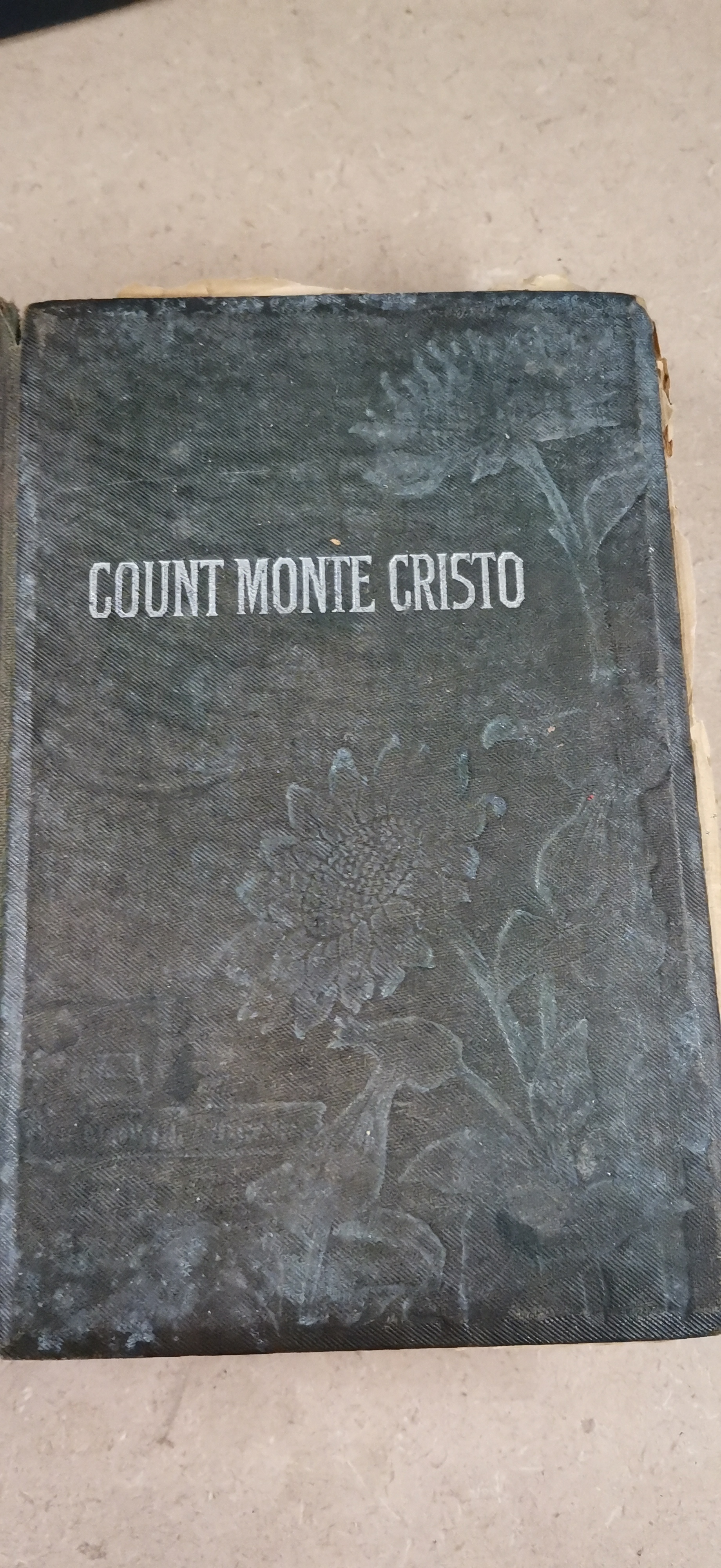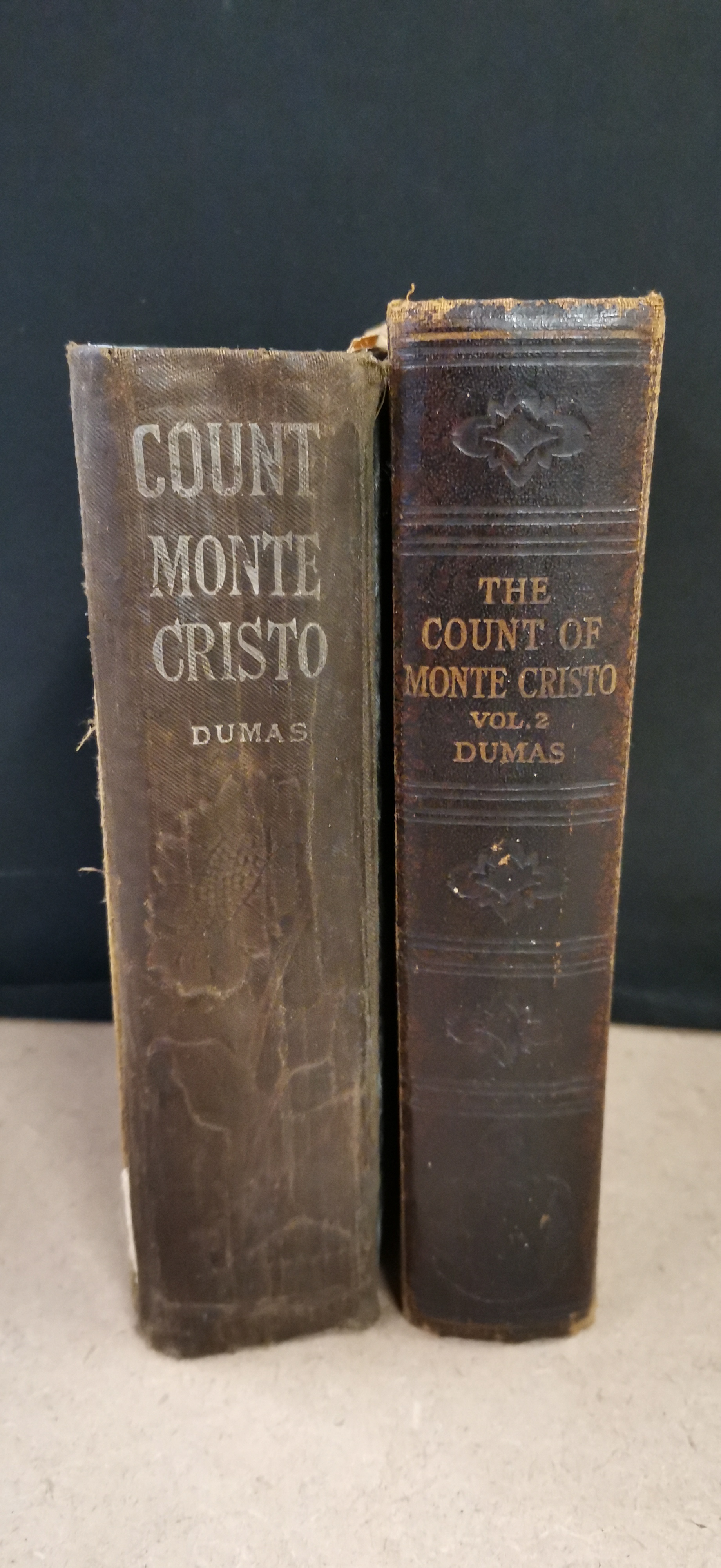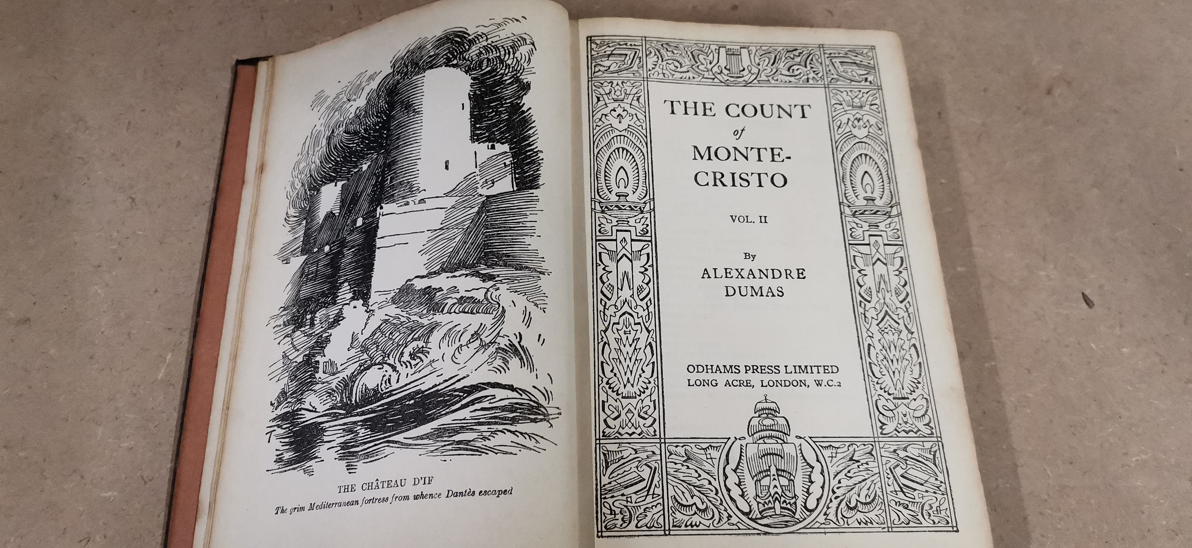 Two editions of The Count of Monte Cristo by Alexandre Dumas, including a dark grey floral-embossed volume and a brown-covered Volume II published by Odhams Press Limited.