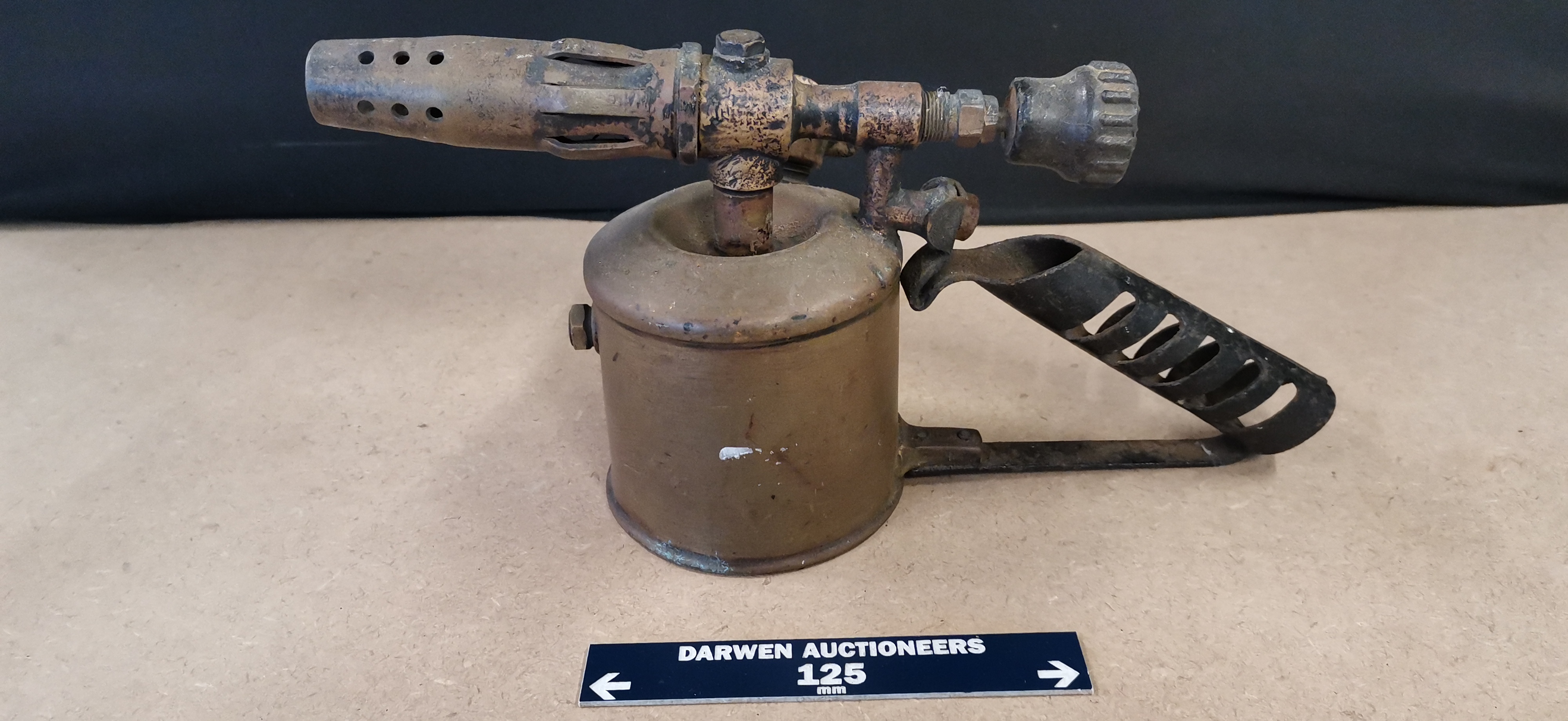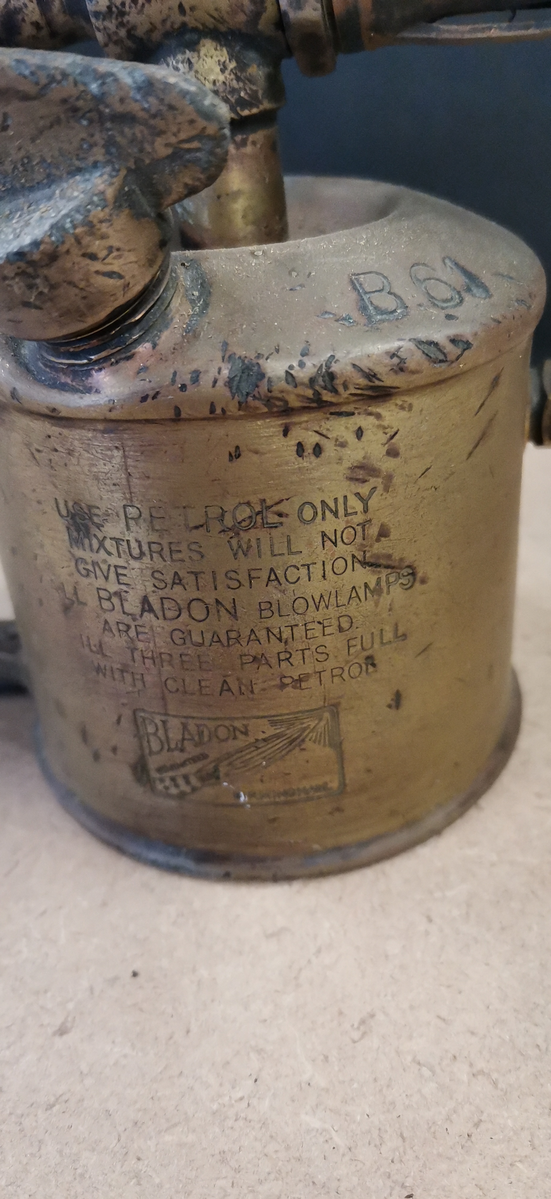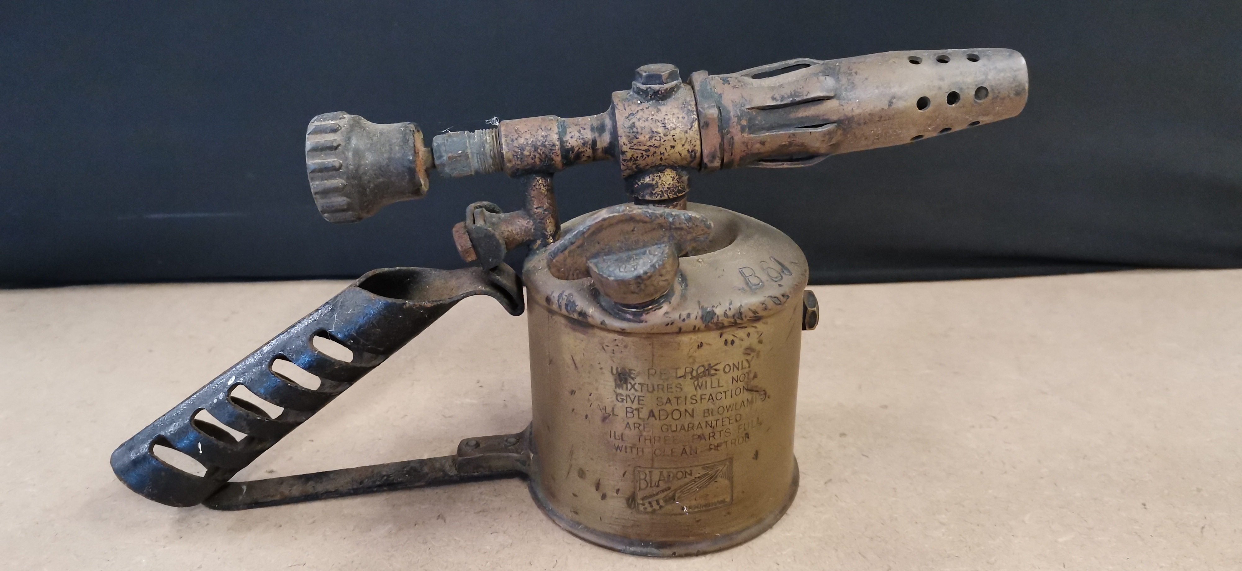 A vintage brass blowlamp with a black metal handle, featuring Bladon markings and model B.61, measuring approximately 250 mm in length.