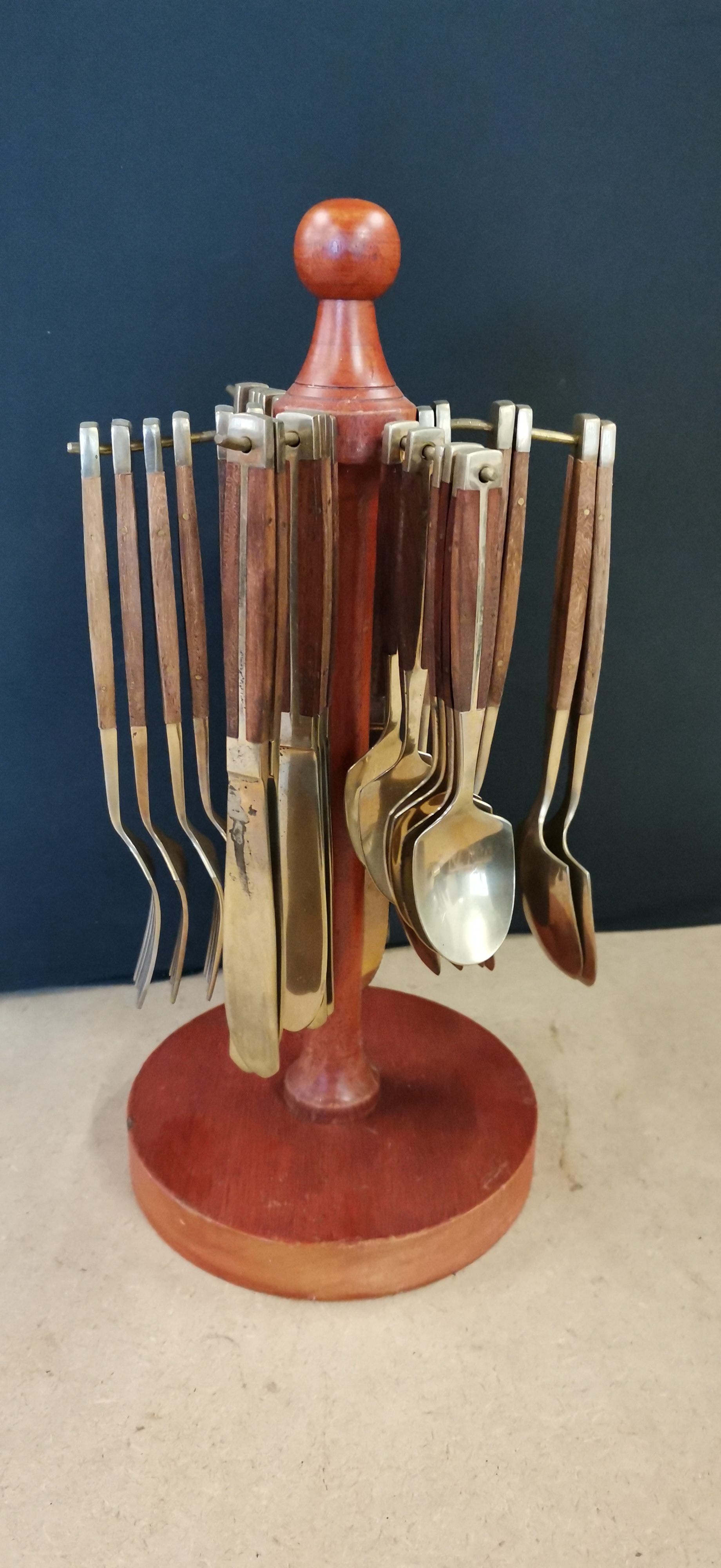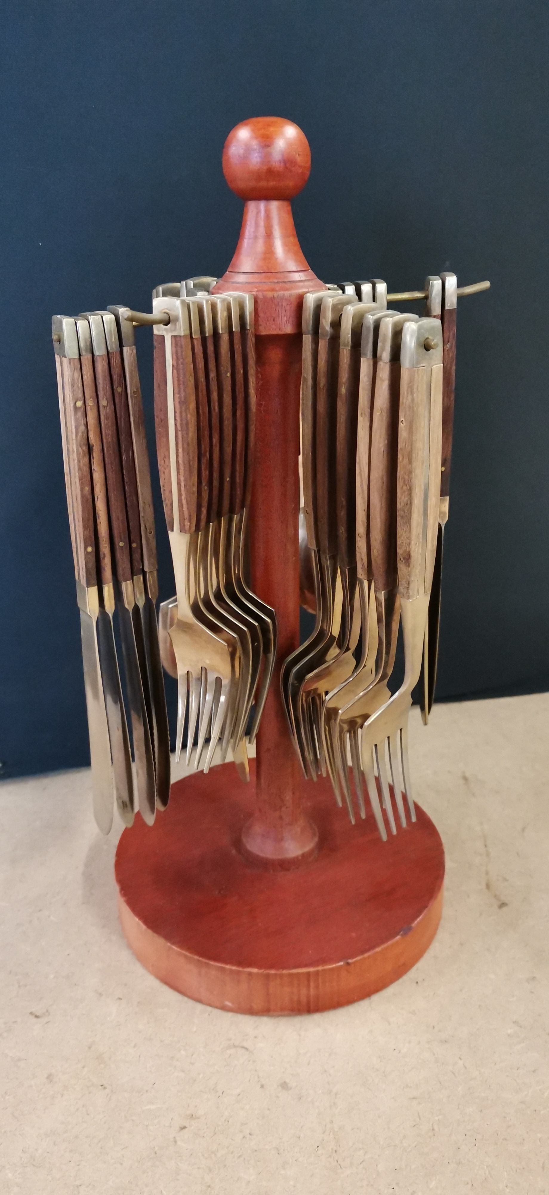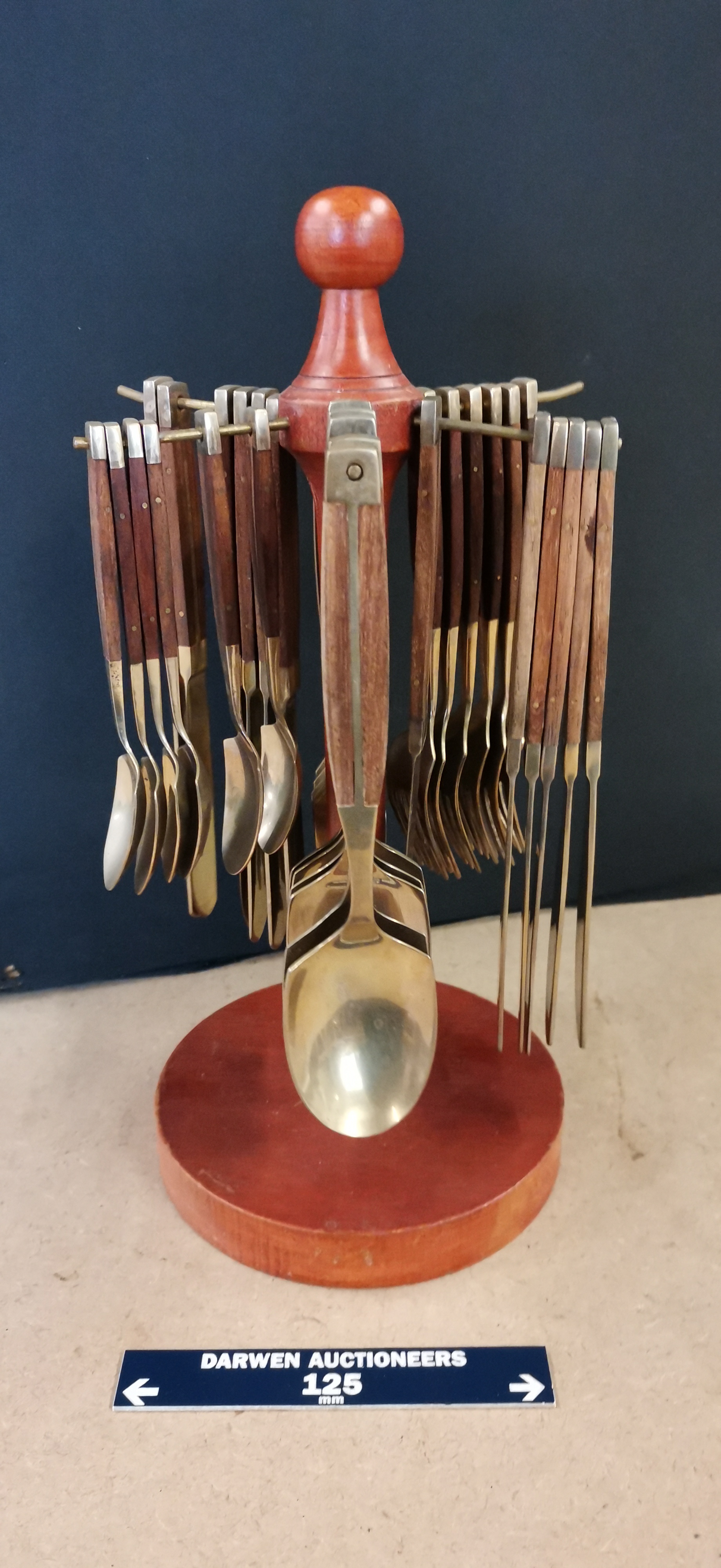 A collection of brass-toned metal cutlery featuring dark wood handles, comprising knives, forks, and spoons, all suspended from a central wooden carousel stand measuring approximately 125mm at the base.