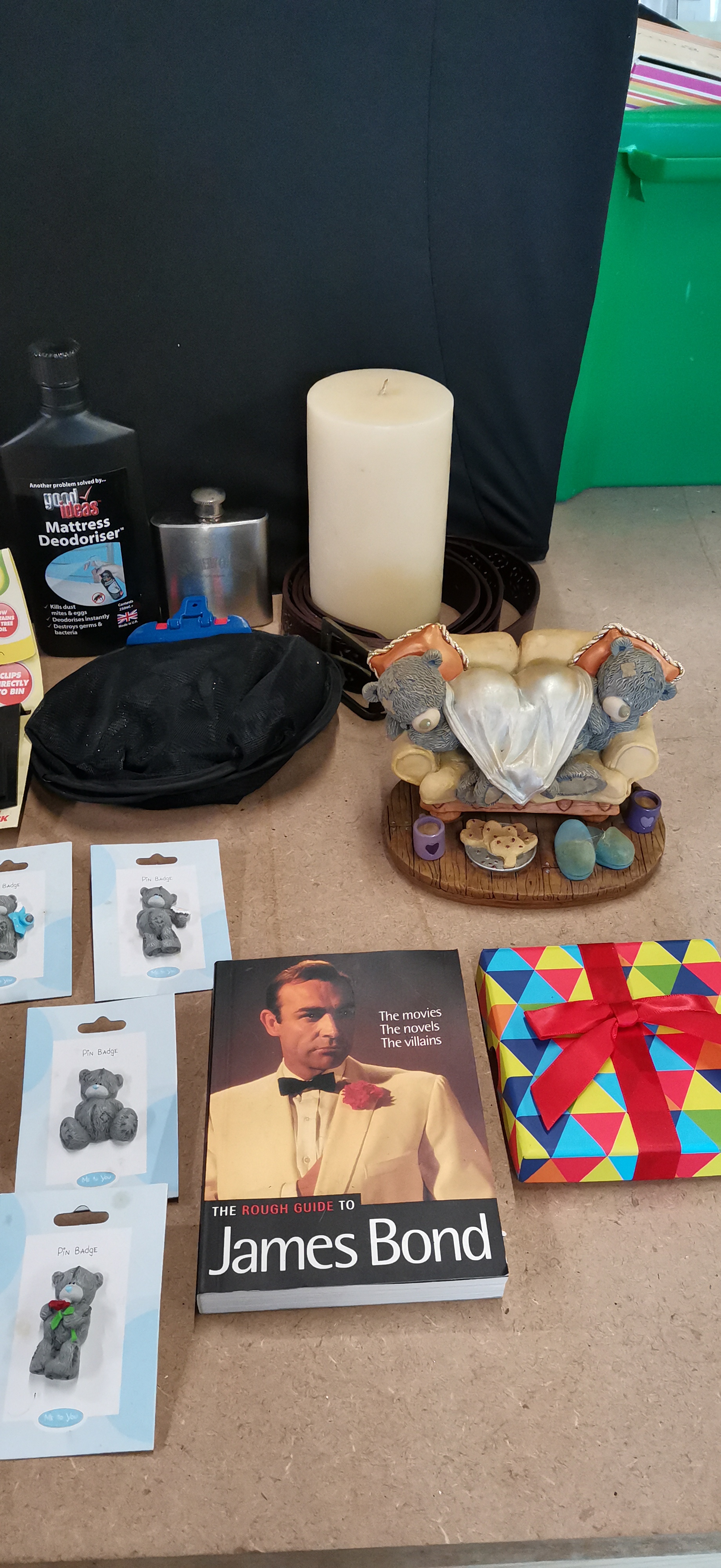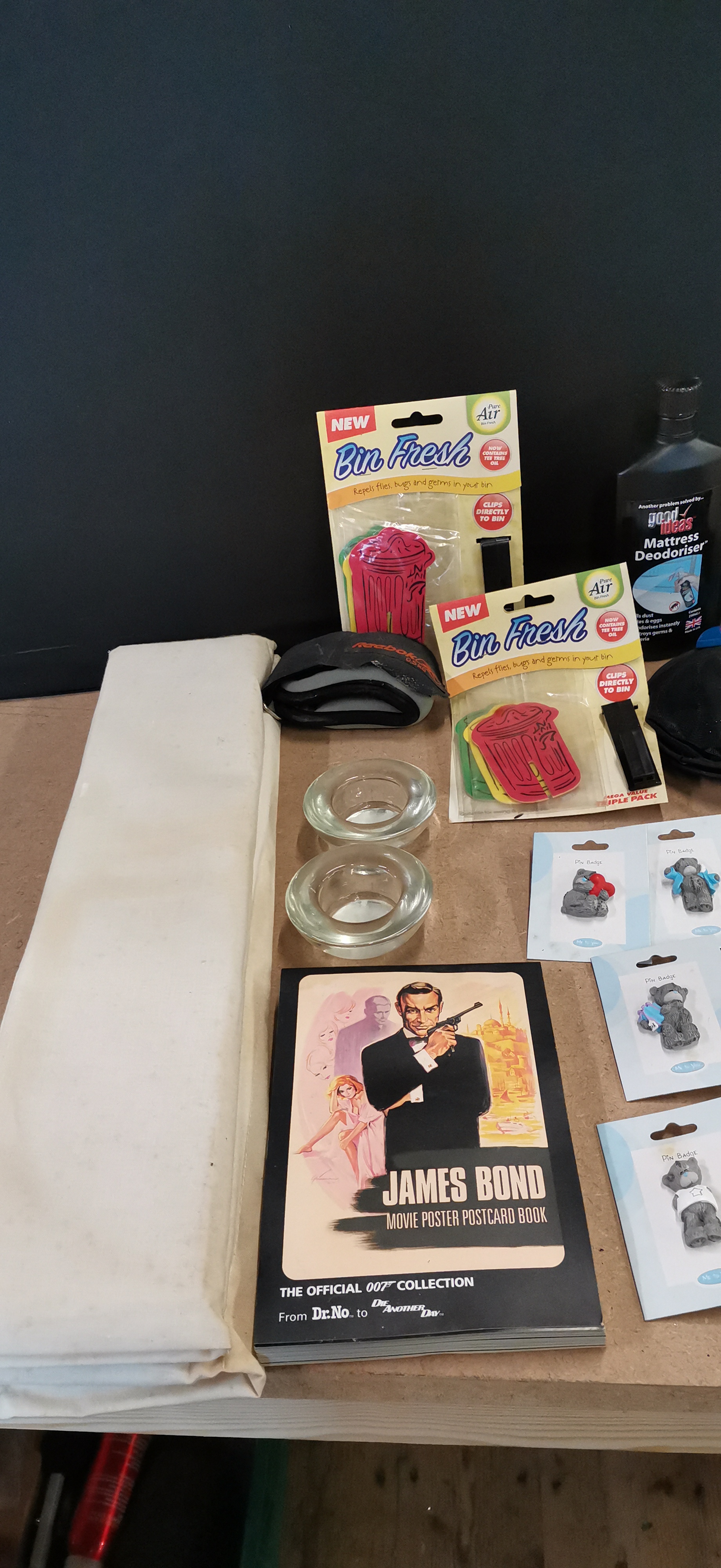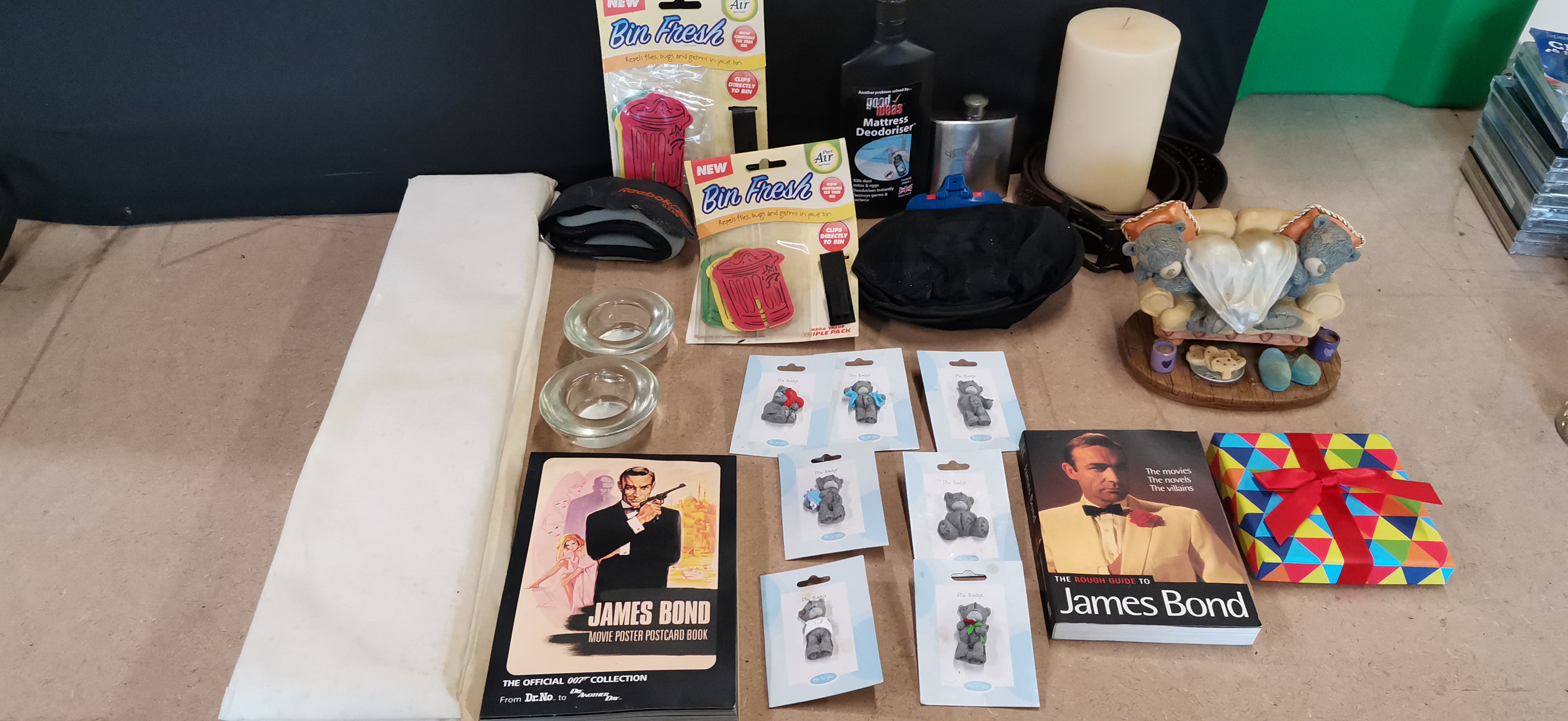 A group of mixed items including James Bond books, Me to You bear pin badges and figurine, household cleaning products, candle holders, and a hip flask.