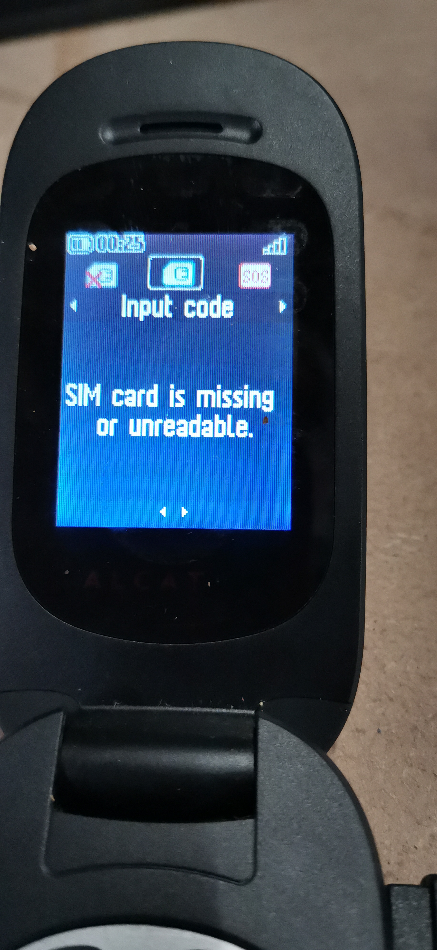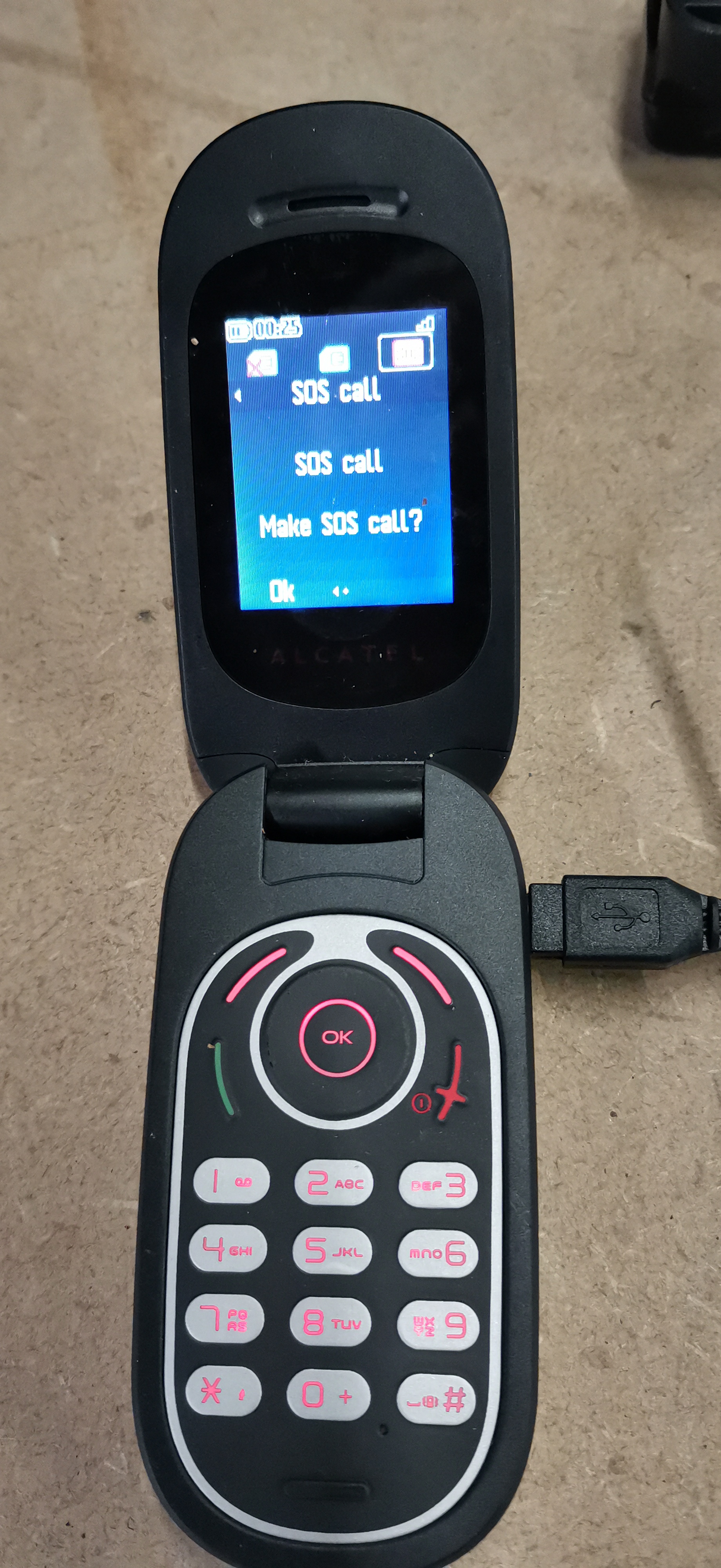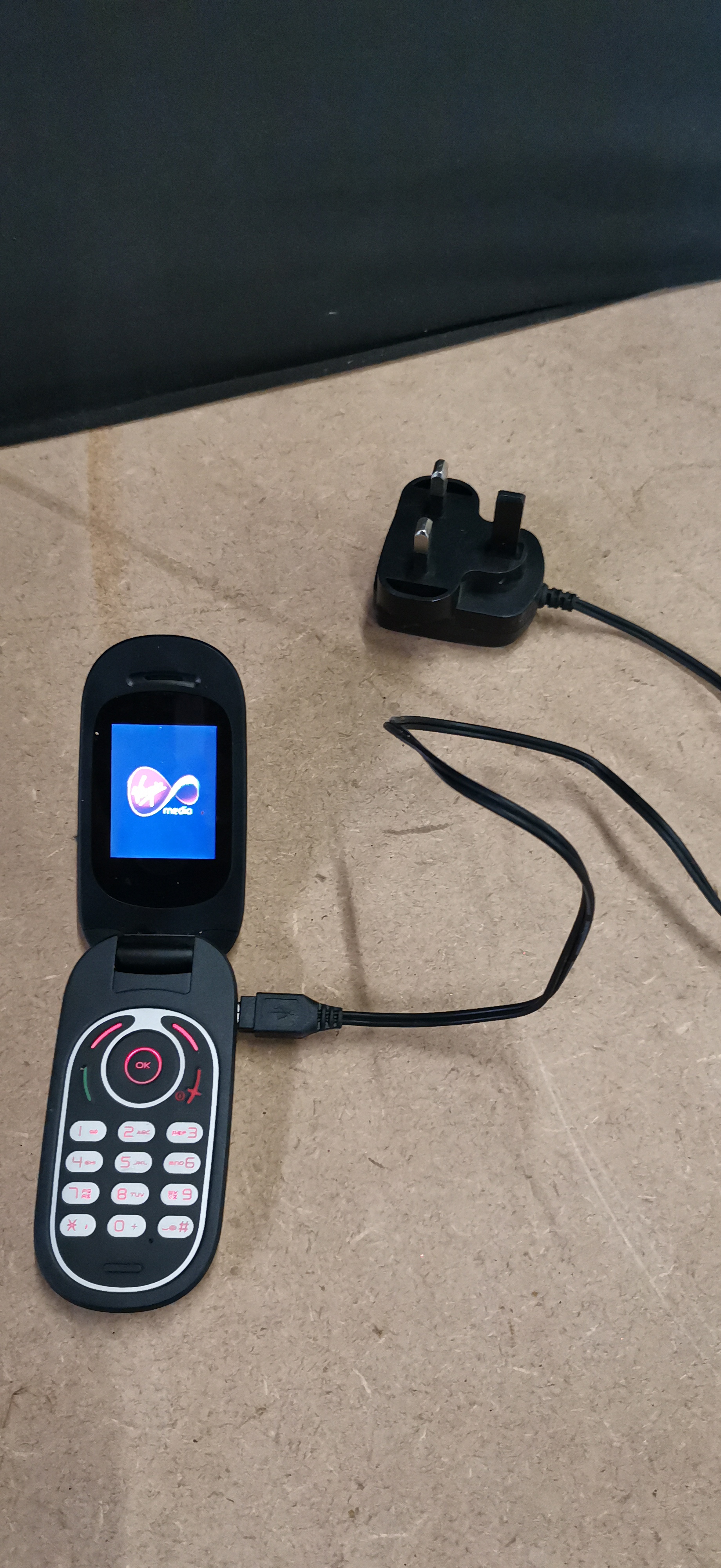 A black Alcatel flip phone featuring a Virgin Media logo on the screen, accompanied by a USB charging cable and a UK three-pin power adapter.