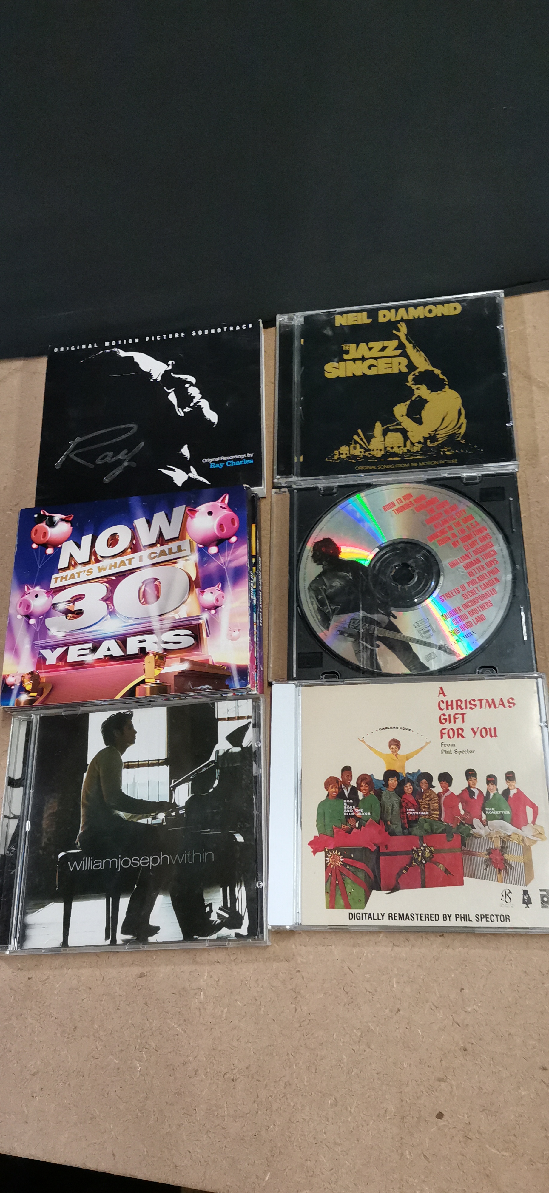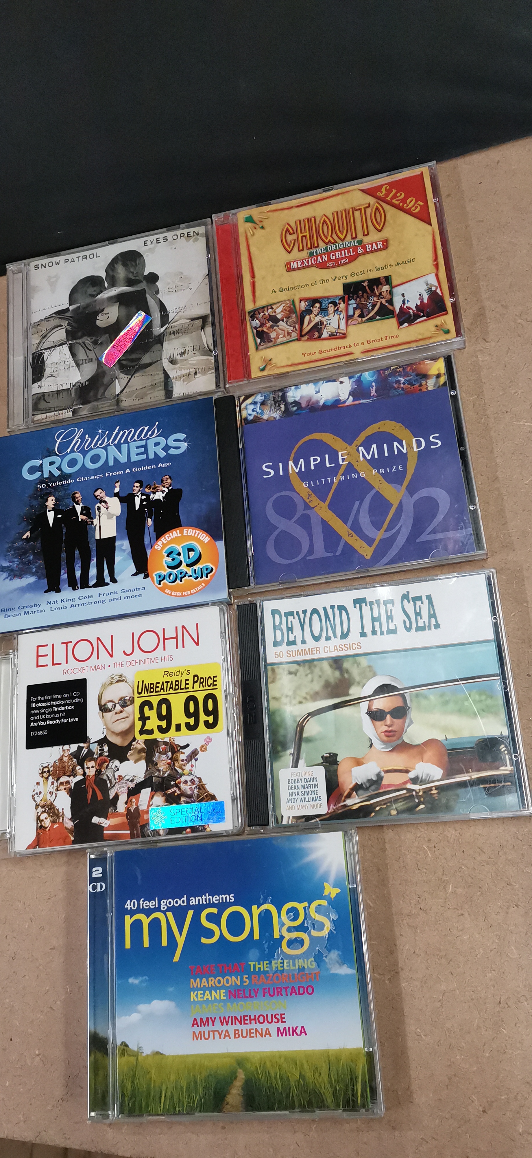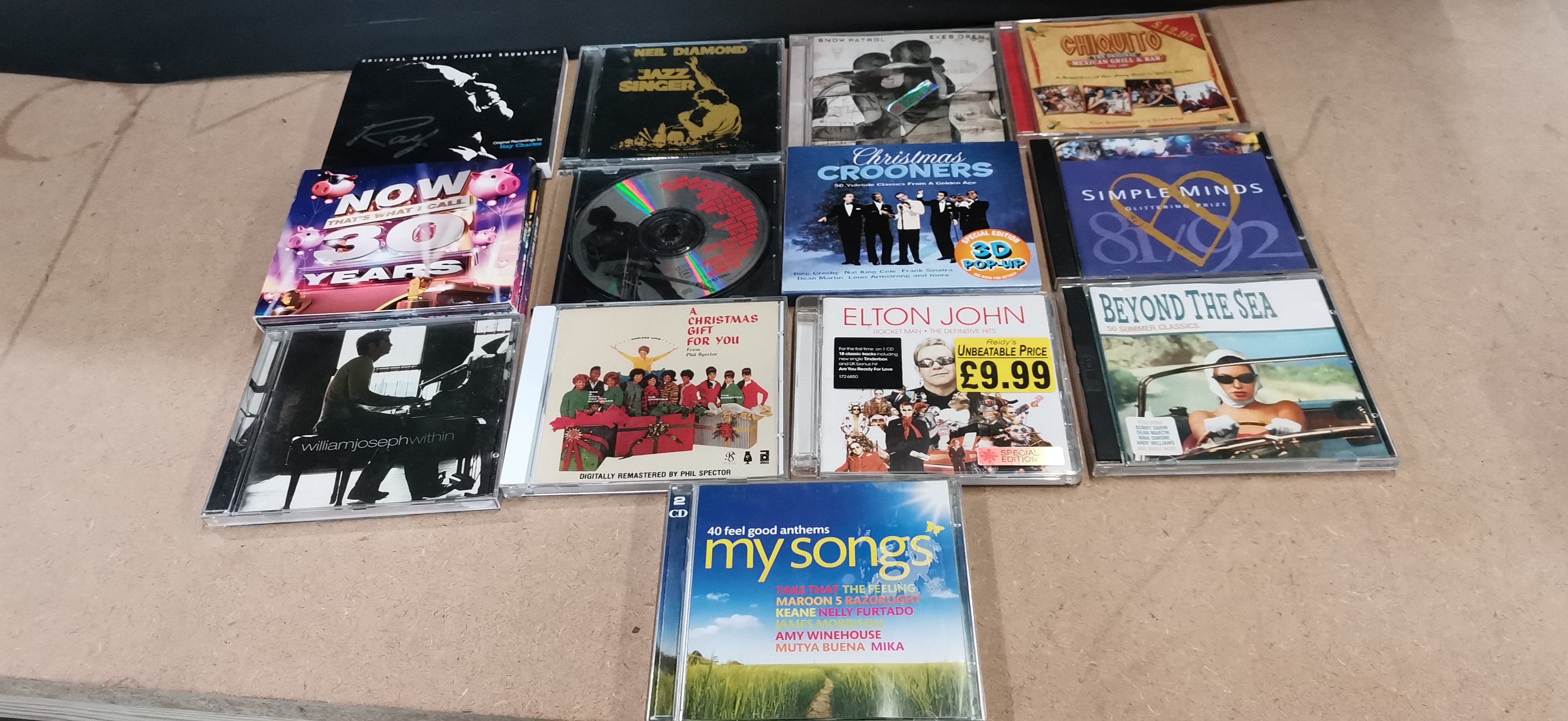A collection of assorted music CDs in jewel cases featuring various artists and compilations including Elton John, Neil Diamond, and Snow Patrol.