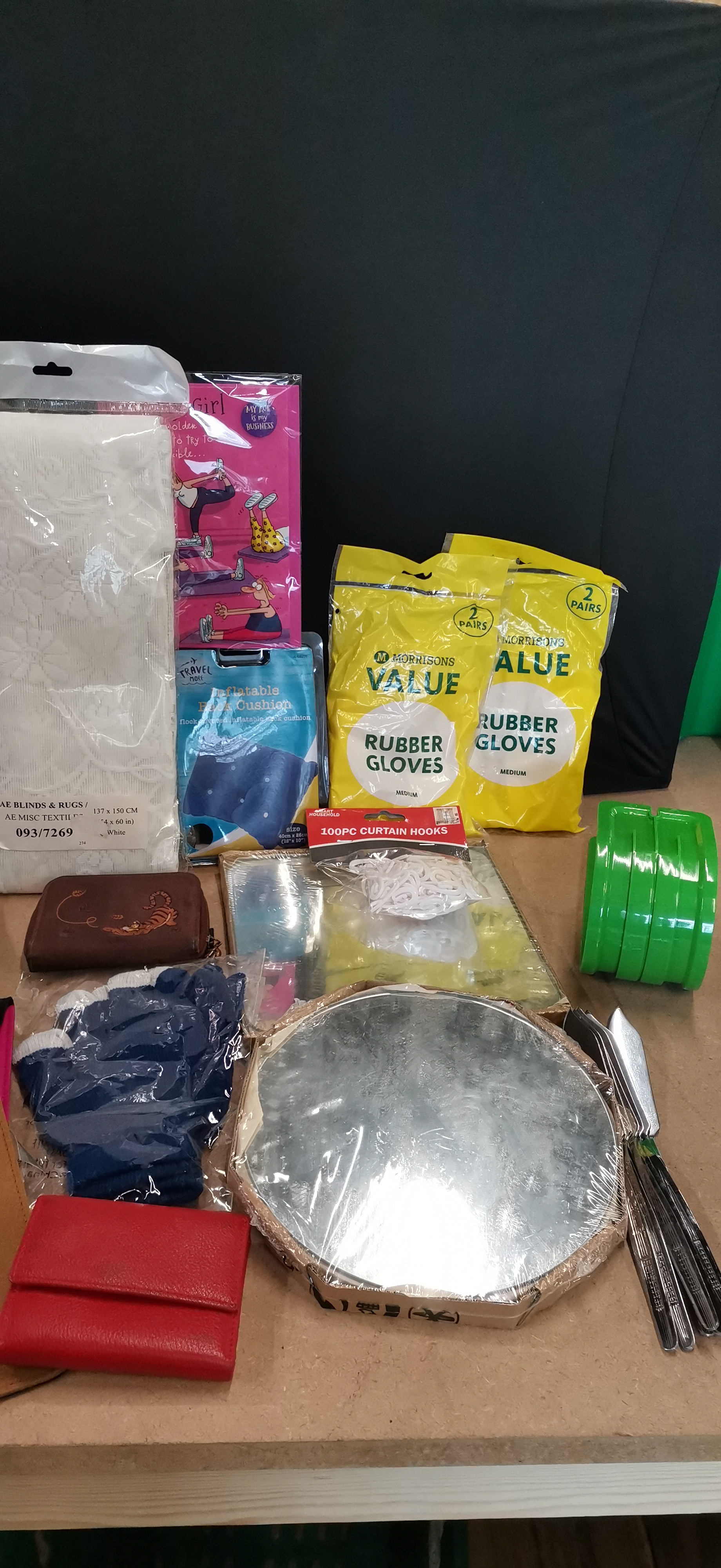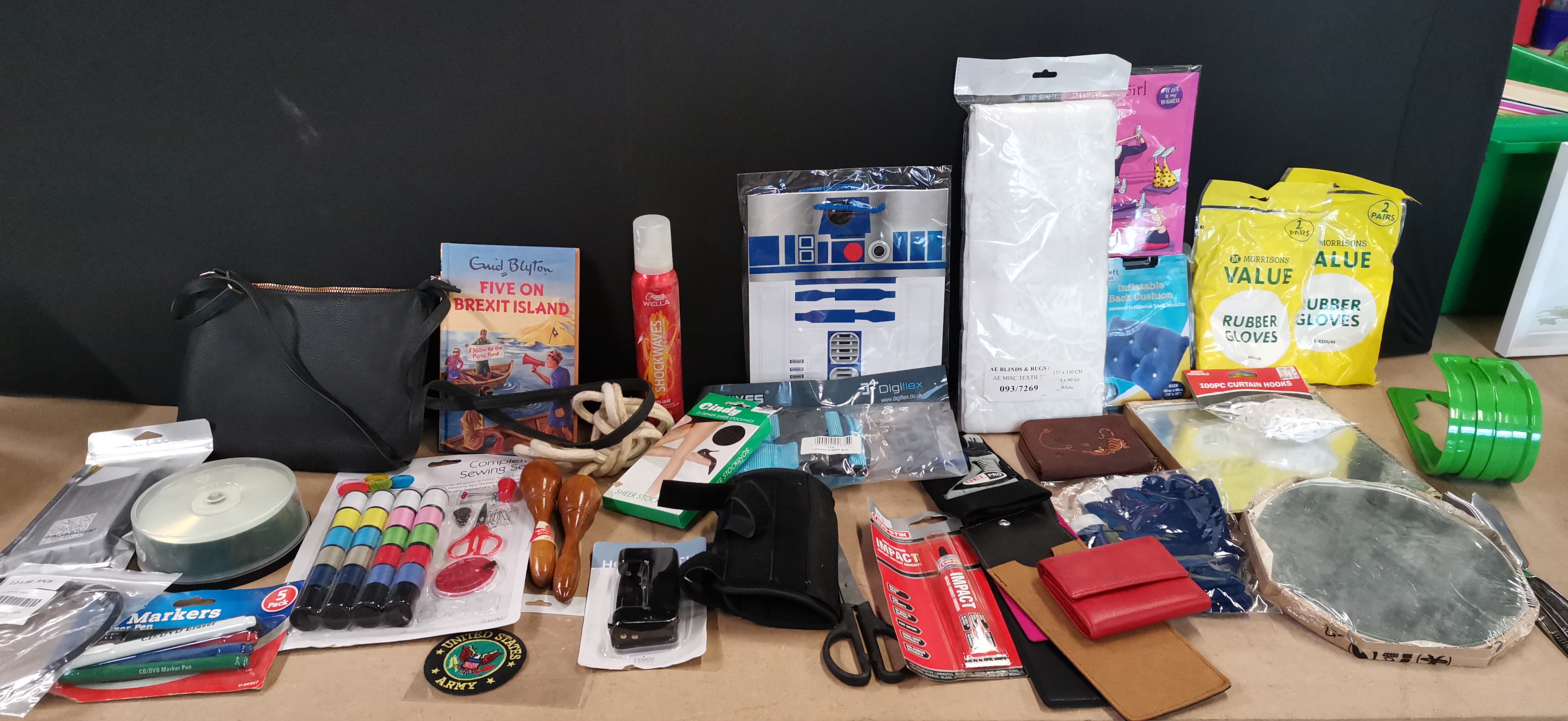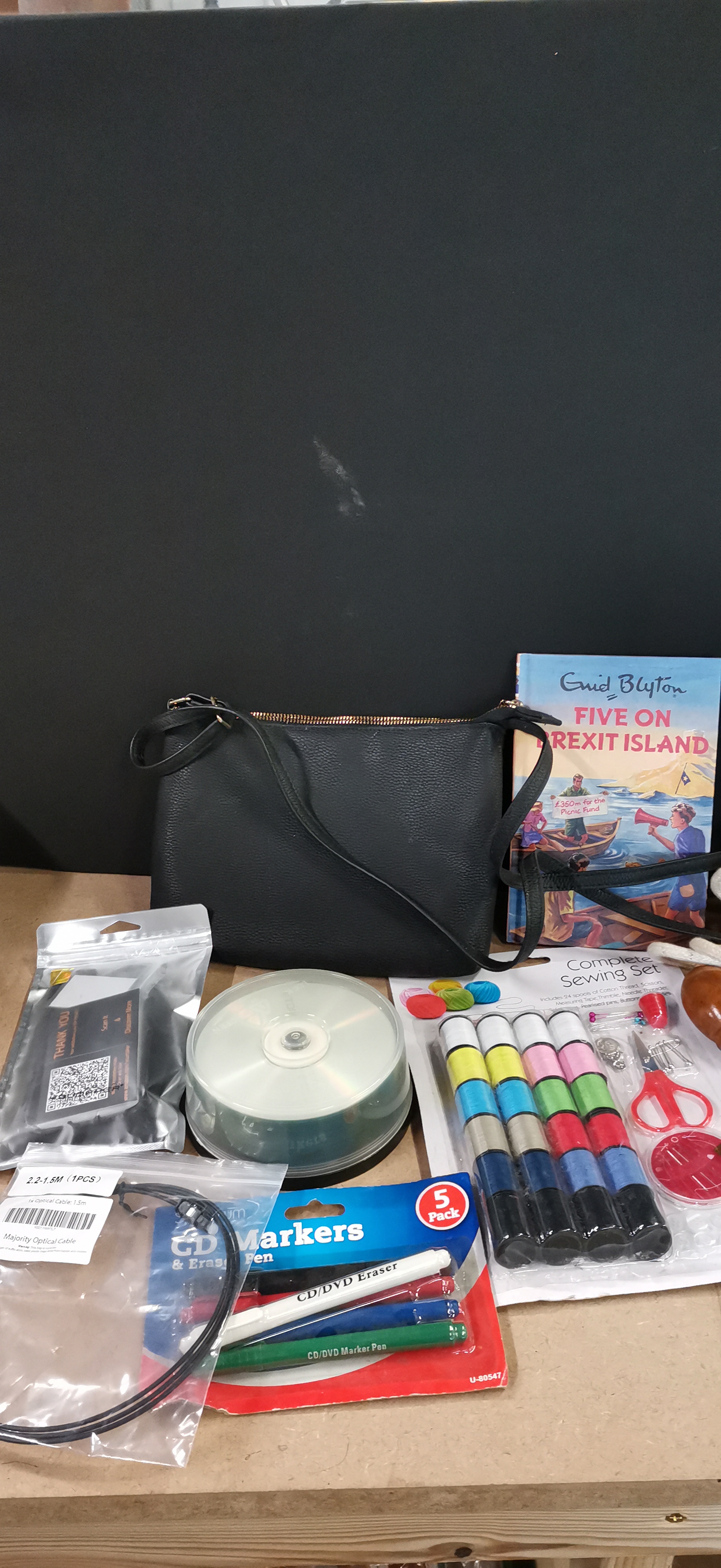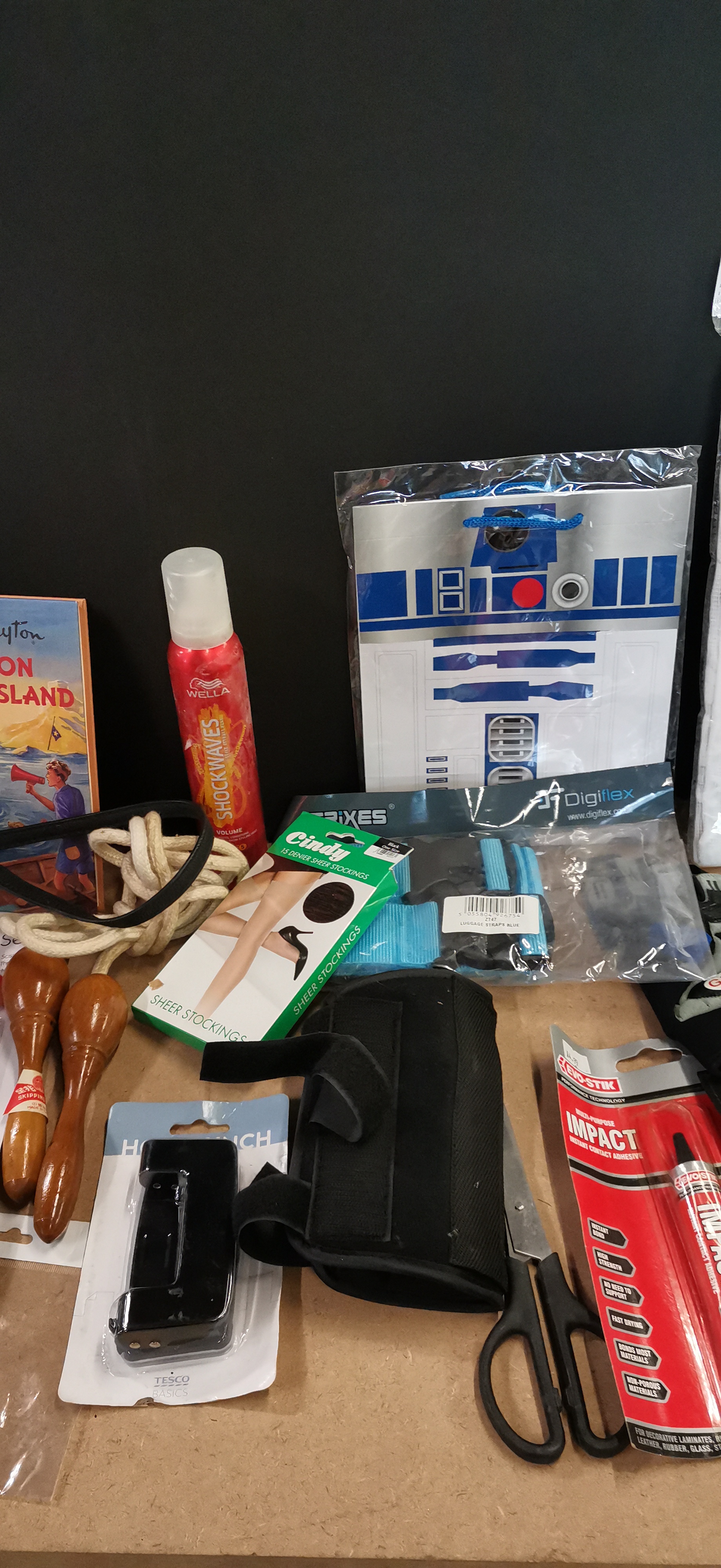 A collection of multi-coloured miscellaneous items including a black handbag, Enid Blyton Five on Brexit Island book, Wella Shockwaves mousse, Morrisons Value rubber gloves, a sewing set, Evo-Stik adhesive, a United States Army patch, and Cindy sheer stockings.