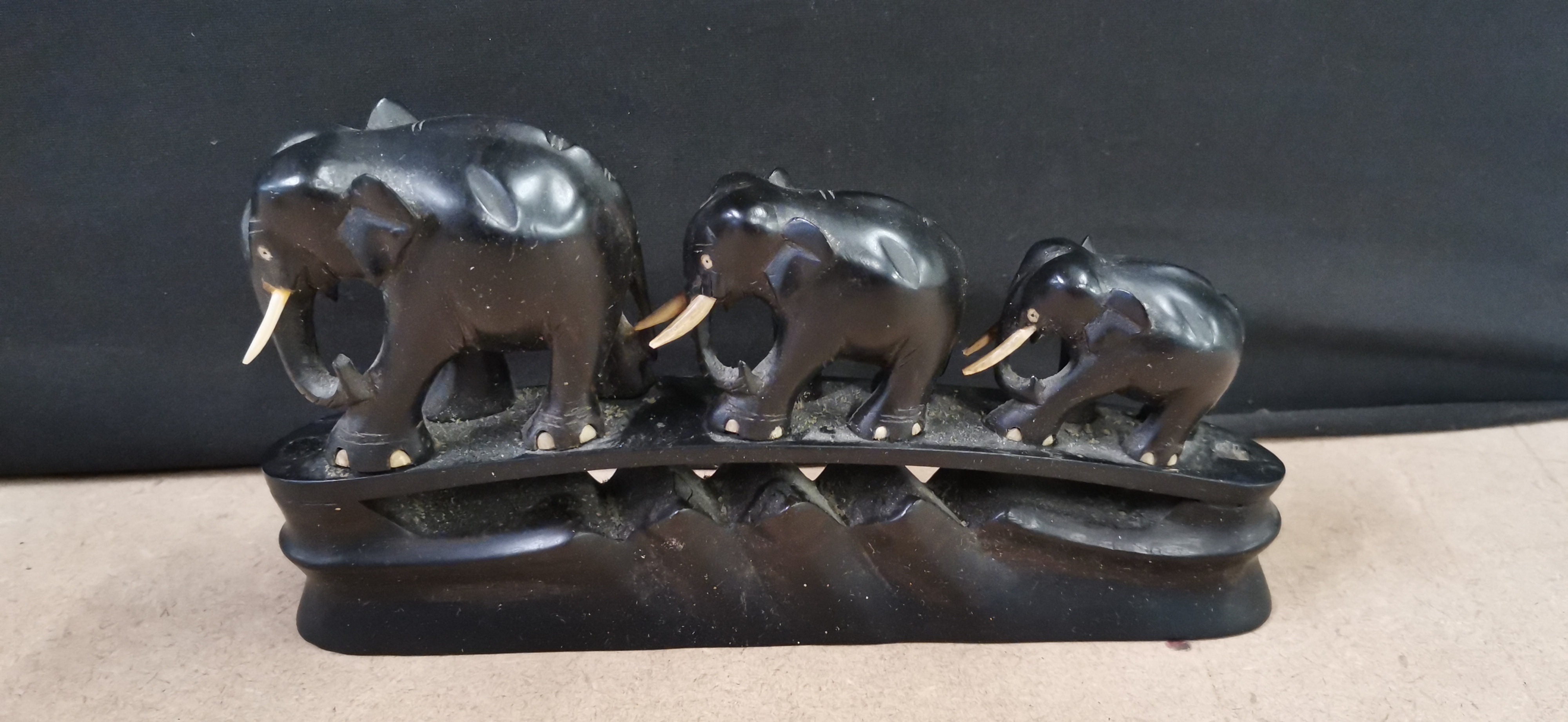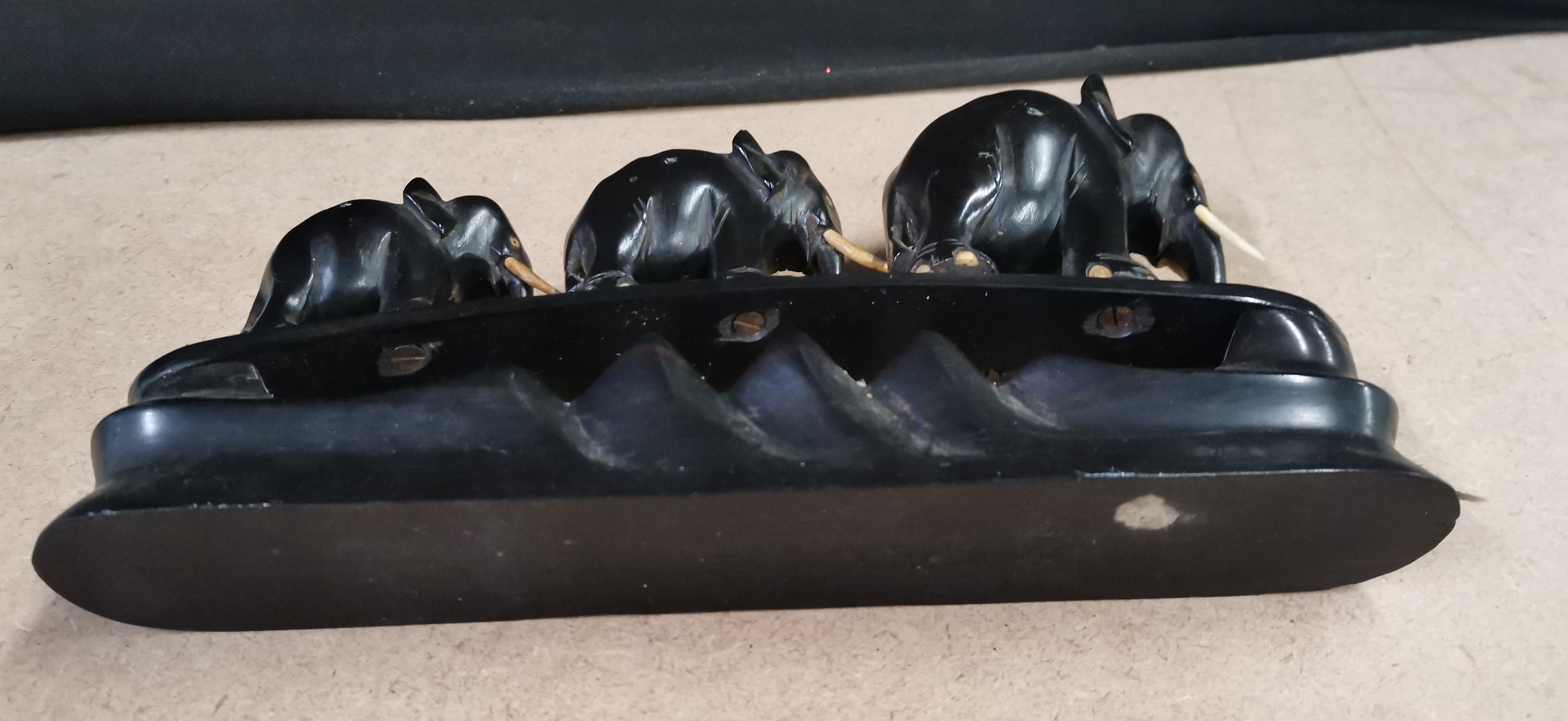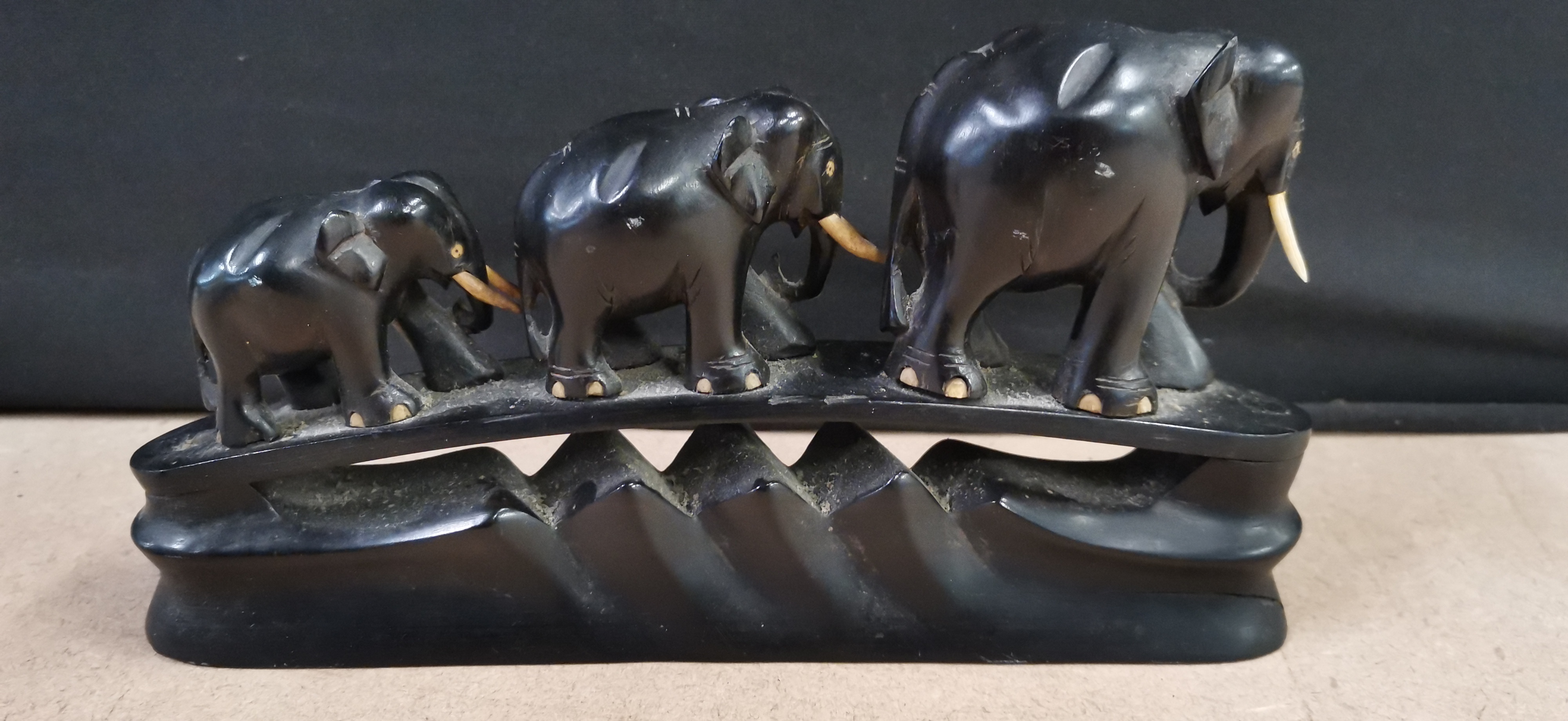 graduated carved ebony elephants with white tusks mounted on a single base, measuring approximately 125mm in length.