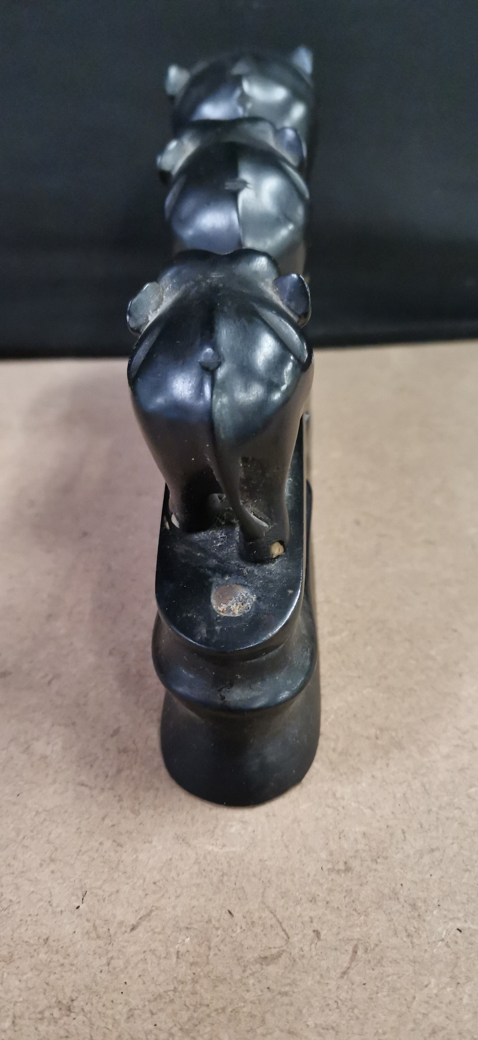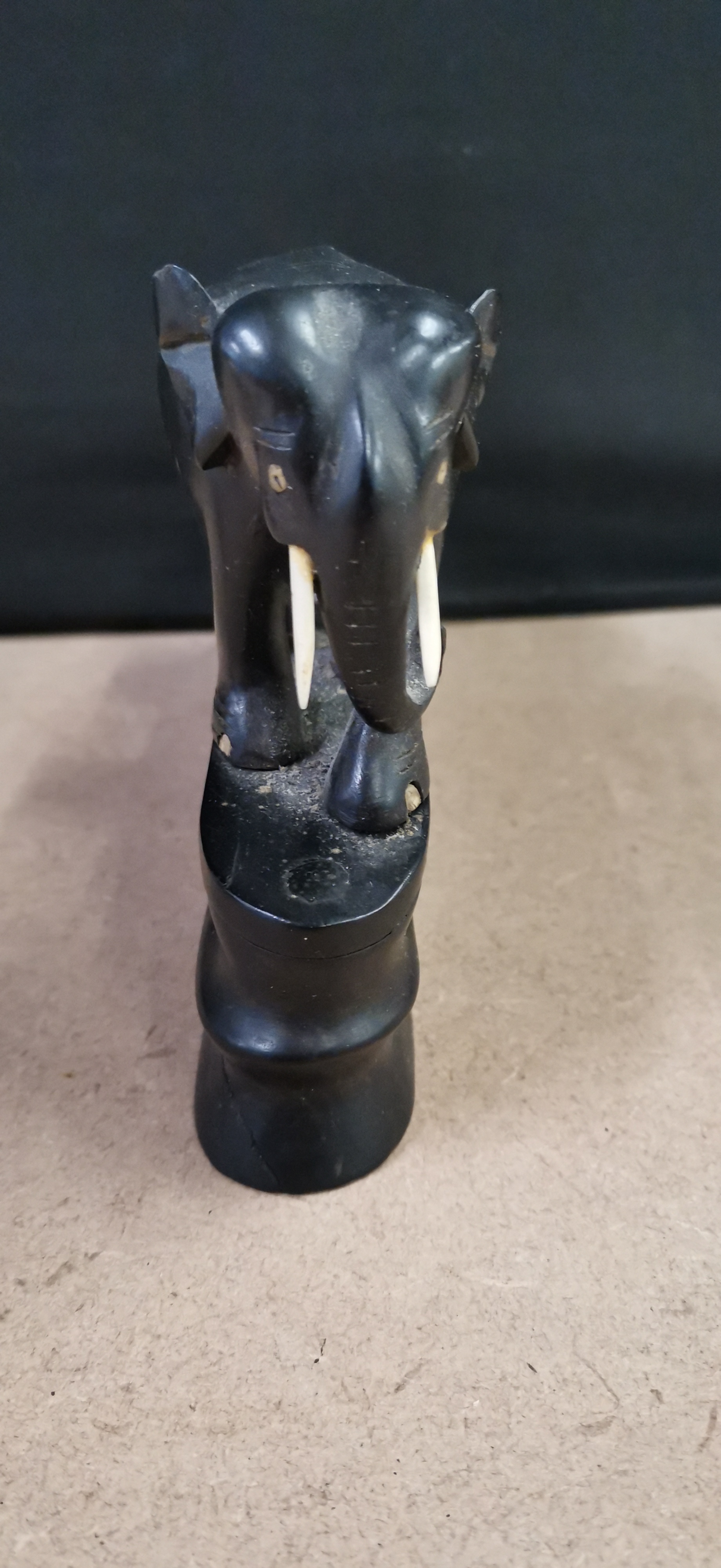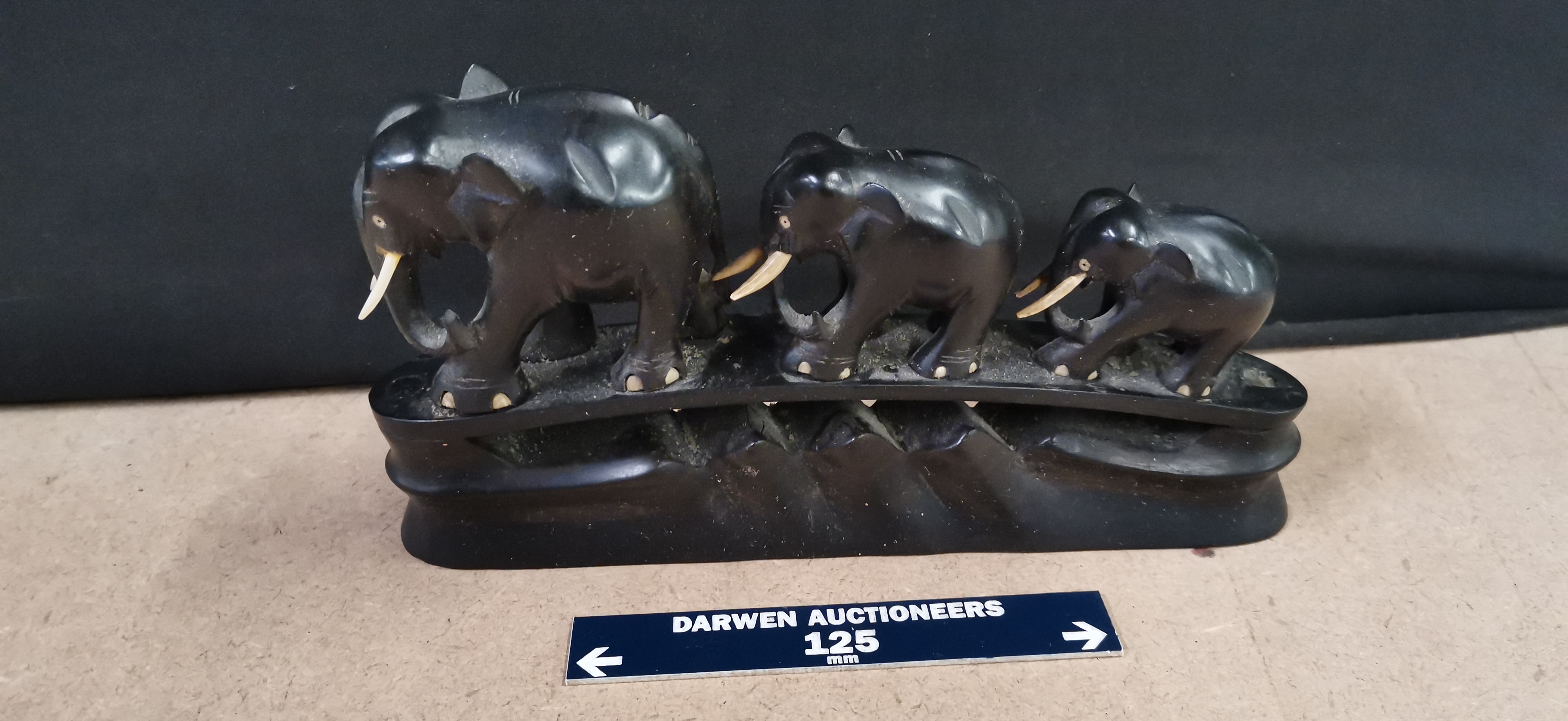 graduated carved ebony elephants with white tusks mounted on a single base, measuring approximately 125mm in length.
