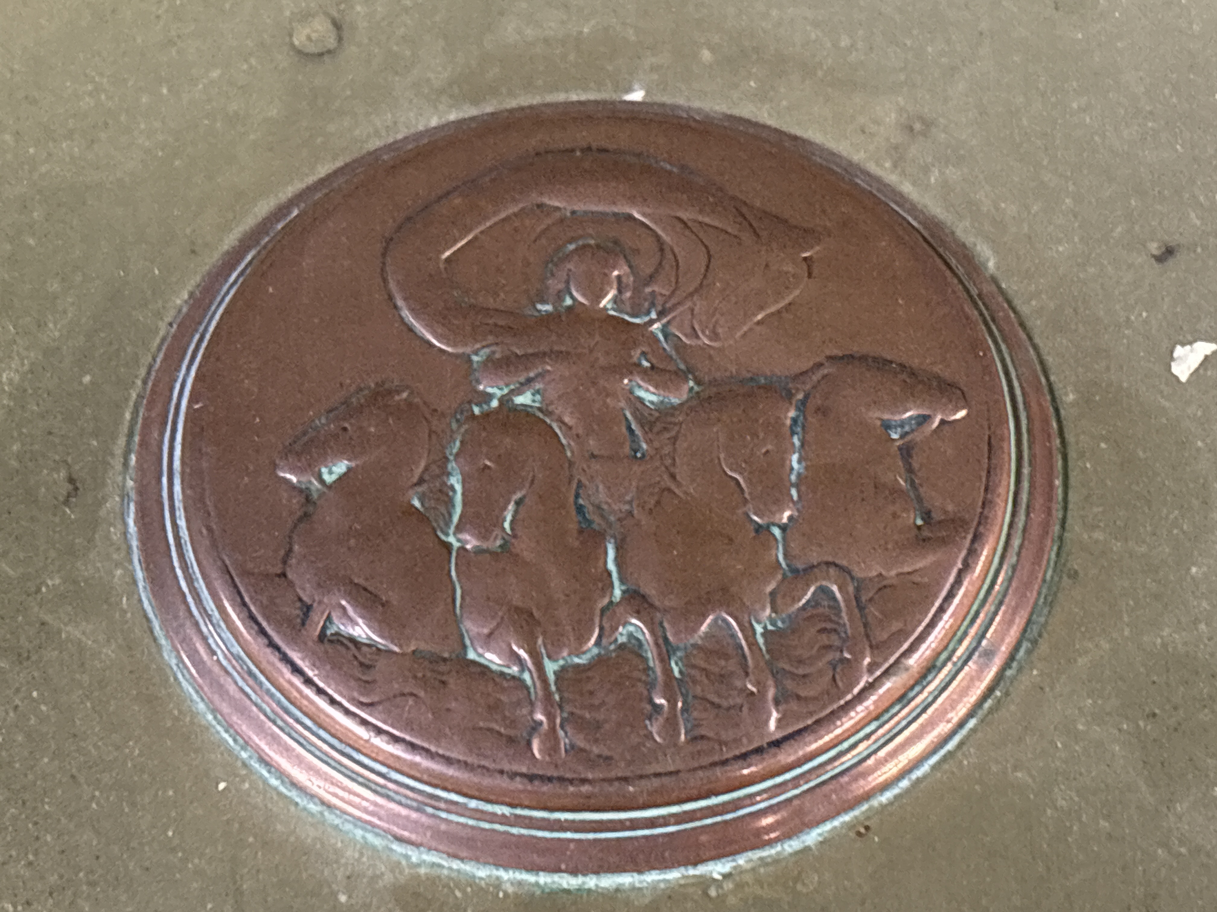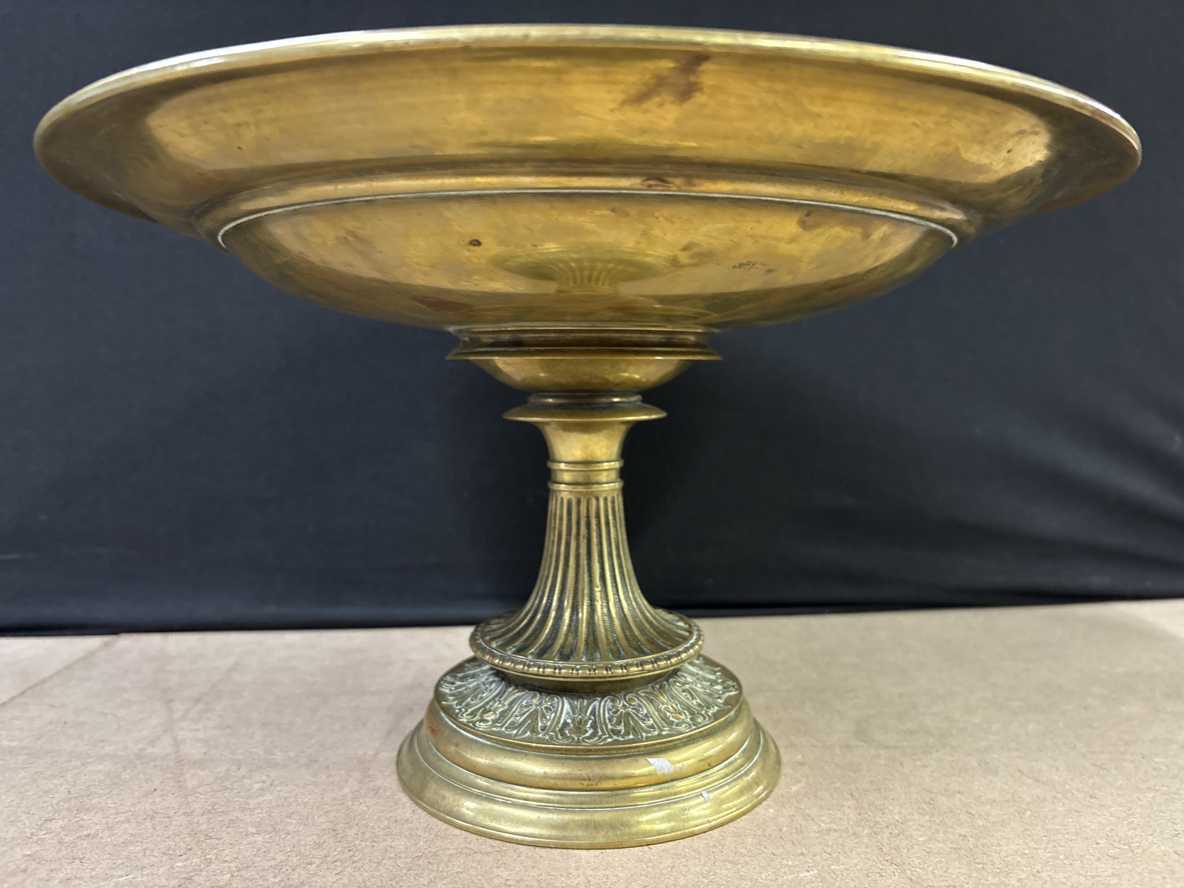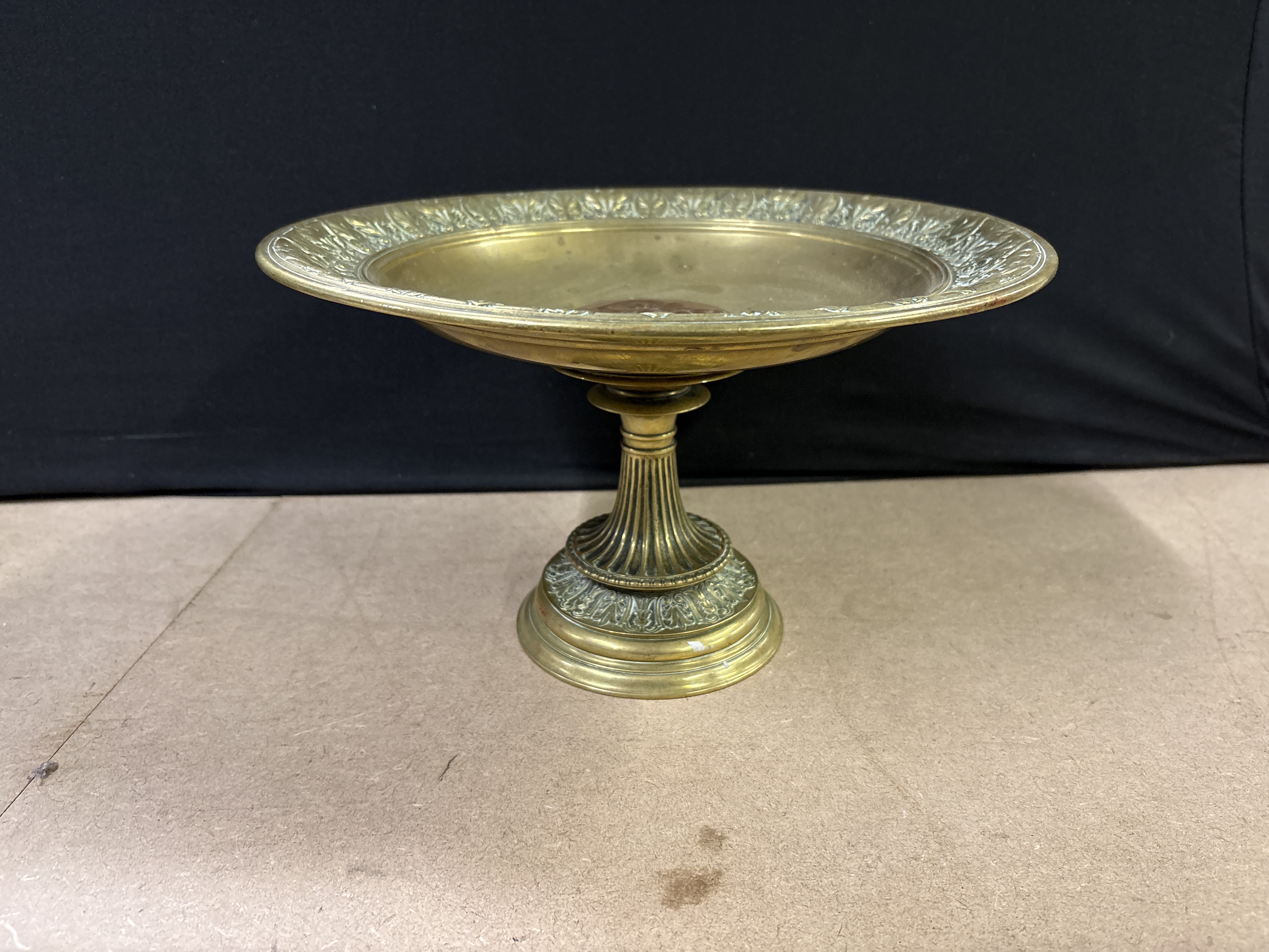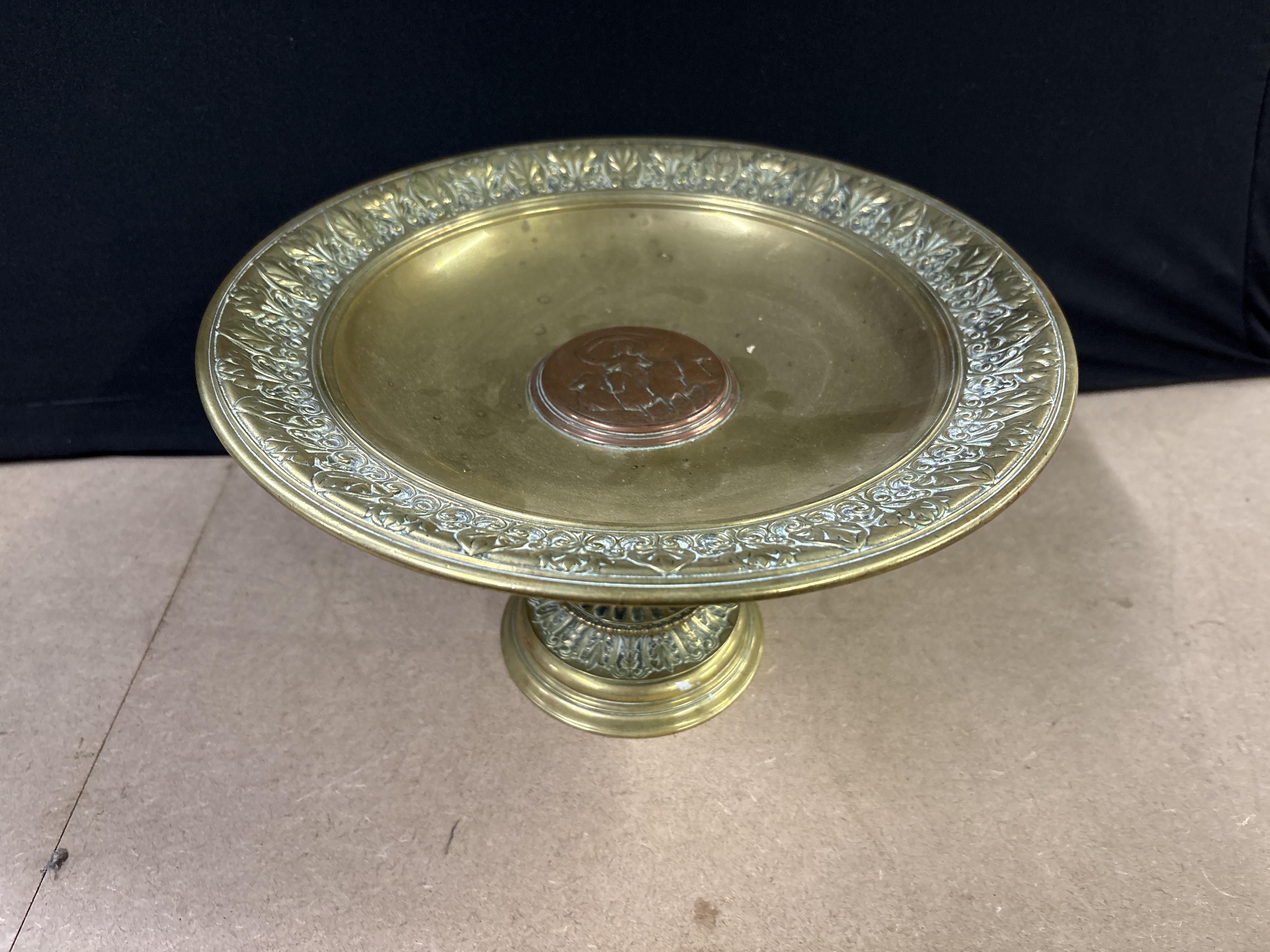 A large brass pedestal dish featuring embossed decorative borders on the rim and base, centred by a copper-toned medallion depicting a figure driving a four-horse chariot.