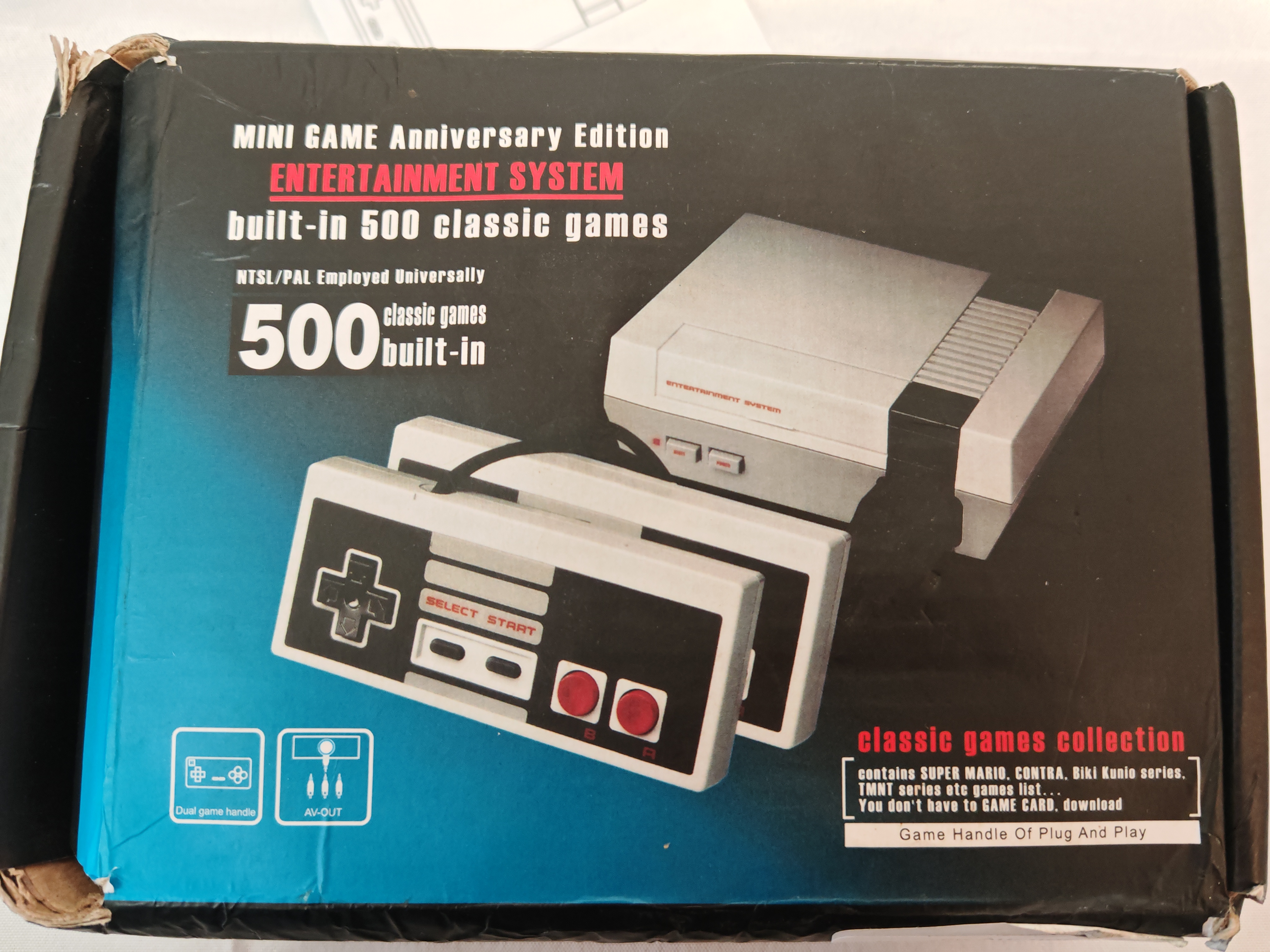 This is a third-party “Mini Game Anniversary Edition” entertainment system, designed as a compact plug-and-play tribute to classic 8-bit home video game hardware. The console is constructed from grey and black moulded plastic and comes pre-loaded with 500 built-in games, including titles such as Super Mario and Contra. The system is designed for universal compatibility with NTSC and PAL television standards. The lot includes the main console unit, two wired controllers with red action buttons, an AV cable, a power adapter with a UK plug converter, a printed game list, and a dual-language instruction manual. The console and peripherals are housed in their original retail packaging. Console dimensions approximately 130mm x 100mm x 45mm.