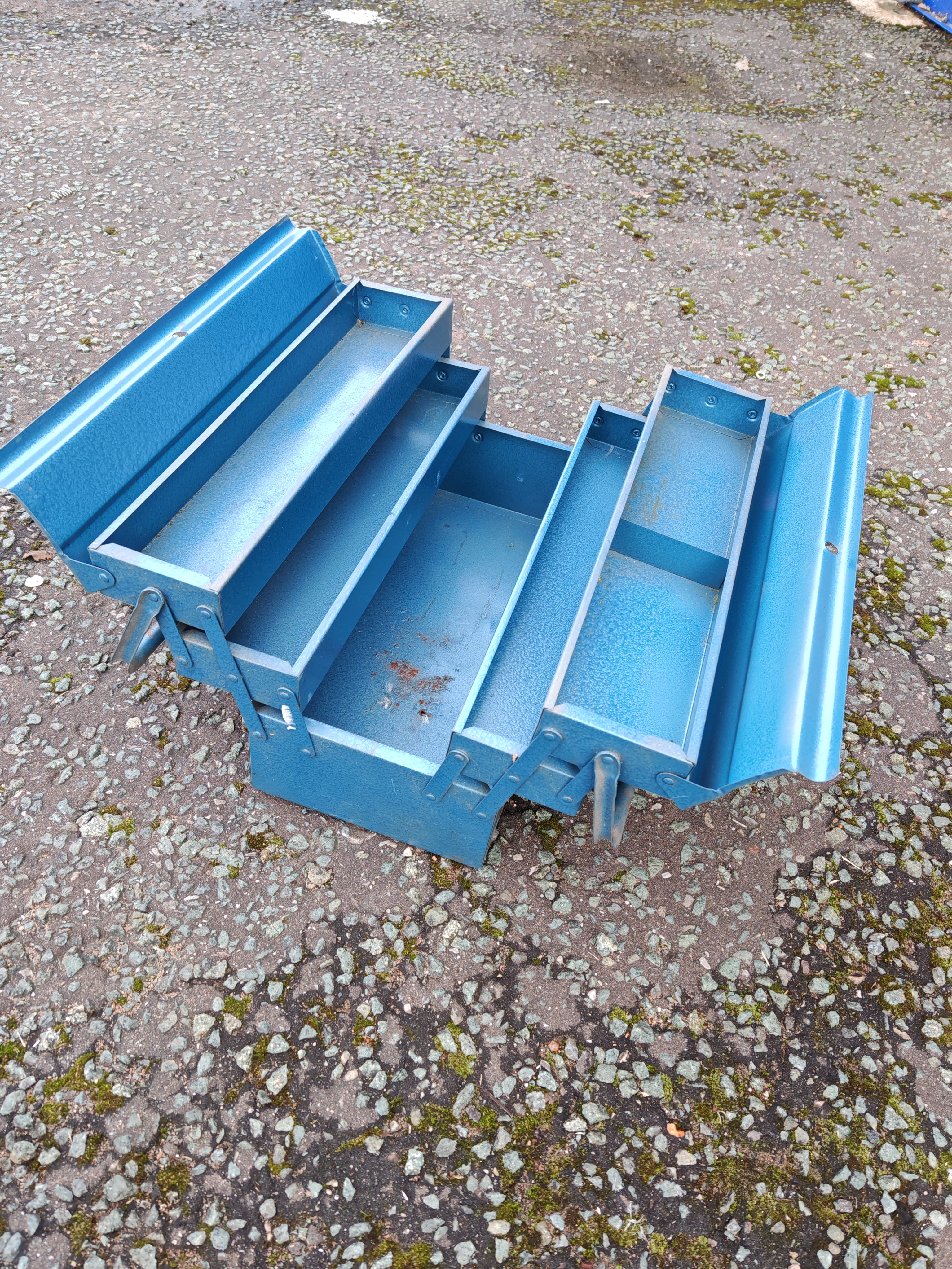 An unmarked industrial-style cantilever tool chest manufactured from painted steel with a blue hammered textured finish. This mid-to-late 20th-century design features a five-compartment layout with two hinged top lids and dual tubular steel handles. The cantilever mechanism is in smooth working order, allowing the box to expand and reveal four shallow organisational trays and a deep central storage well. No patent dates are visible on the unit.