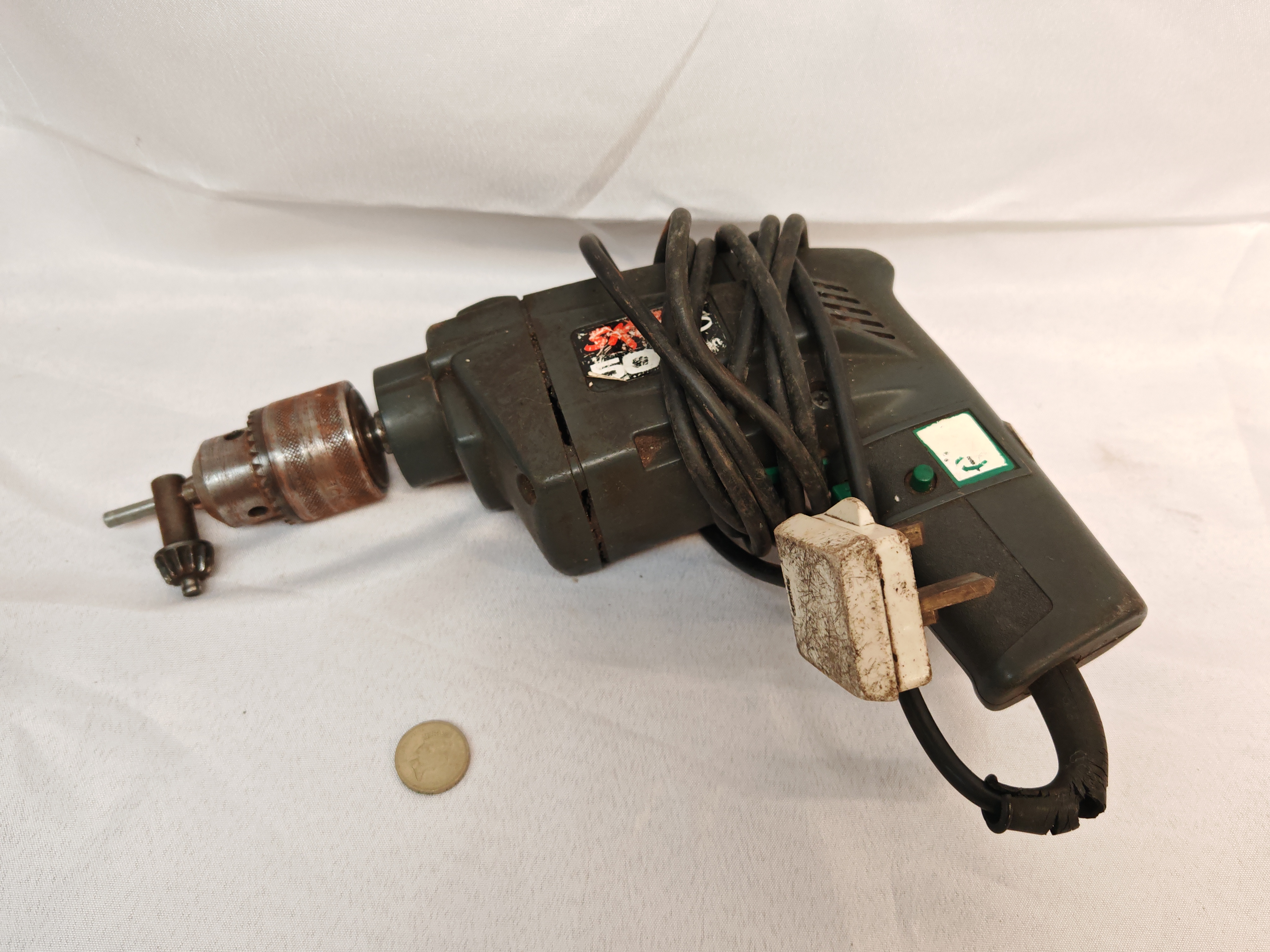 A vintage Skil corded electric power drill, model 6225, featuring a dark green plastic housing and a metal geared chuck. This 1/3 HP tool is designed for variable speed reversing operation. The unit is supplied with a metal chuck key.