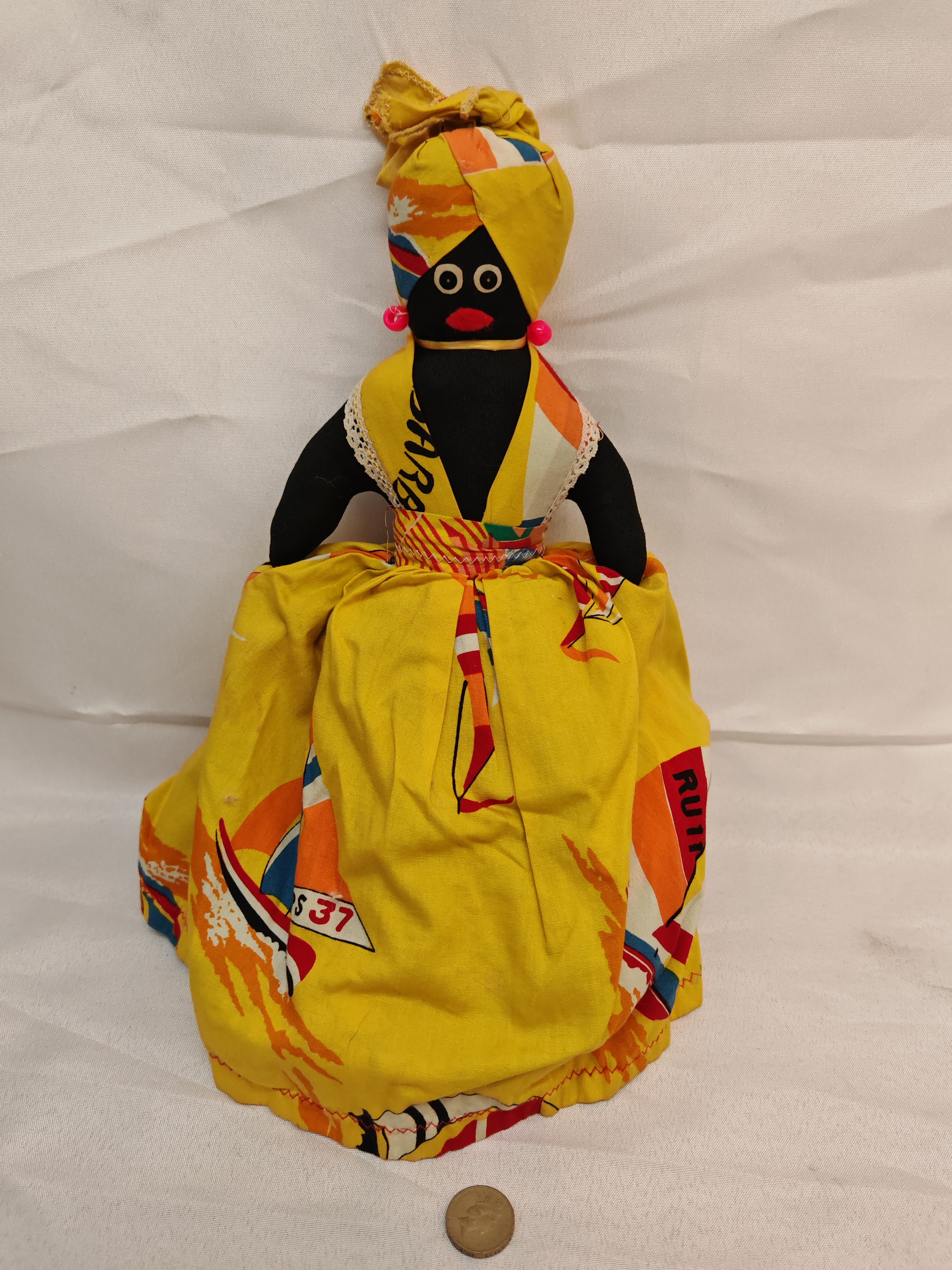 Handcrafted, cloth topsy-turvy souvenir doll. This unmarked reversible doll features two distinct upper bodies joined at a common waist, concealed by a full skirt. Both figures feature fixed eyes made of applied plastic or bead-like components and integral fabric head wraps. The original clothing is integral to the doll’s construction; one side features a turquoise dress with a tropical floral and foliage print, while the alternate side features a yellow dress with a nautical travel-themed print including sailboats and partial text referencing Barbados.