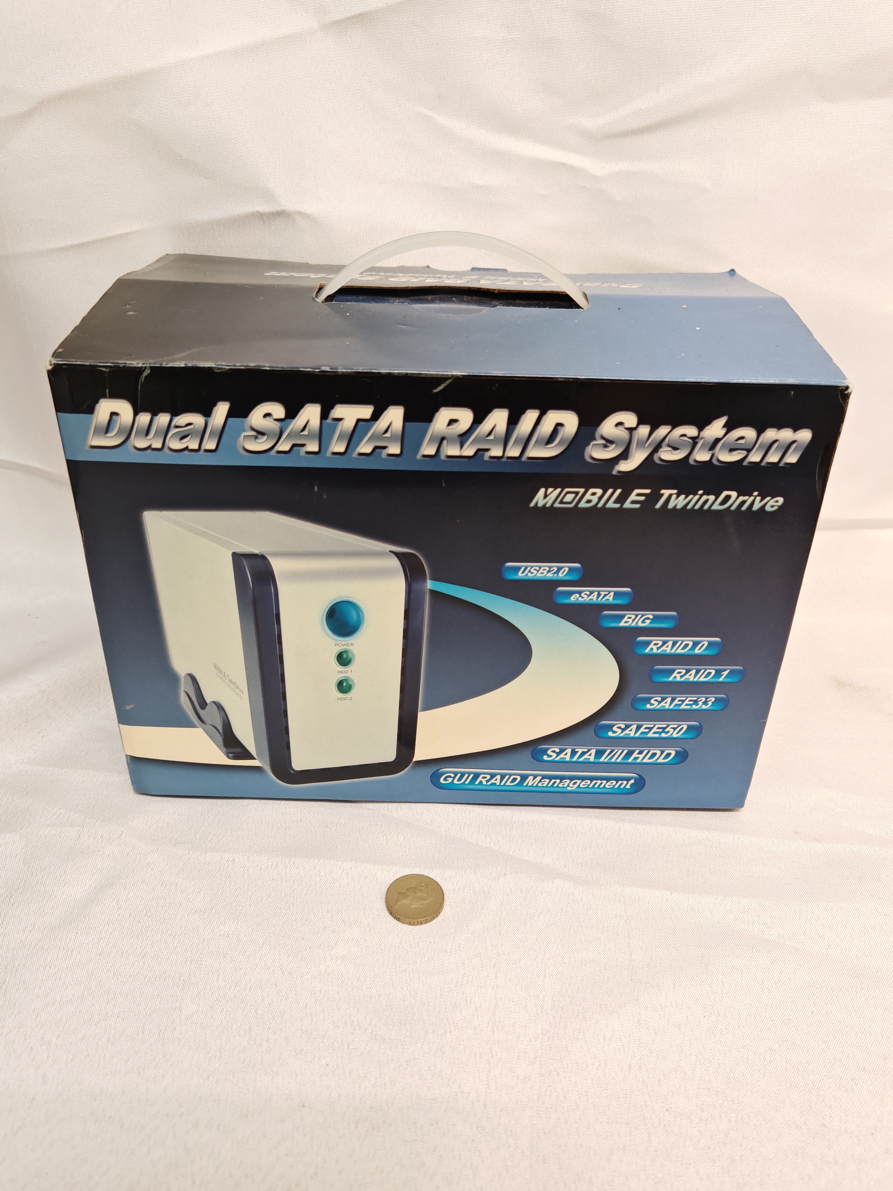 A MOBILE TwinDrive Dual SATA RAID System, designed as a versatile external storage solution for 3.5-inch SATA I and II hard disk drives. The unit features a compact vertical tower design finished in an off-white and black colour scheme, equipped with front-mounted LED indicators for power and dual drive activity. This hardware supports multiple RAID configurations to suit various data security and performance needs, including RAID 0, RAID 1, SAFE33, SAFE50, and BIG (JBOD) modes. Connectivity is provided through both USB 2.0 and high-speed eSATA interfaces, and the system is compatible with GUI RAID Management software. Such devices were essential for professional and home-office data redundancy during the transition to high-capacity SATA storage in the mid-to-late 2000s. Box dimensions approximately 280mm x 180mm x 150mm.