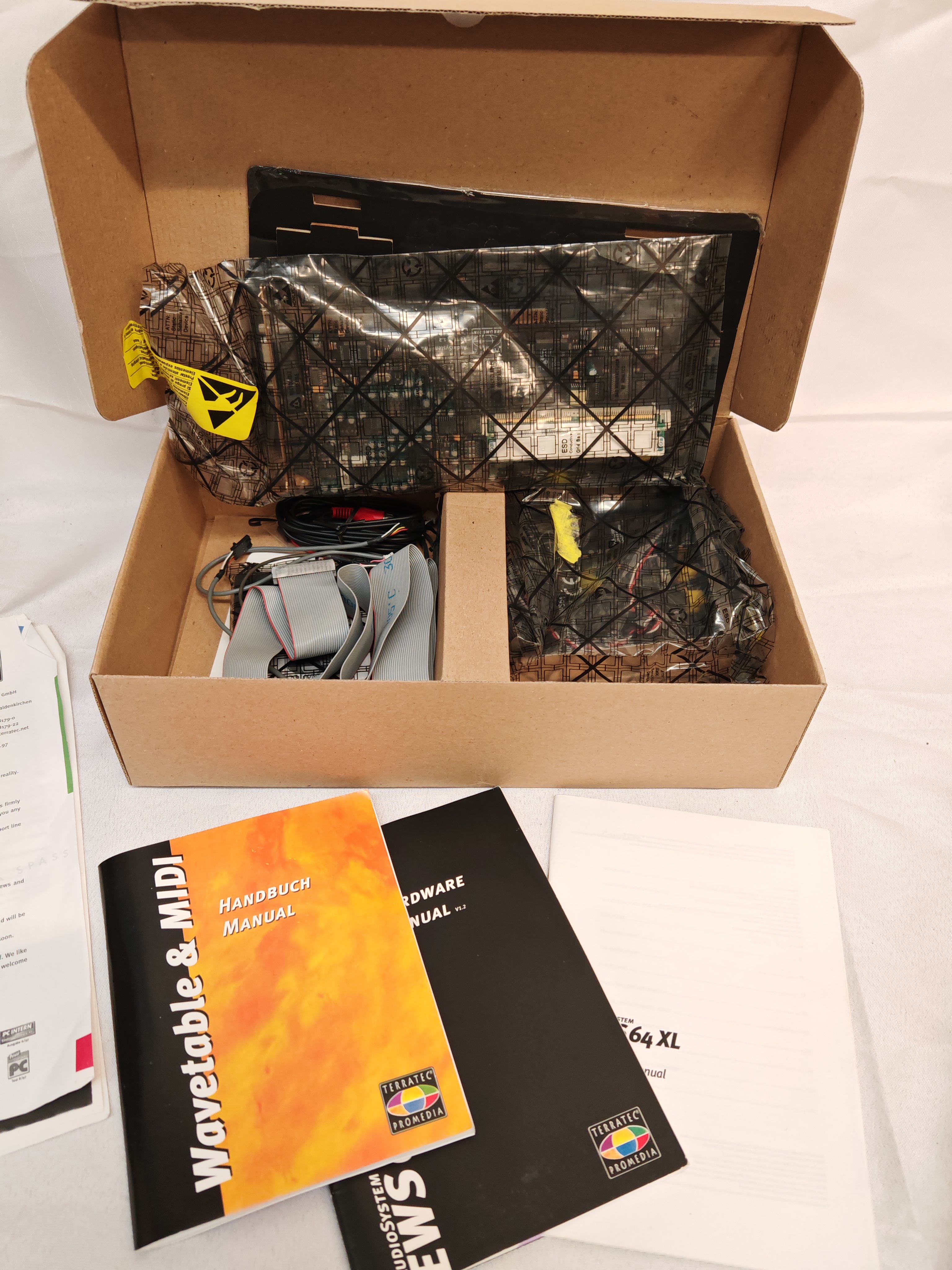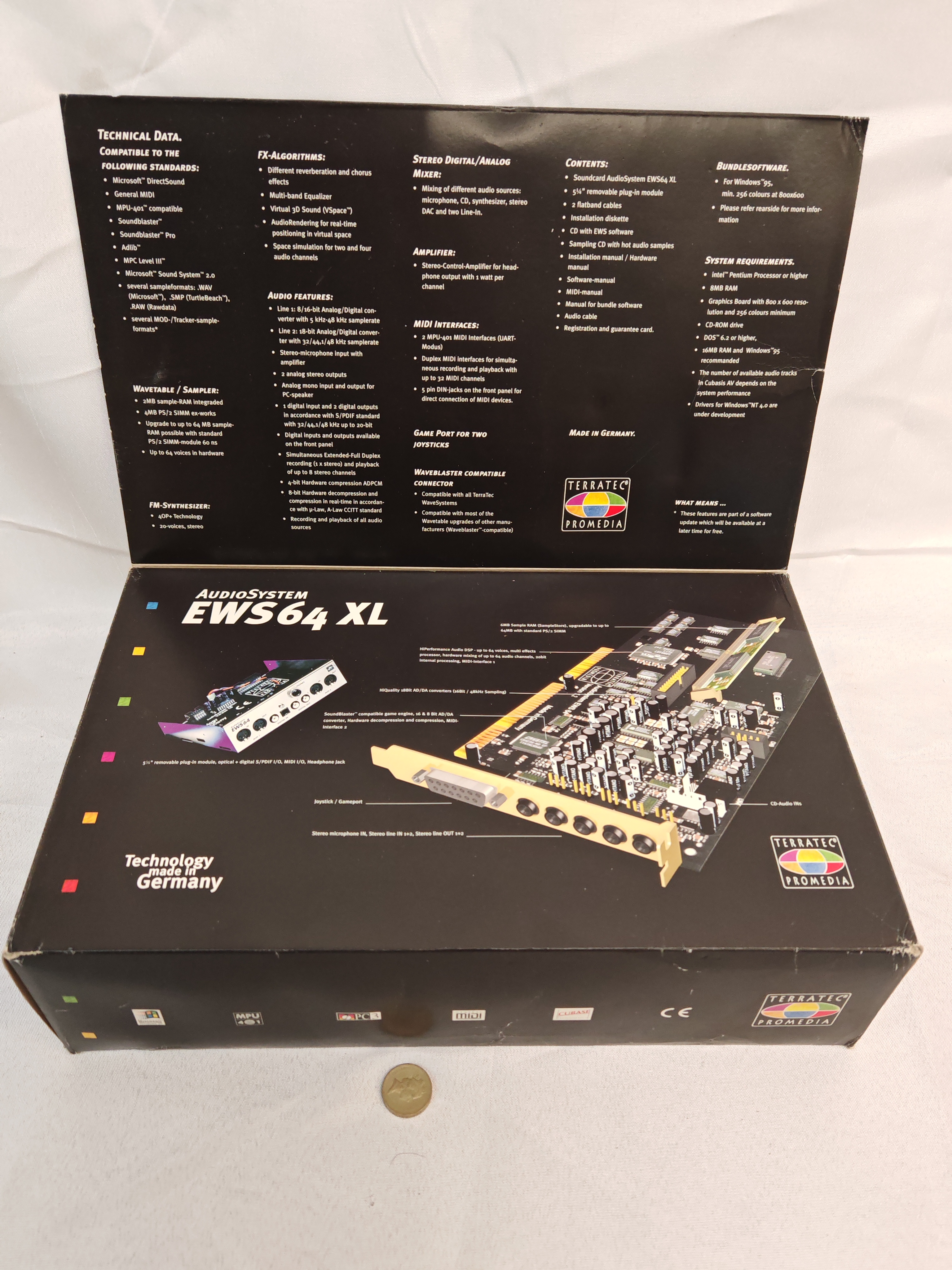 Manufacturer: TerraTec PROMEDIA. Model: AudioSystem EWS64 XL. Serial: Not visible. Processor: High-performance Audio DSP supporting up to 64 hardware voices and multi-effects processing. RAM: 6MB total onboard memory, comprising 2MB integrated sample RAM and a 4MB PS/2 SIMM module; the system is upgradeable to a maximum of 64MB via a standard 60ns PS/2 SIMM module. Storage: Not applicable. Screen: Not applicable. Accessories: TerraTec AudioSystem EWS64 XL ISA sound card, 5.25 inch removable front-panel plug-in module (breakout box) featuring optical and digital S/PDIF I/O, MIDI I/O, and headphone jack, two internal flatband ribbon cables, various audio and MIDI connector cables, original printed Hardware Manual v1.2, Wavetable and MIDI Manual, and original retail box. Technical specifications include 18-bit Analogue-to-Digital and Digital-to-Analogue converters, an onboard FM-Synthesizer (4OP+ technology, 20-voice stereo), and a wavetable sampler. Data wiping status: Not applicable as the device contains no non-volatile user storage media.
