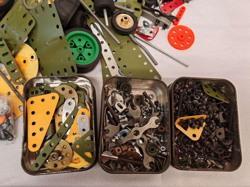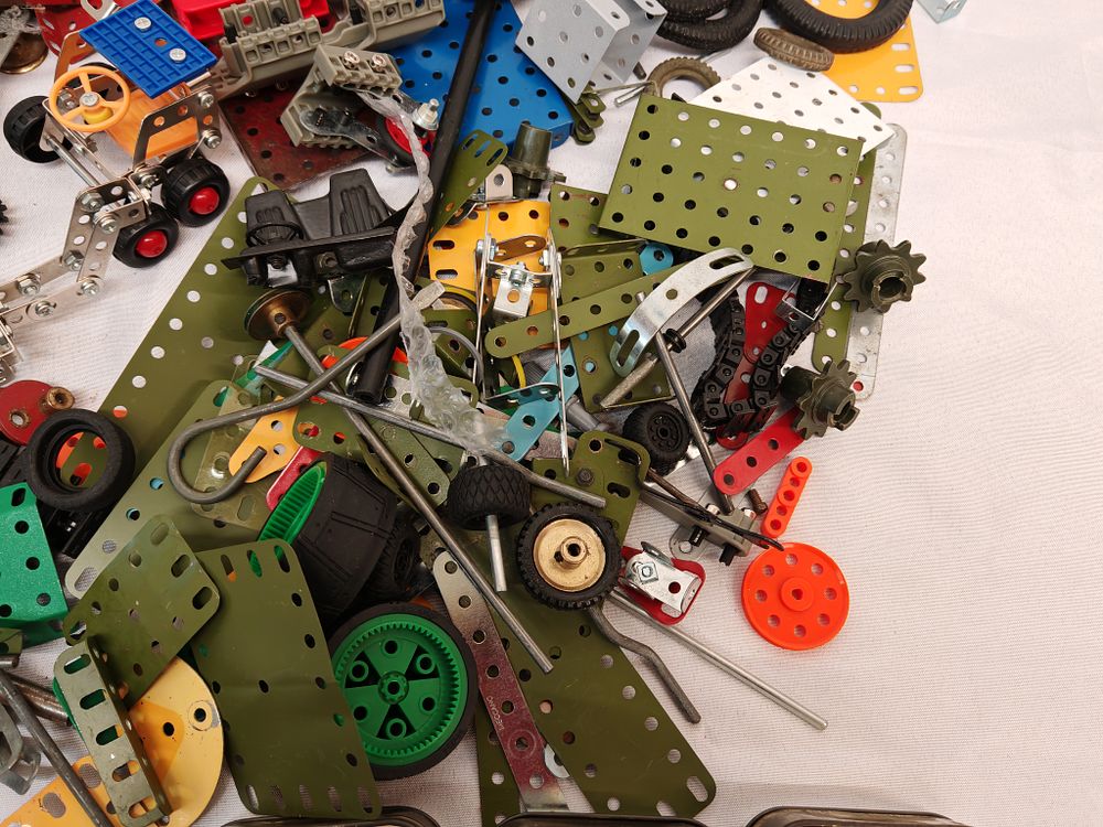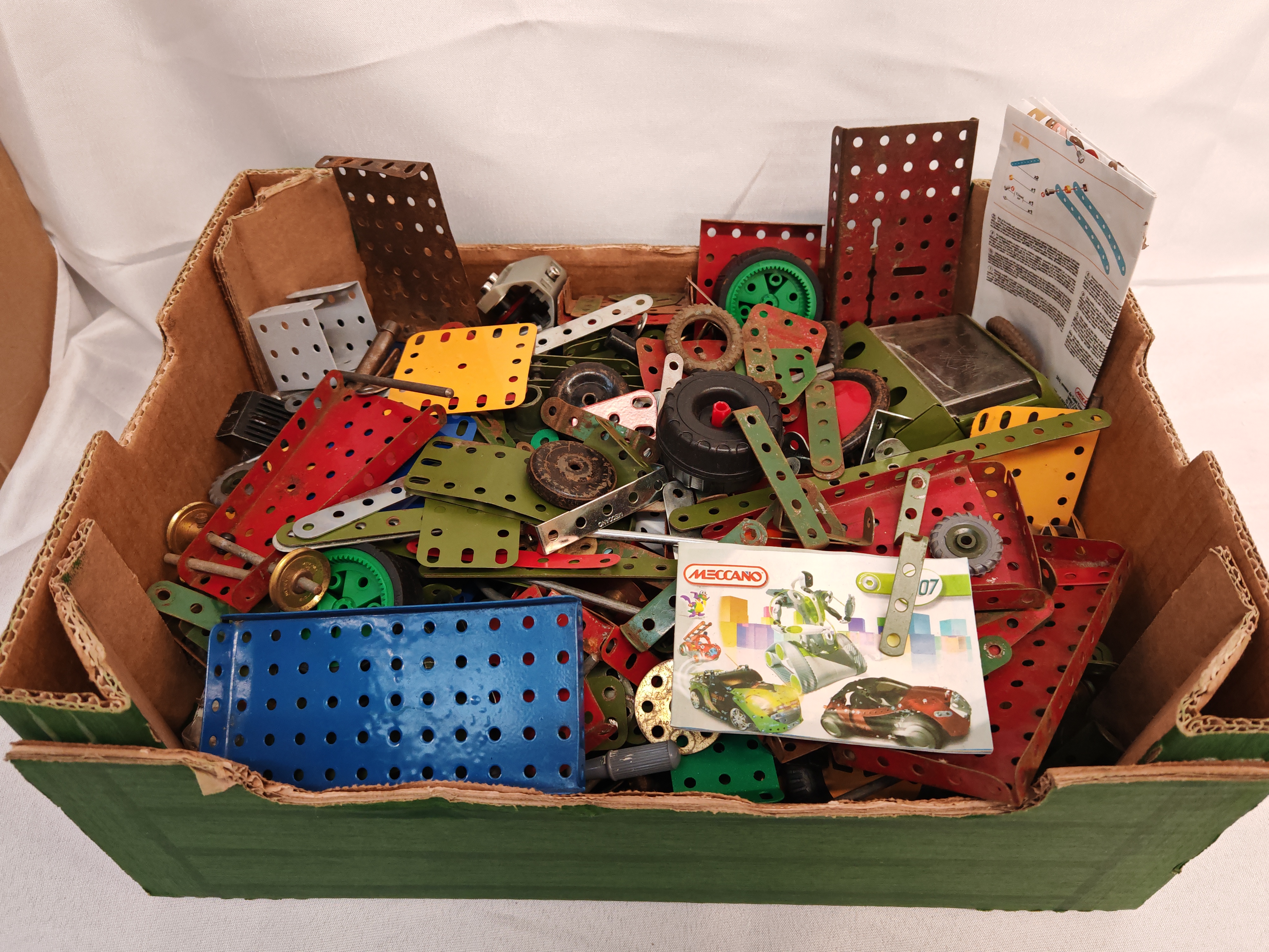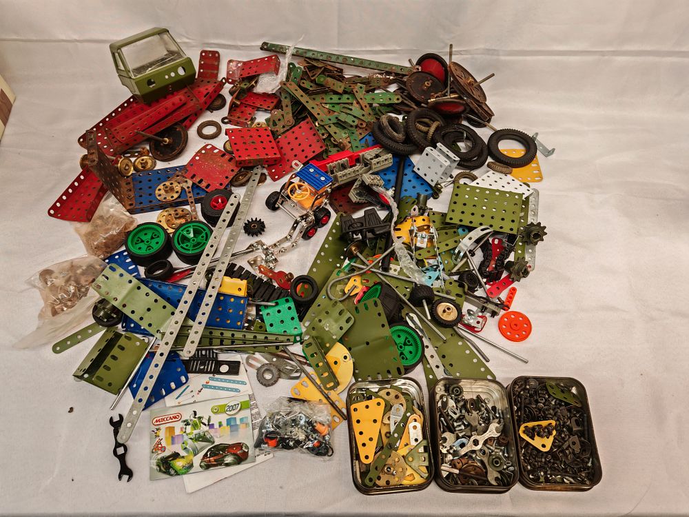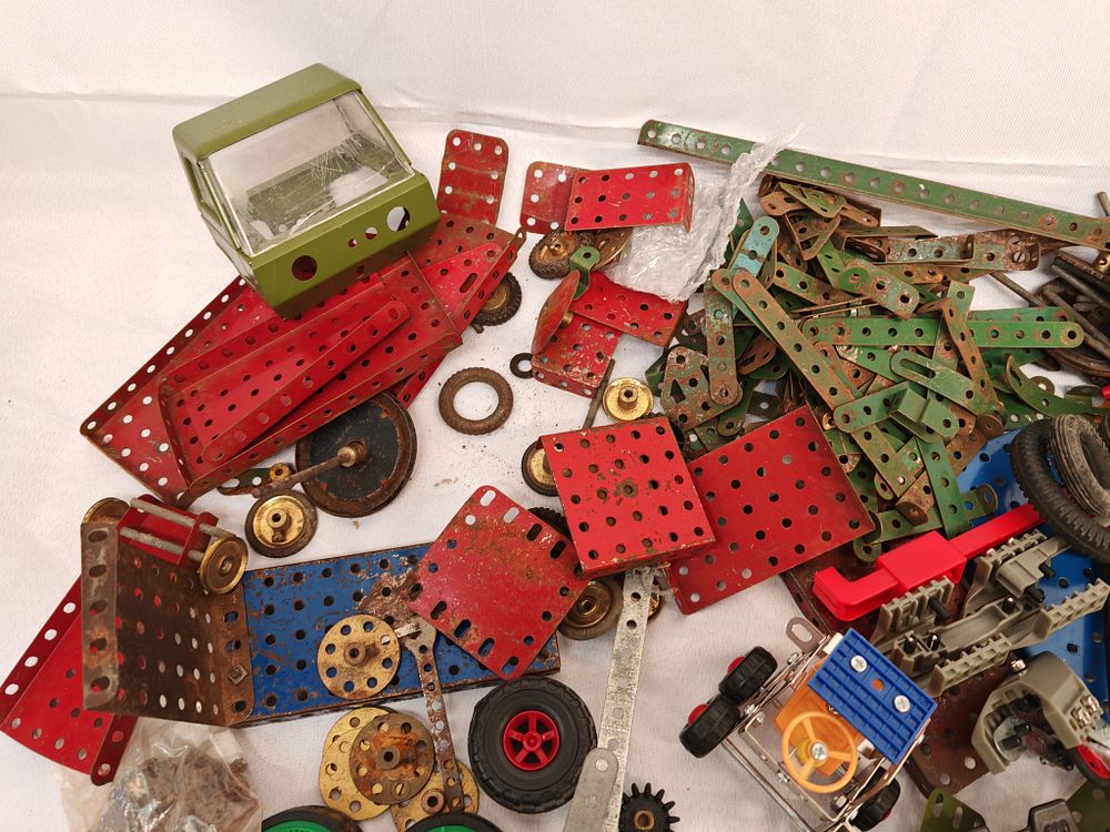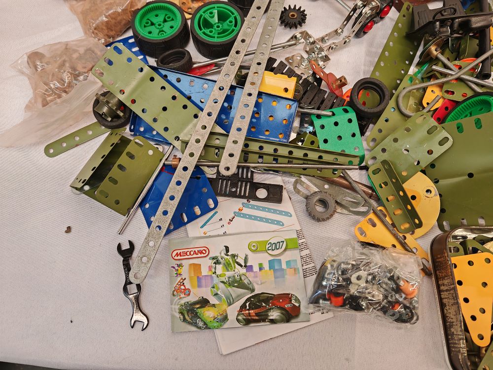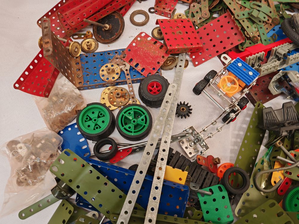 Manufacturer: Meccano. Model: Mixed construction components from various periods and sets. Serial: N/A. Capacity: Large bulk lot of assorted components; approximate piece count not verified. Features: This collection consists of a versatile metal-based construction system with a wide variety of perforated metal strips, plates, and brackets in multiple finishes including red, green, blue, yellow, and galvanised steel. The lot includes various mechanical parts such as wheels, rubber tyres, gears, and drive components. Also included is a small Meccano instruction booklet and supplementary assembly diagrams. The collection features vintage-style metal plates alongside more modern plastic-accented pieces. Energy rating: Not applicable. Dimensions: 40cm x 30cm x 15cm.