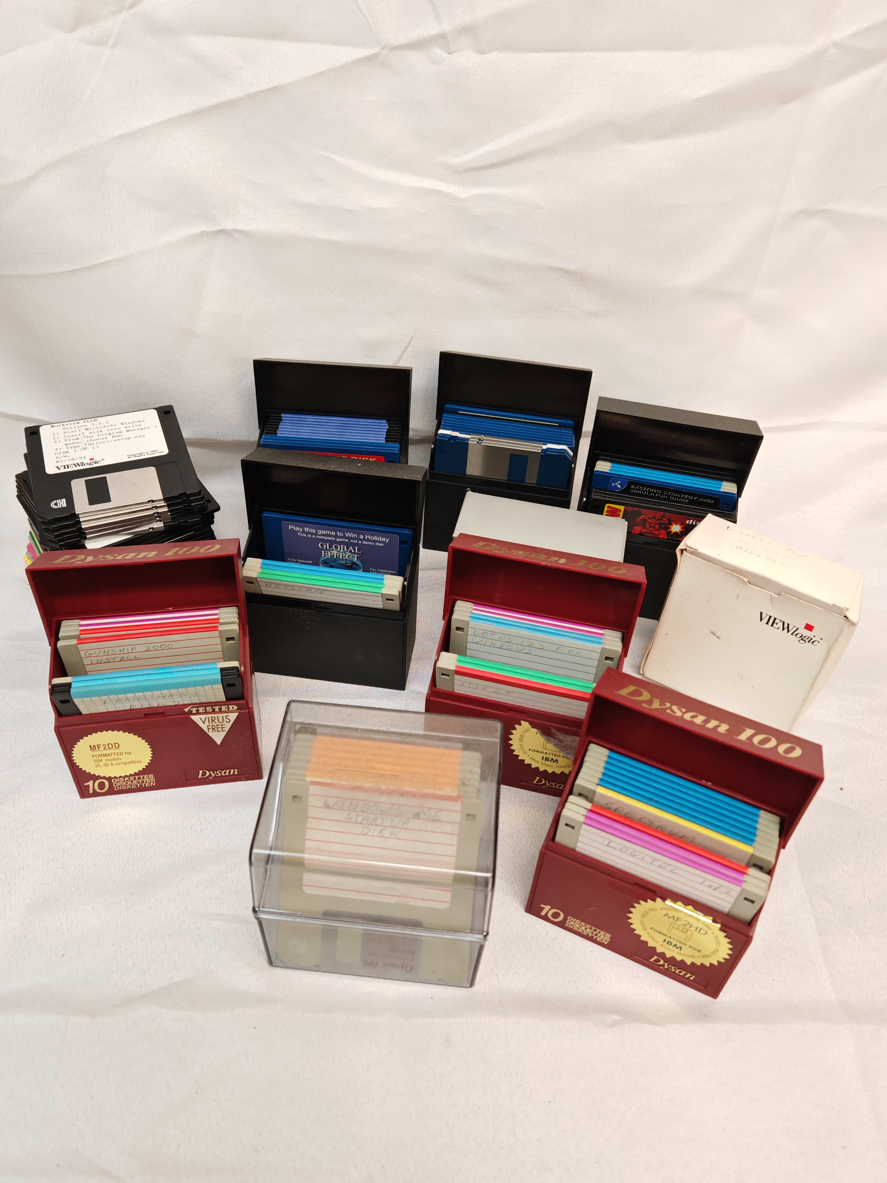 This lot consists of a substantial collection of 3.5-inch floppy disks, including both MF2DD and MF2HD formats. The collection is organised into ten distinct groupings: three red Dysan 100 storage boxes, four black plastic flip-top cases, one clear acrylic storage cube, one white VIEWlogic branded cardboard box, and a loose stack of approximately 10-12 disks. The media includes a mix of commercial software and handwritten user disks. Identifiable titles include VIEWlogic, Global Effect, Gunship 2000, Lotus 1-2-3 for Windows, Netscape, and a Windows ME Startup Disk.