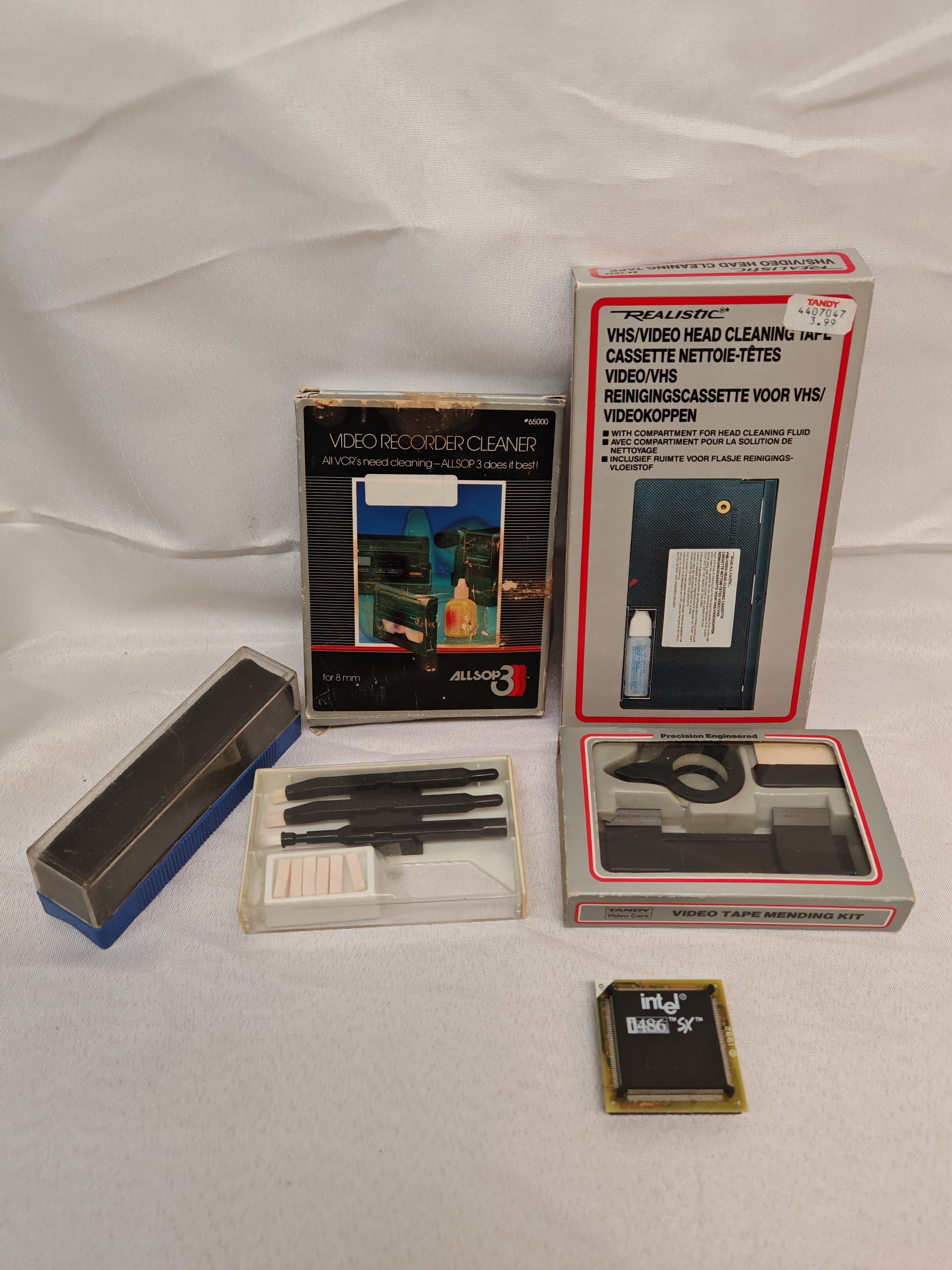 A comprehensive collection of vintage media maintenance equipment and computing hardware from the late 20th century. The lot features a Realistic VHS/Video Head Cleaning Tape (model 44-7047) with trilingual packaging in English, French, and Dutch, originally retailed through Tandy. Also included is an Allsop 3 Video Recorder Cleaner specifically designed for 8mm VCR systems (model #65000) and a Tandy Precision Engineered Video Tape Mending Kit housed in a grey cardboard box. The collection is further augmented by two auxiliary cleaning kits housed in blue-based plastic cases containing various swabs and applicators. Accompanying the maintenance gear is a loose Intel i486 SX microprocessor, a pivotal component of early 1990s computing. These items represent the essential toolkit for the home video enthusiast and computer hobbyist of the era.